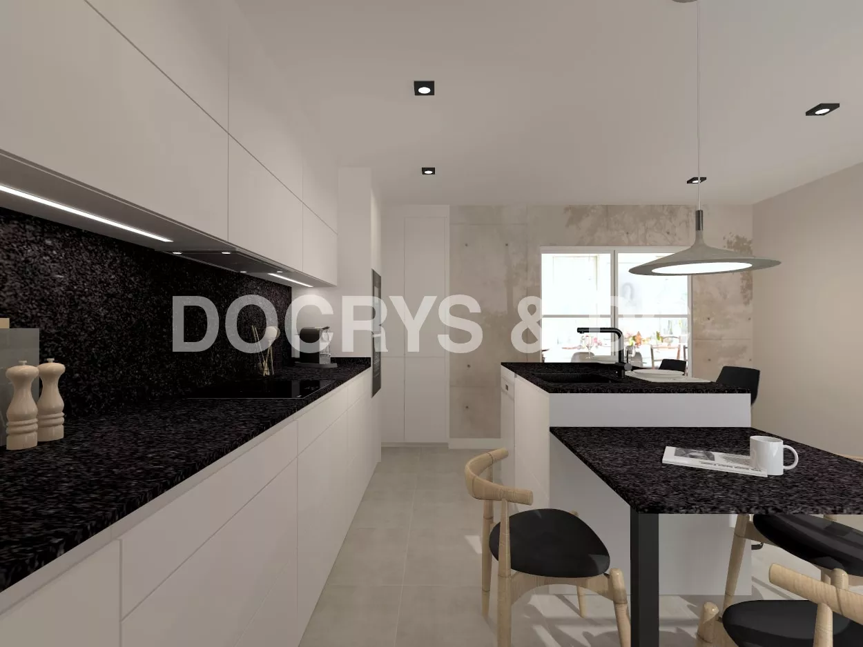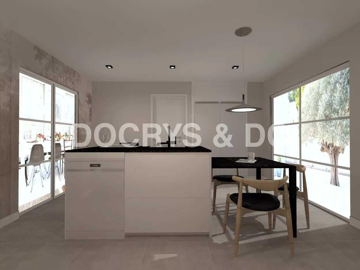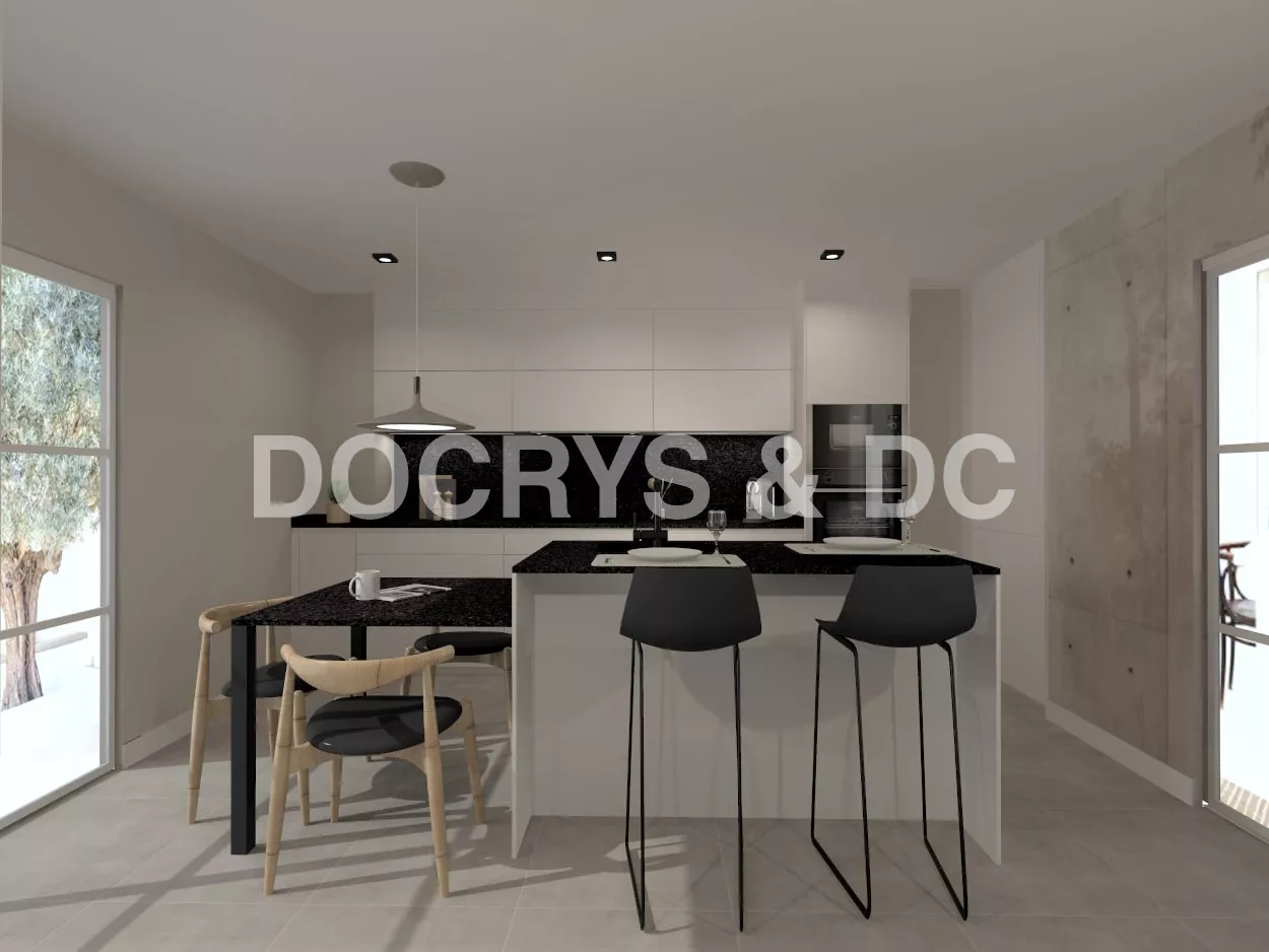 Esta cocina se ubica en una estancia de 12m2 y su distribución cuenta con isla central con mesa de office y barra y un frente.