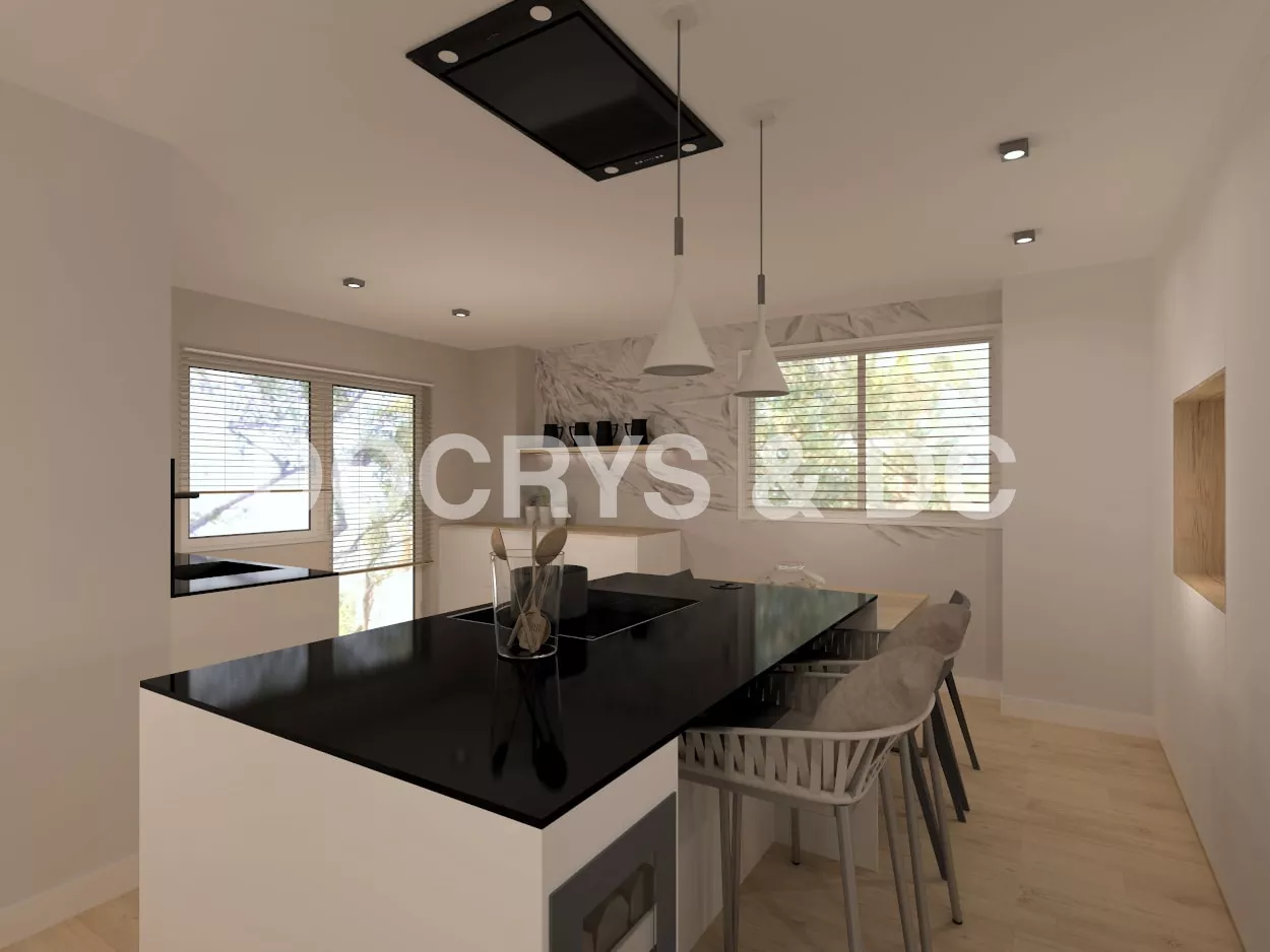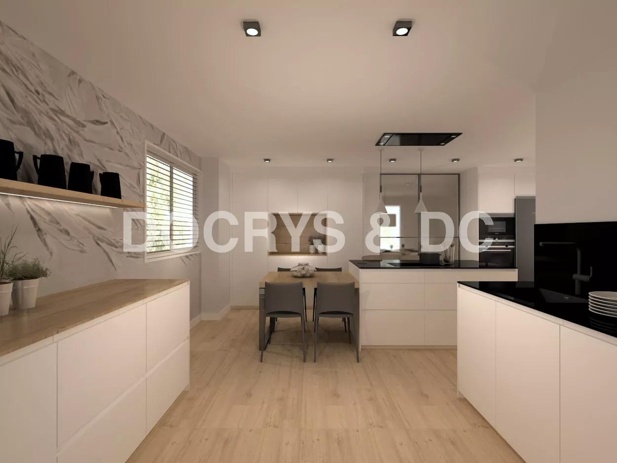 Por otro lado, una isla central, donde se ubica la zona de cocción, más módulos bajos de almacenamiento, una barra y una mesa office para cuatro comensales.