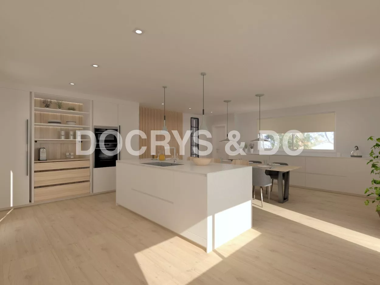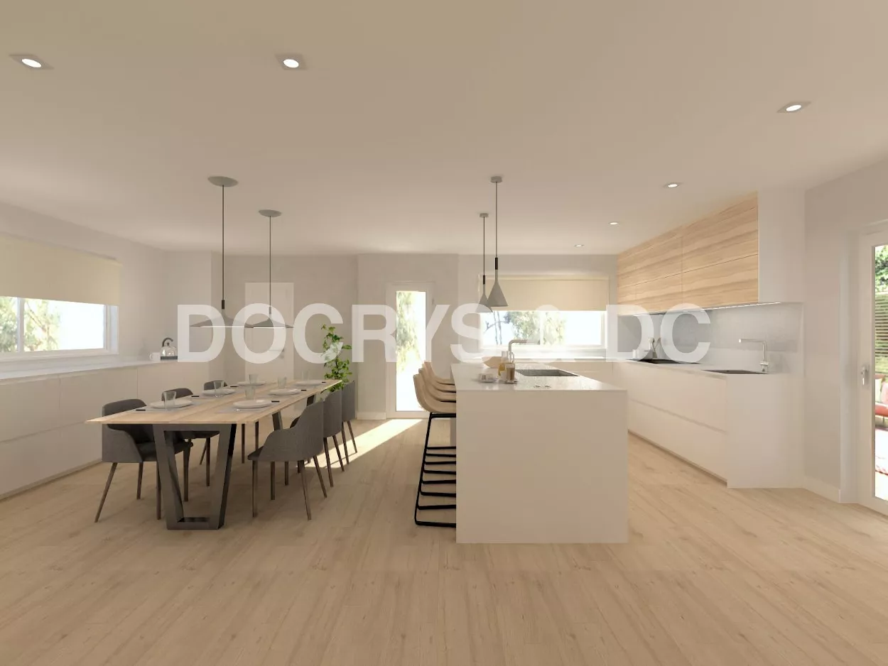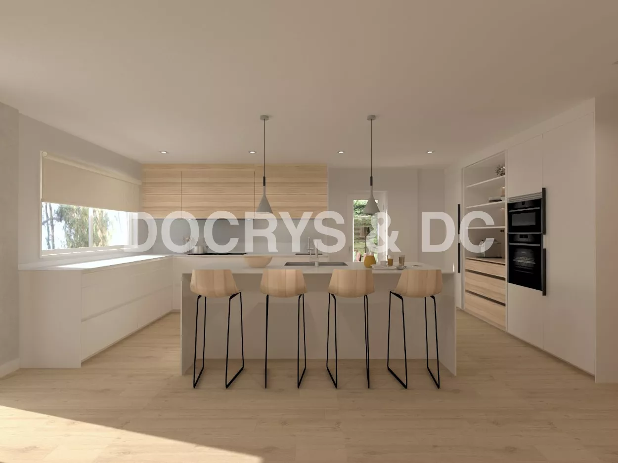 Por último, cuenta con una gran isla central, con muebles bajos, zona de aguas, una extensa zona de trabajo y una barra para cuatro comensales.