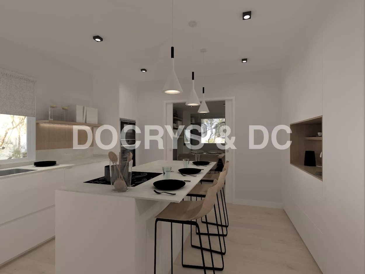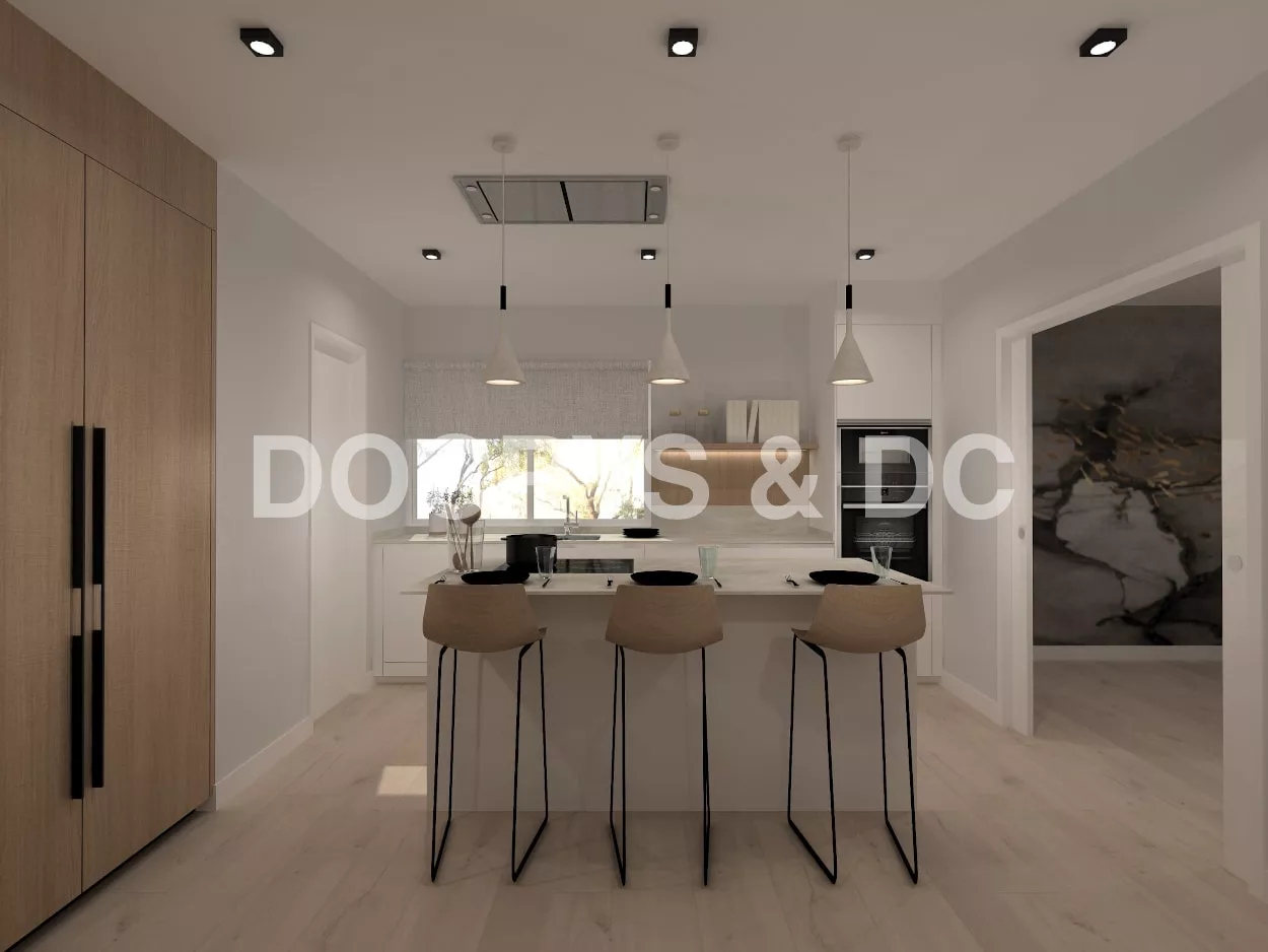 El otro frente, ubicado paralelamente al anterior, lo compone un desayunador y varias columnas.