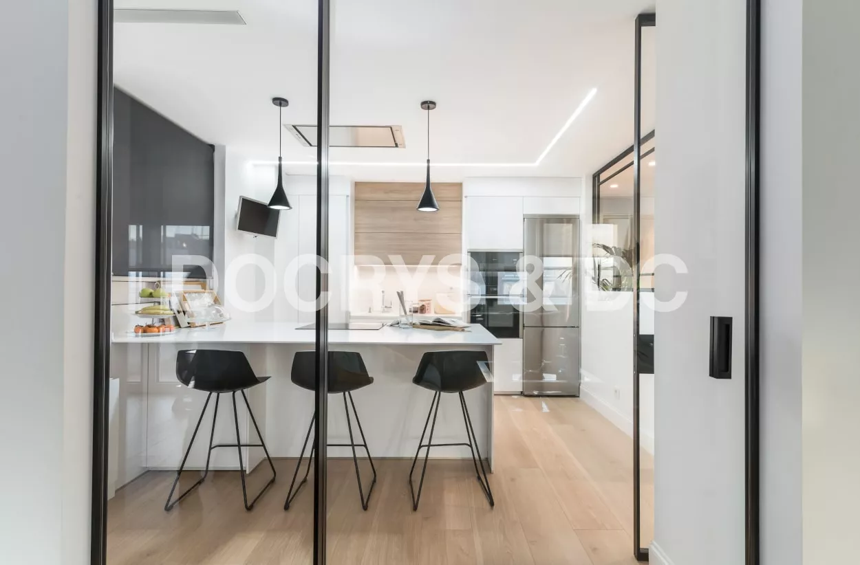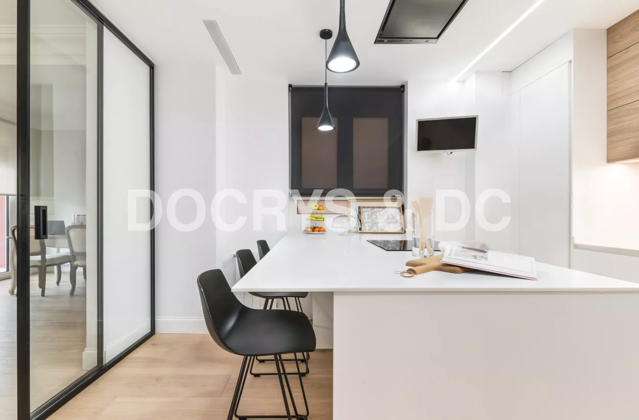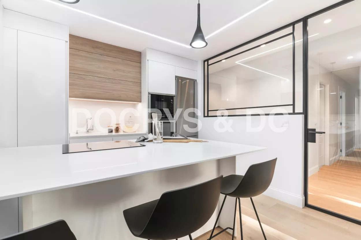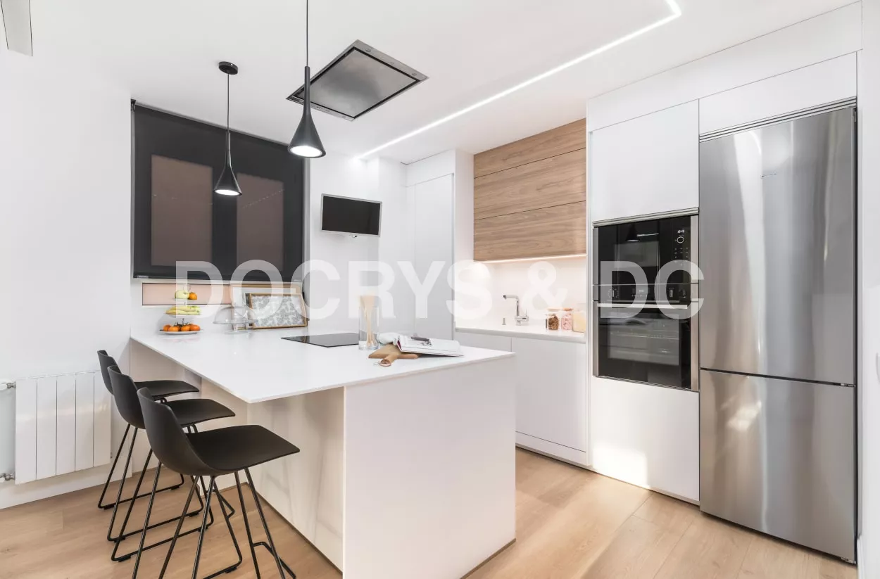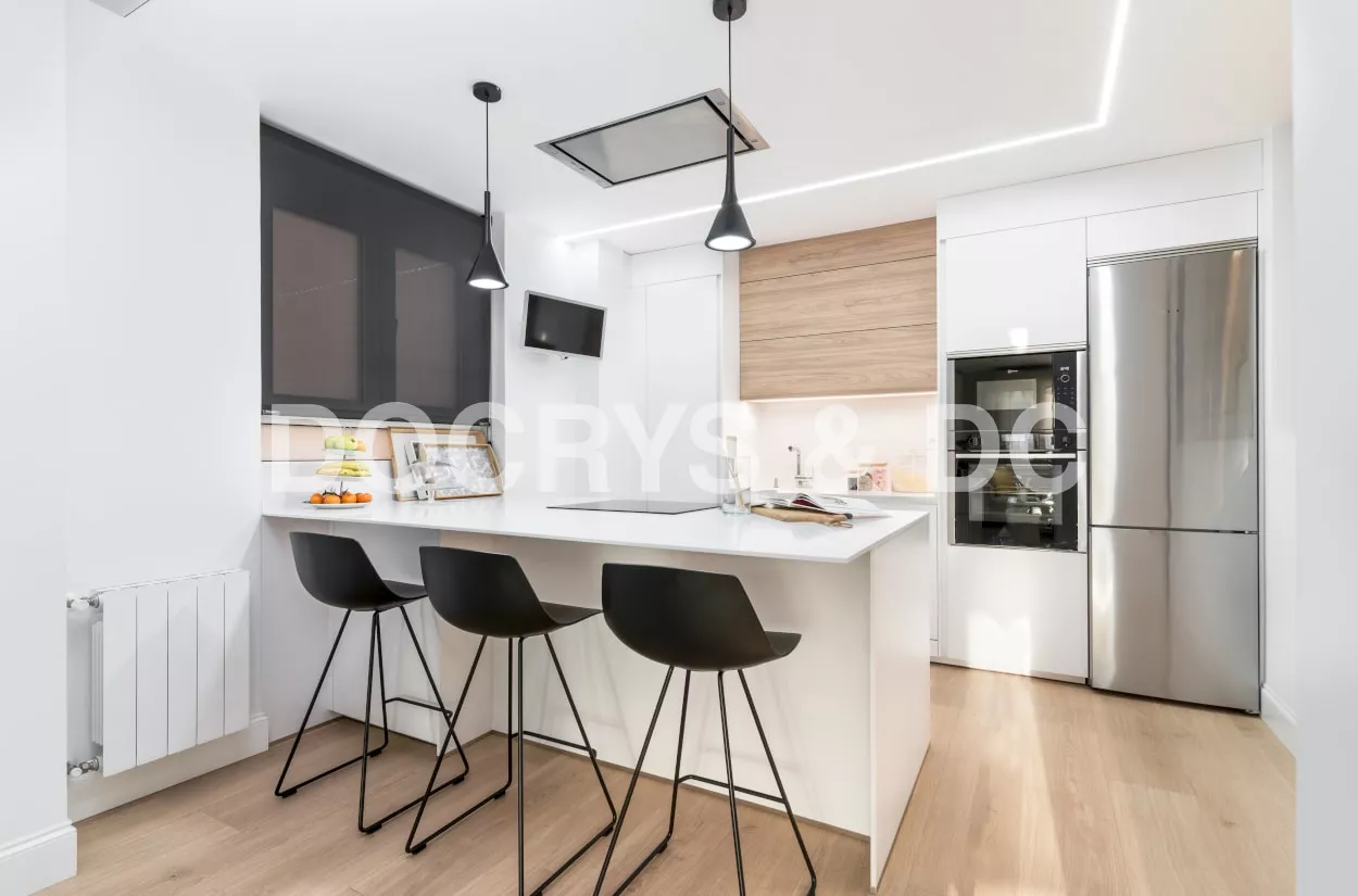 El diseño de esta cocina se integra a la perfección en el espacio y su distribución junto la península, crean un espacio funcional y cómodo para los usuarios de la vivienda.