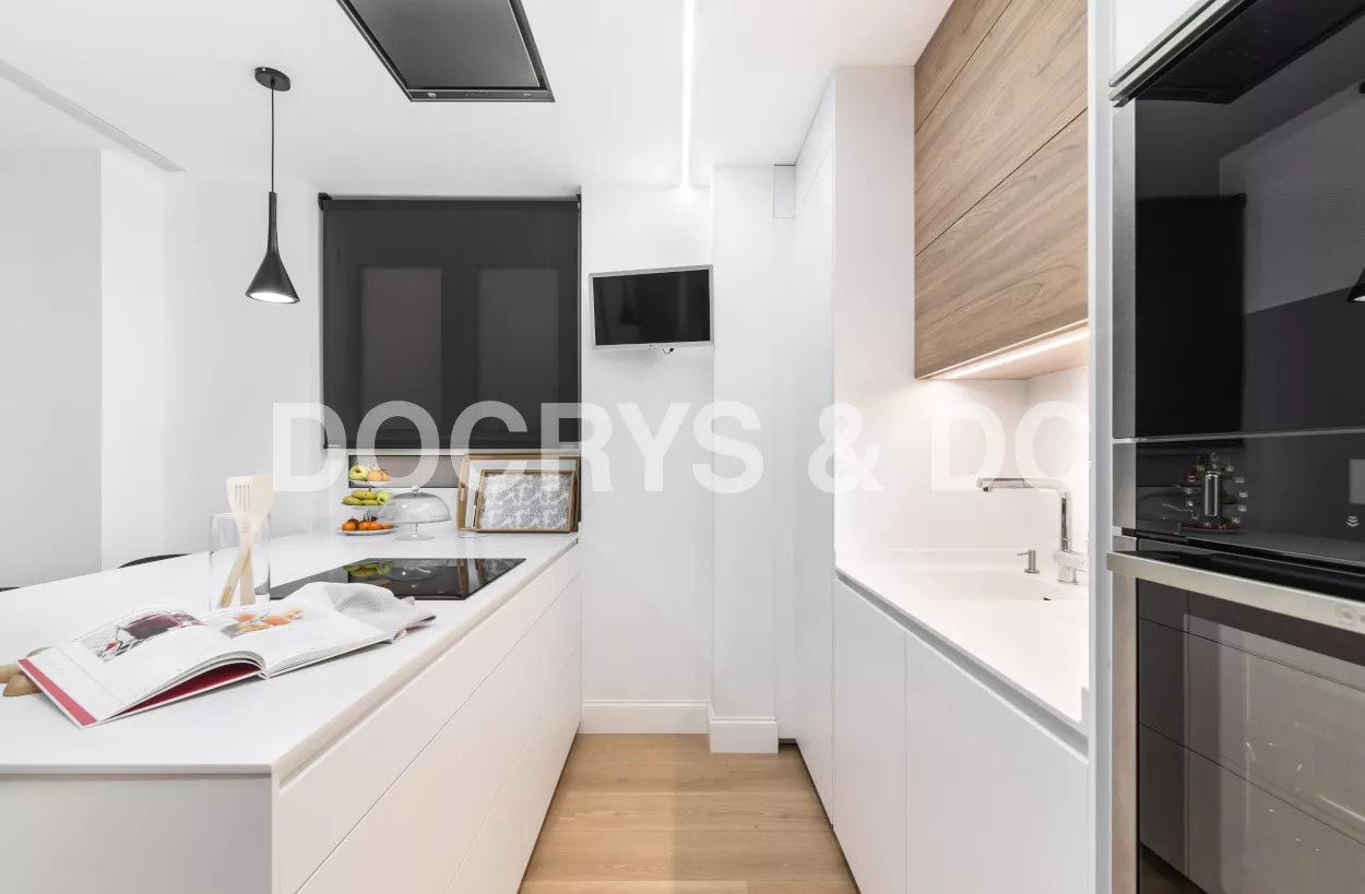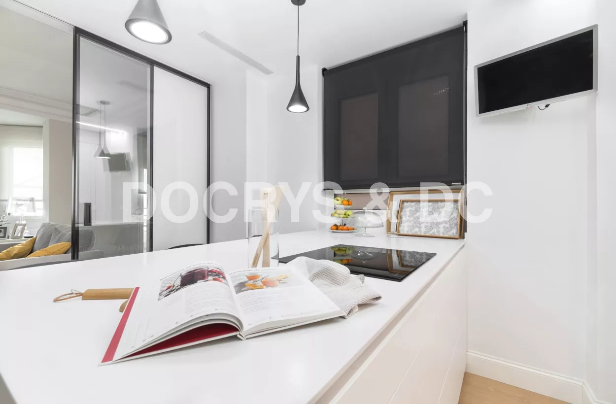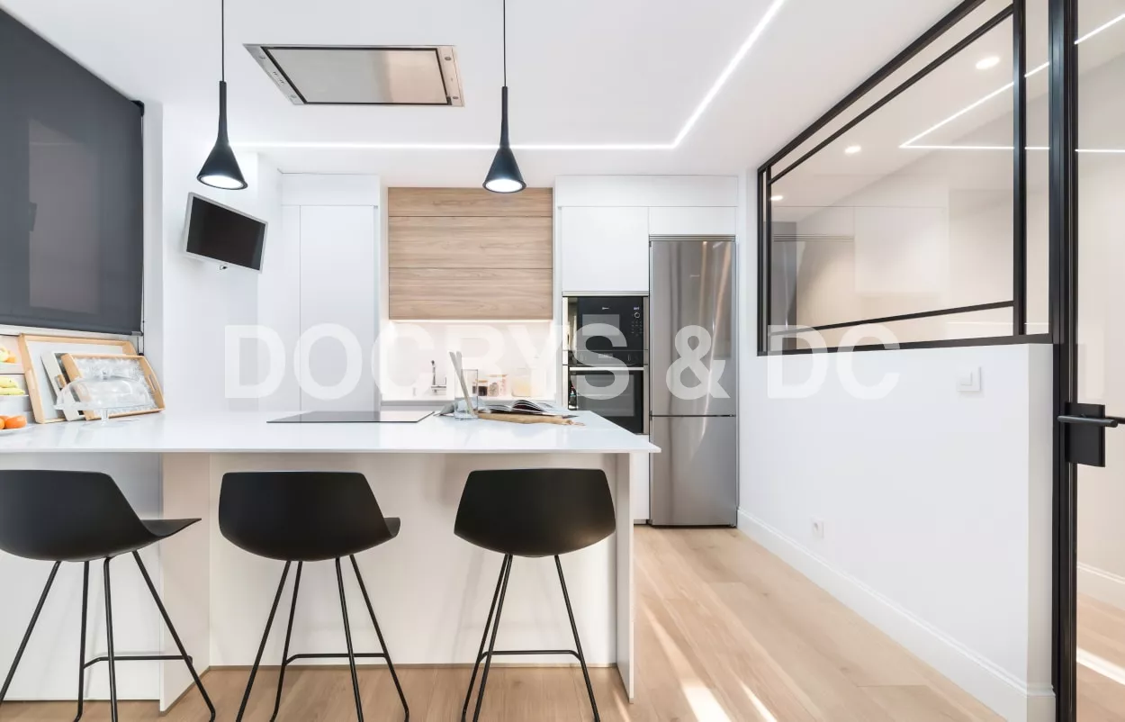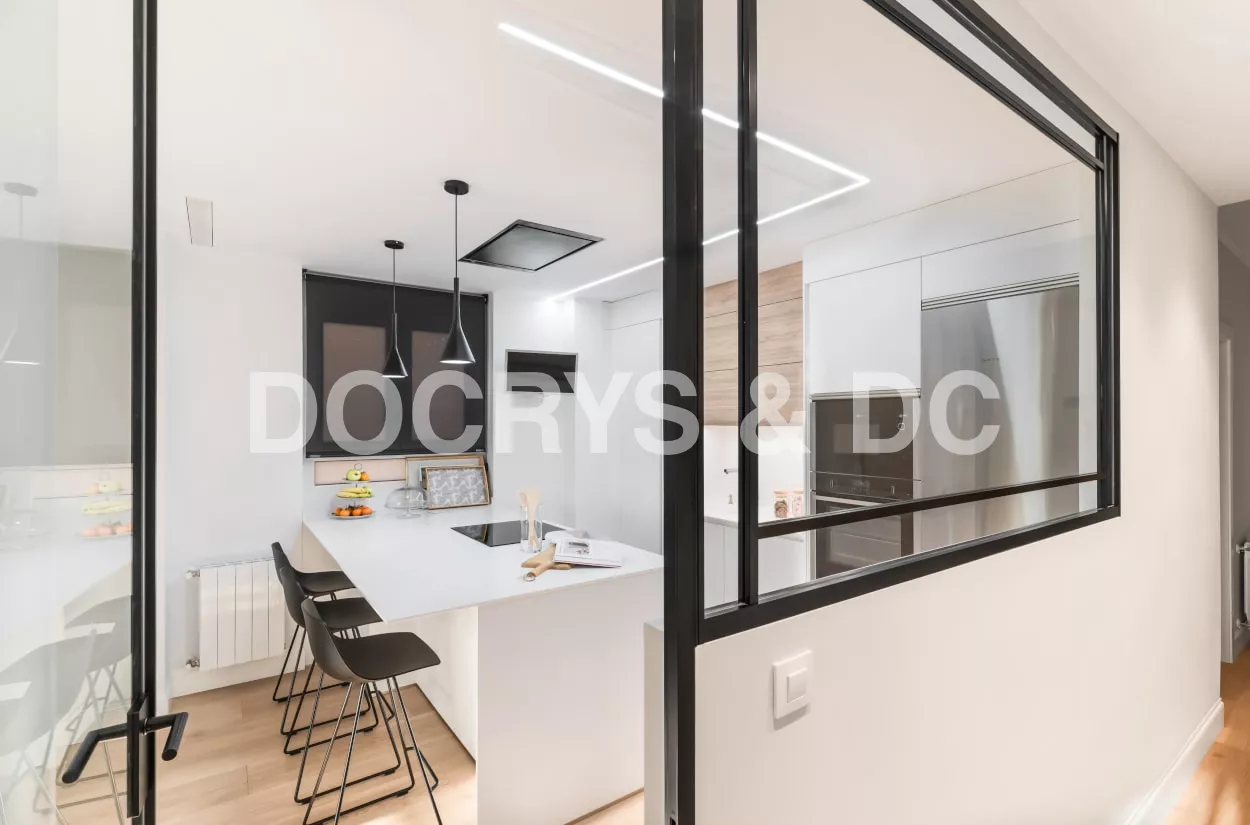 Esta cocina semiabierta al salón, es el centro de la vivienda y punto de reunión de la familia, luminosa, atemporal y muy acogedora.