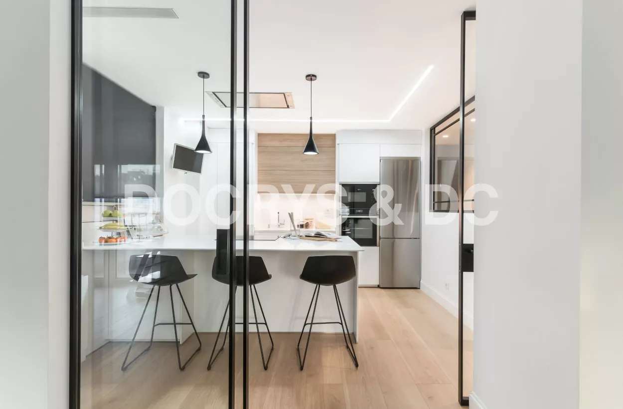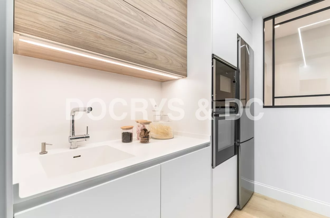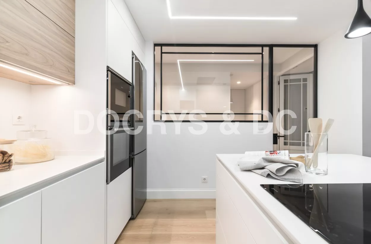 Esta cocina semiabierta al salón, es el centro de la vivienda y punto de reunión de la familia, luminosa, atemporal y muy acogedora.