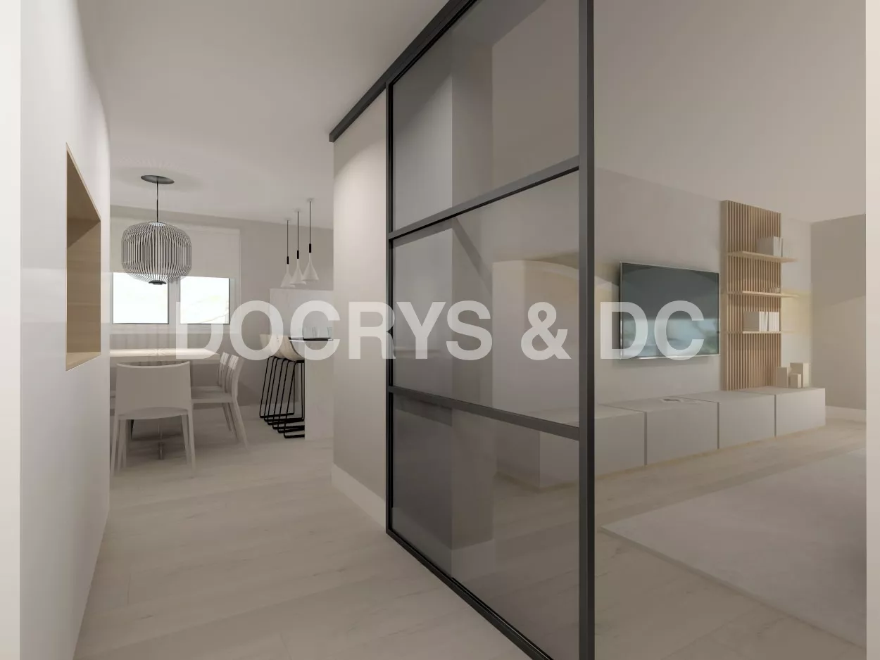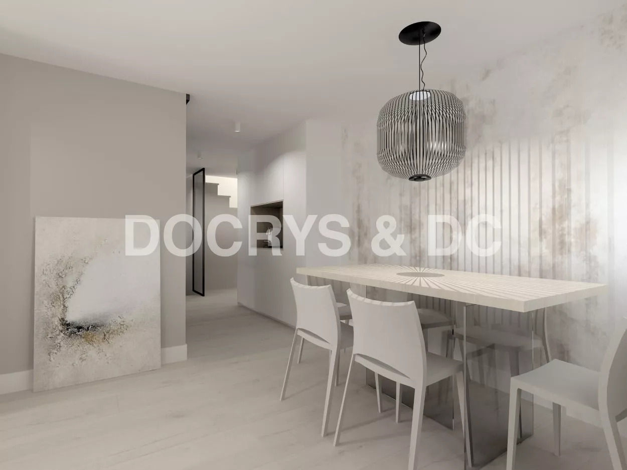 Por último, un pequeño office para cuatro comensales frente a una pared con papel pintado iluminada con una lámpara colgante.