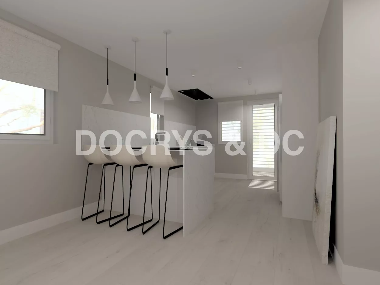 Además, de este frente, se extiende de la encimera una barra volada para tres comensales.