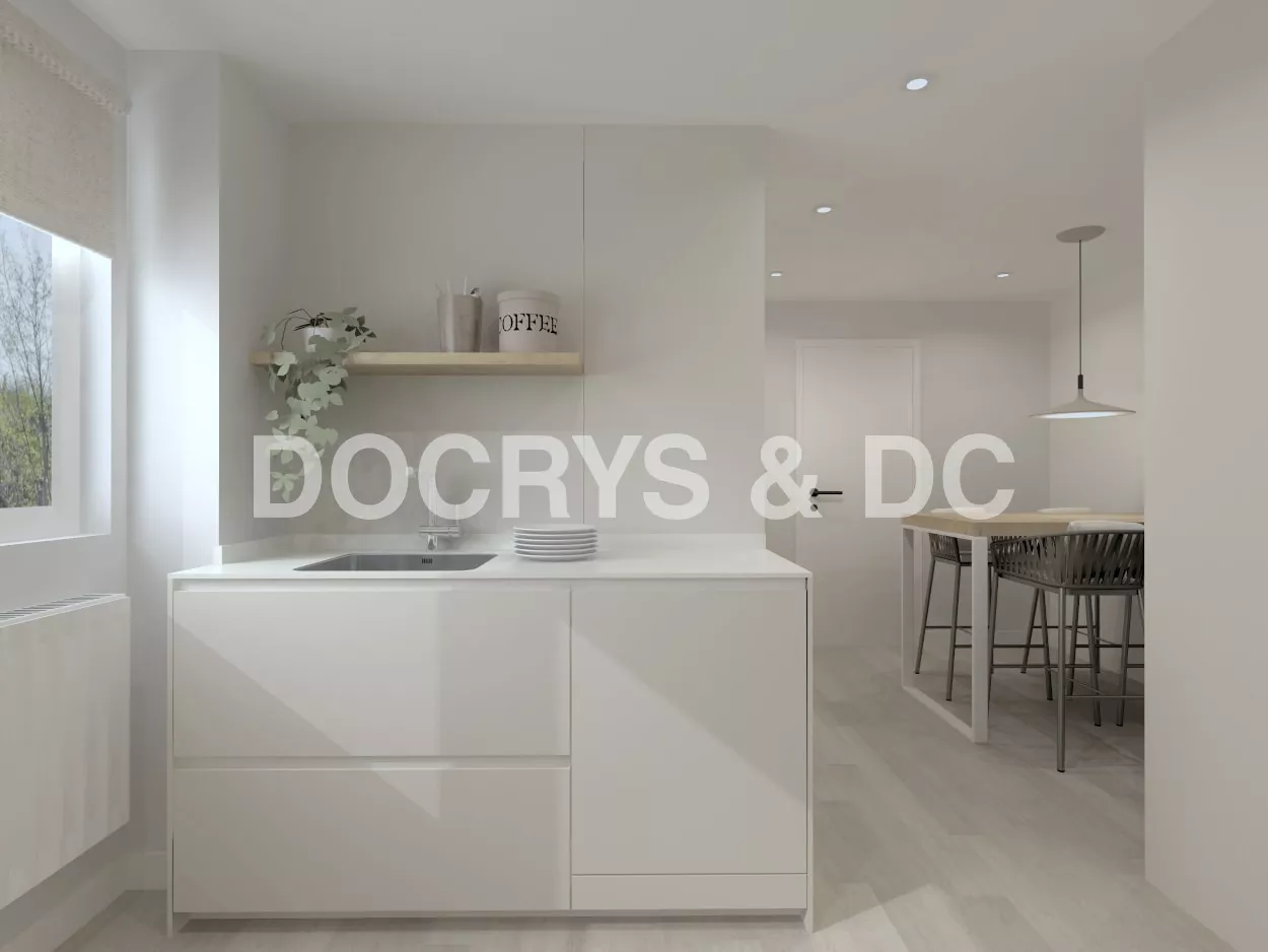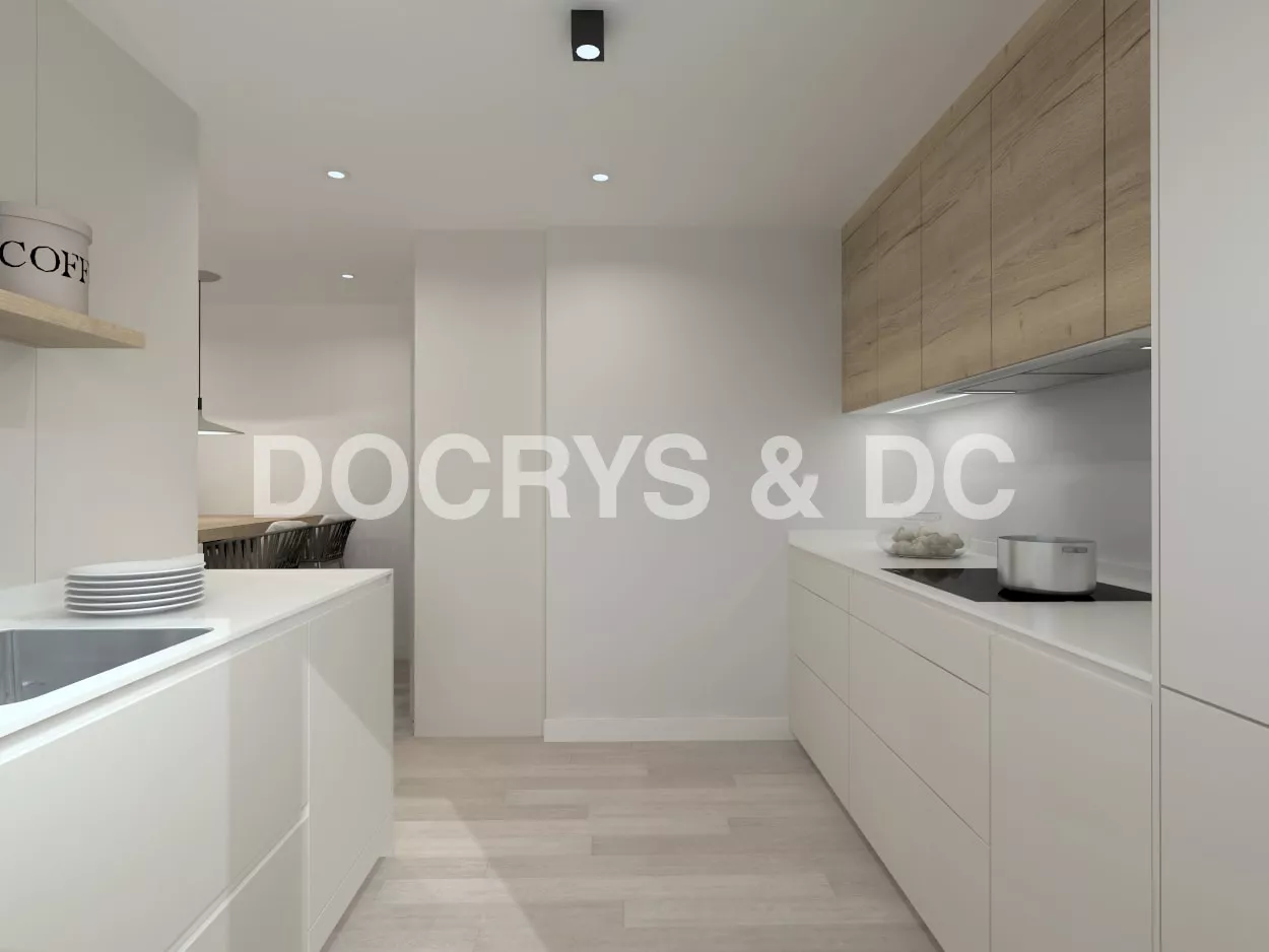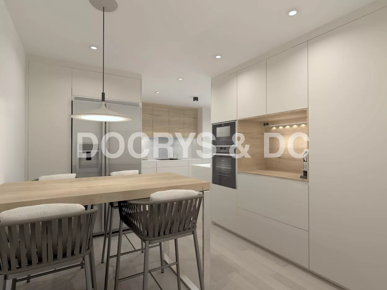 Por otro lado, otro frente compuesto por un desayunador, columnas y muebles bajos, ampliando así la capacidad de almacenaje.