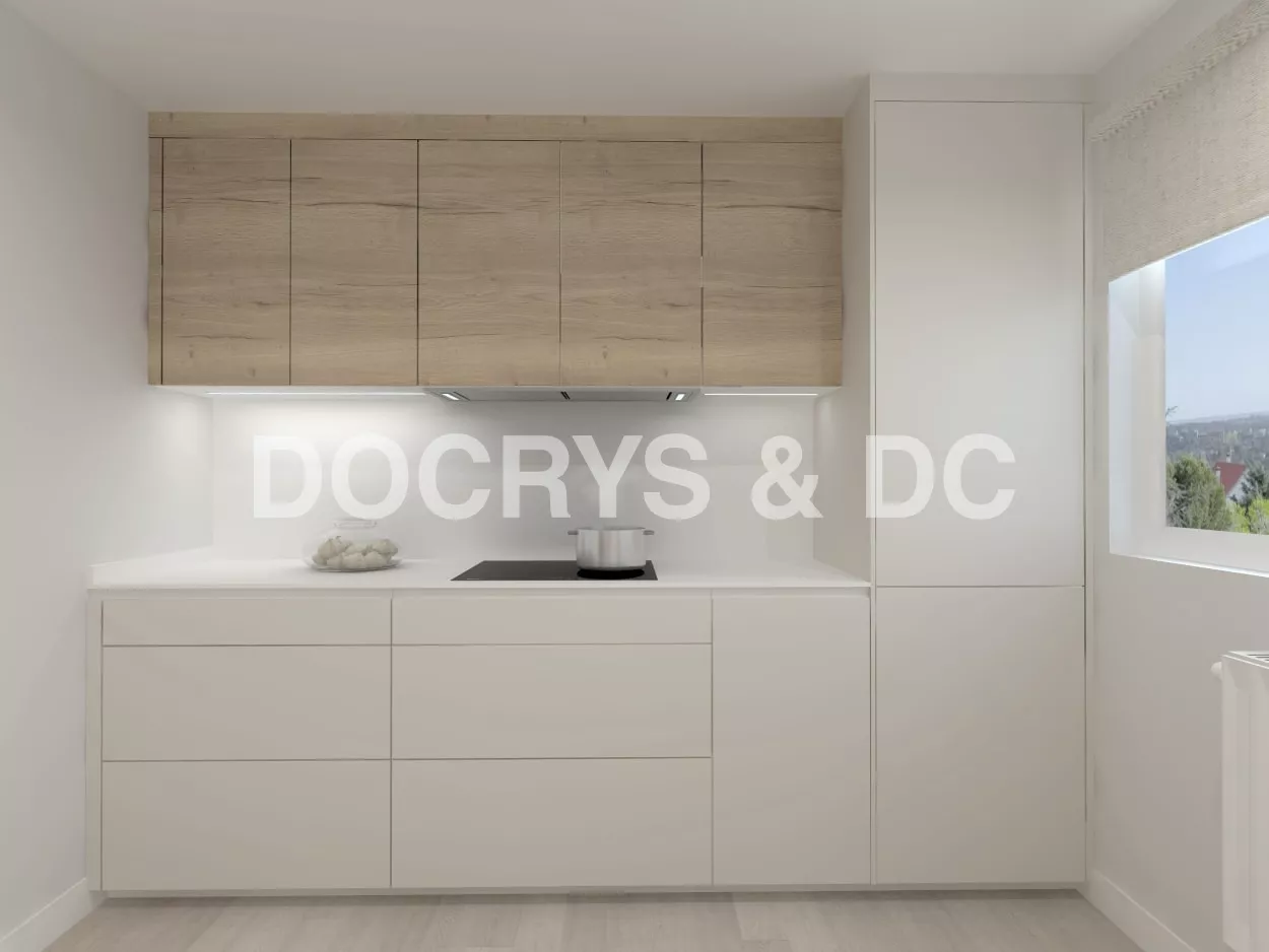 Diseño de cocina Santos en color Blanco perla con material estratificado y laminado madera con encimera de Ascale en color Croma white, acabado mate.