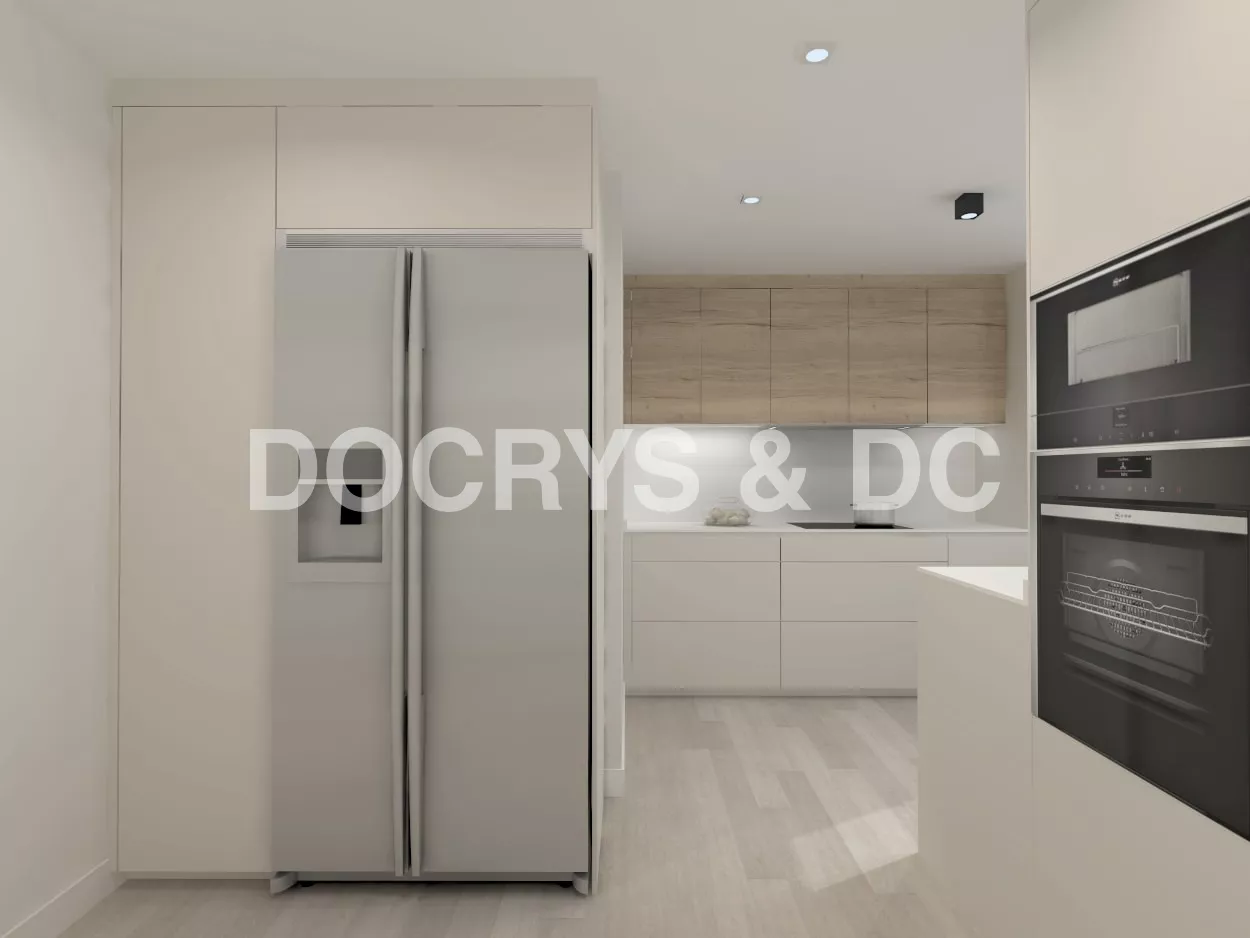 La combinación del blanco perla con el roble rústico, hacen de esta cocina moderna, un espacio atemporal y elegante.