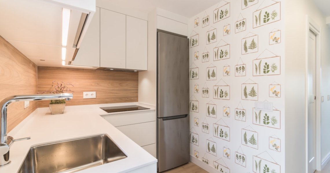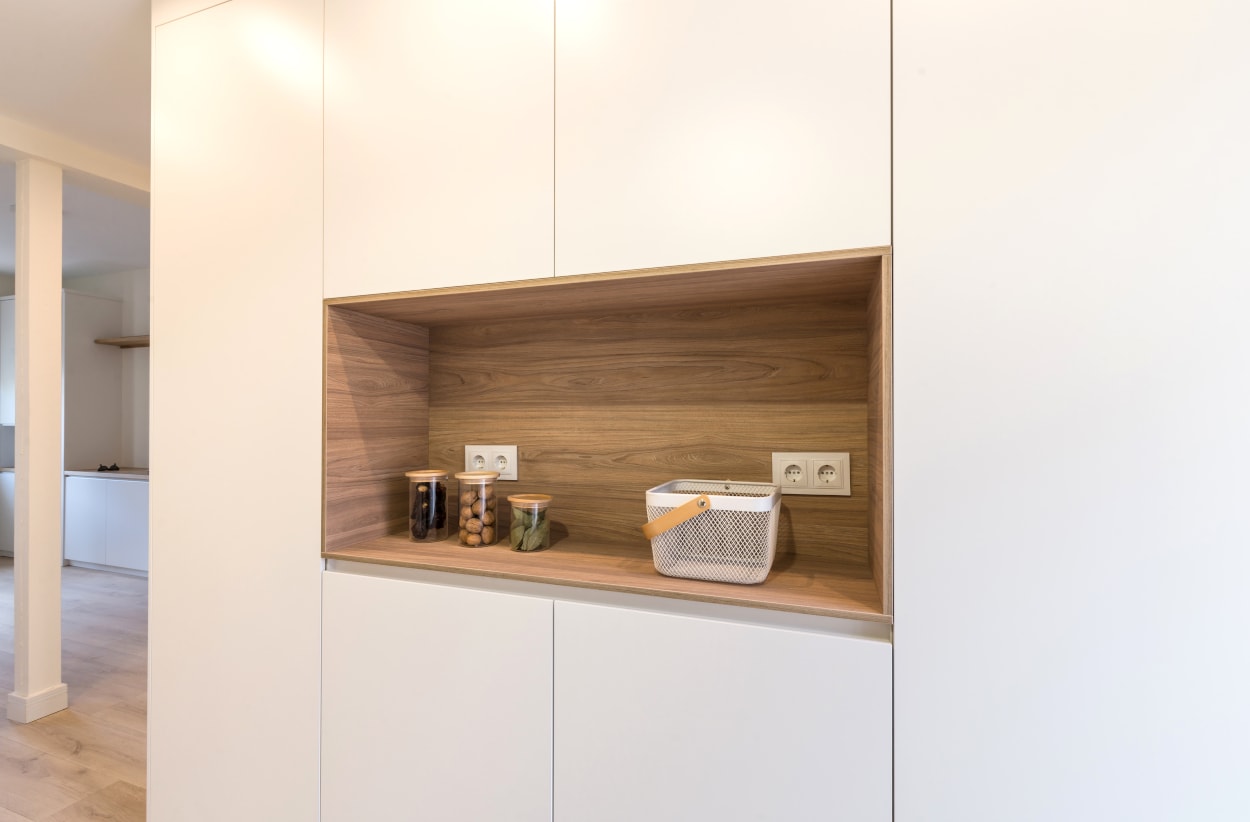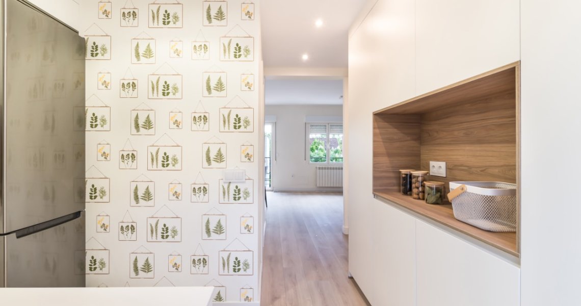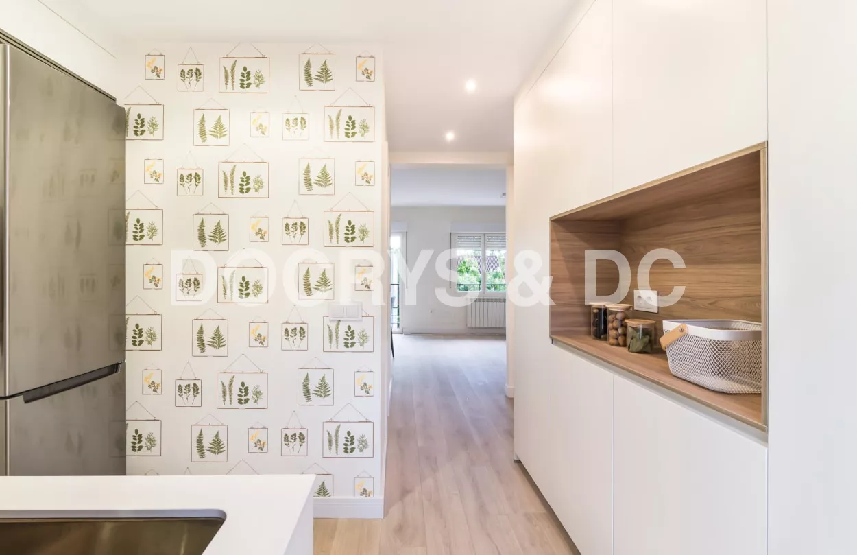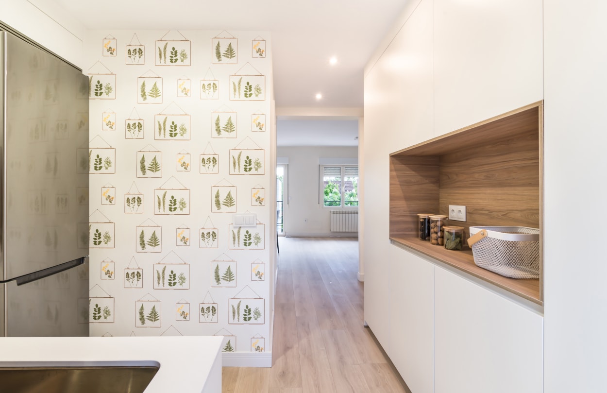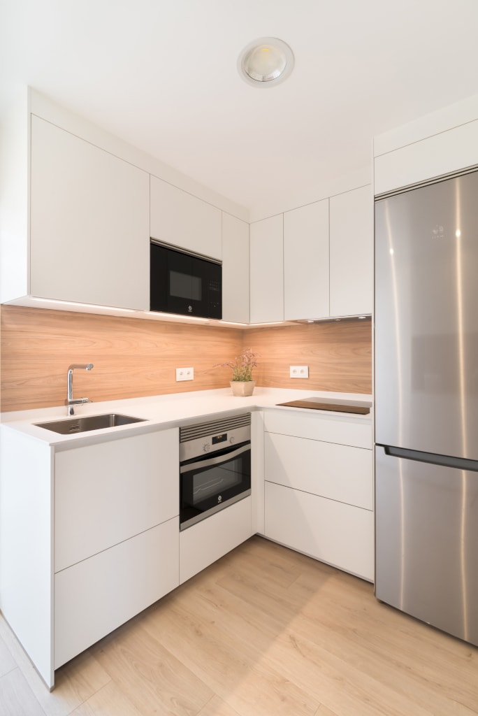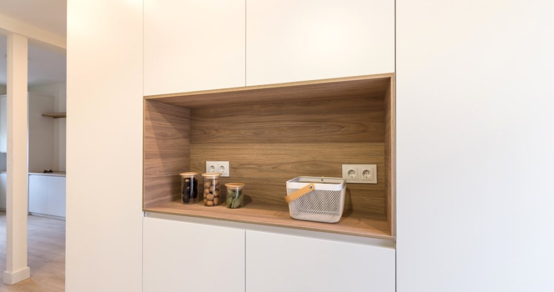 El diseño de esta cocina moderna en color blanco seff y olmo claro, se fusiona con el resto de la vivienda, creando un ambiente abierto y luminoso..