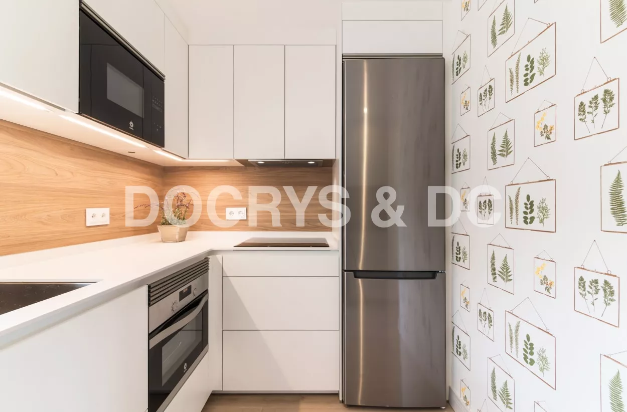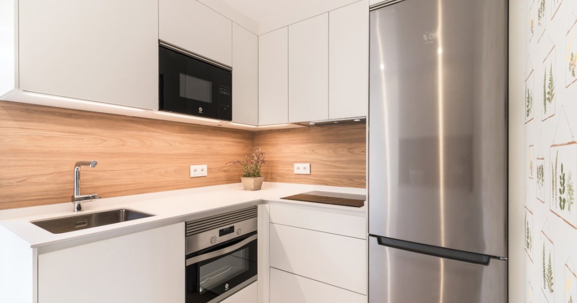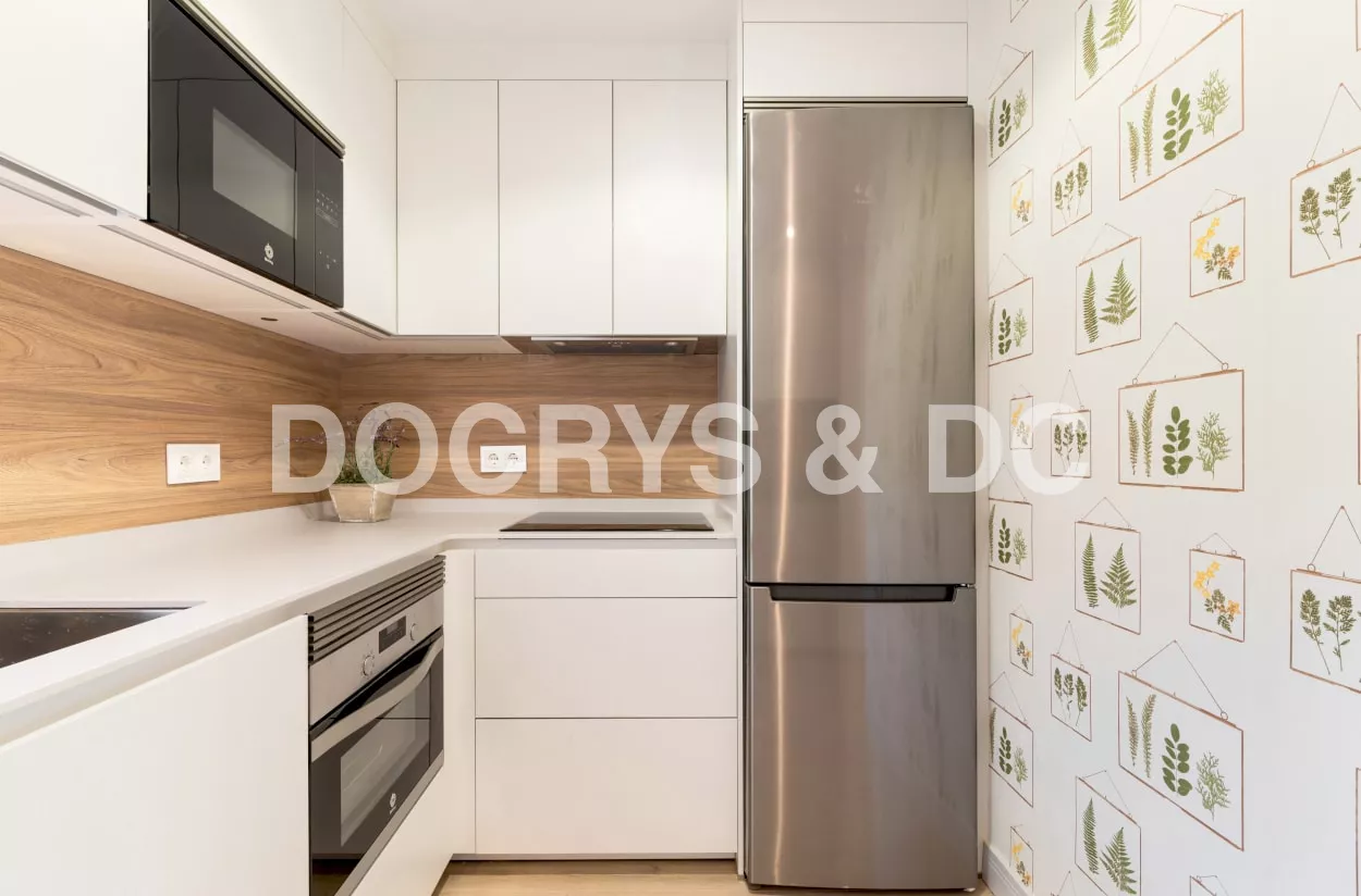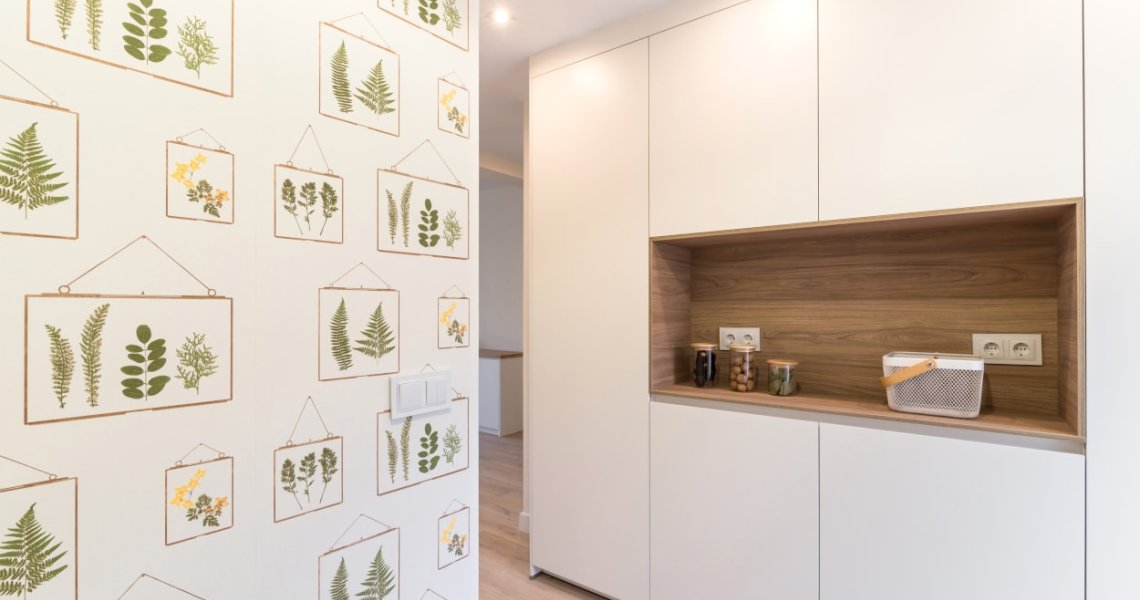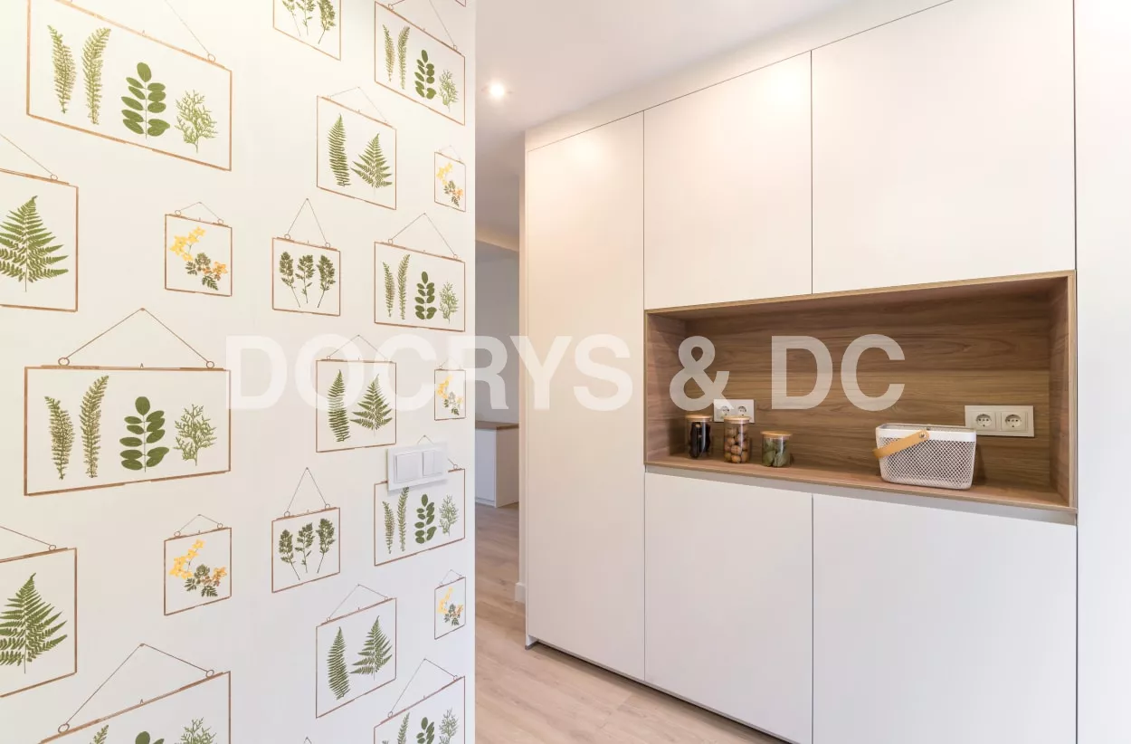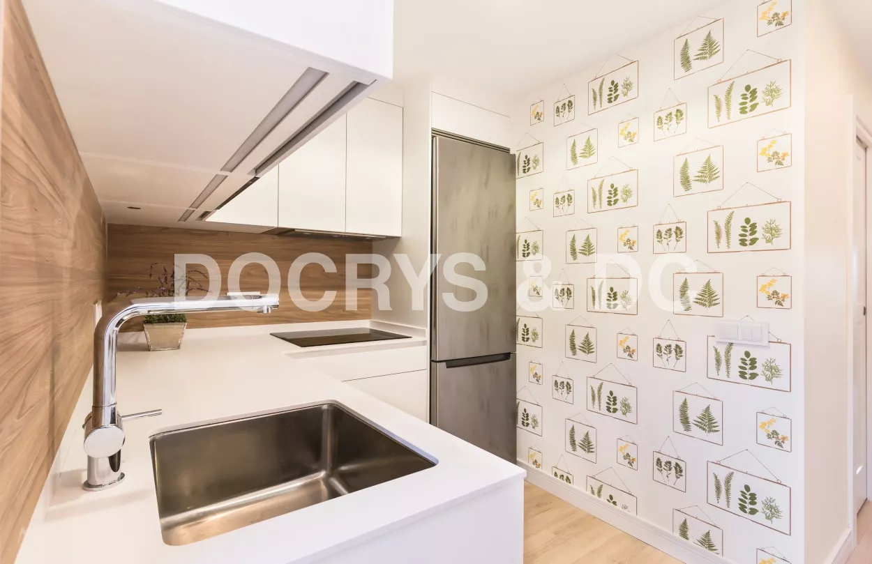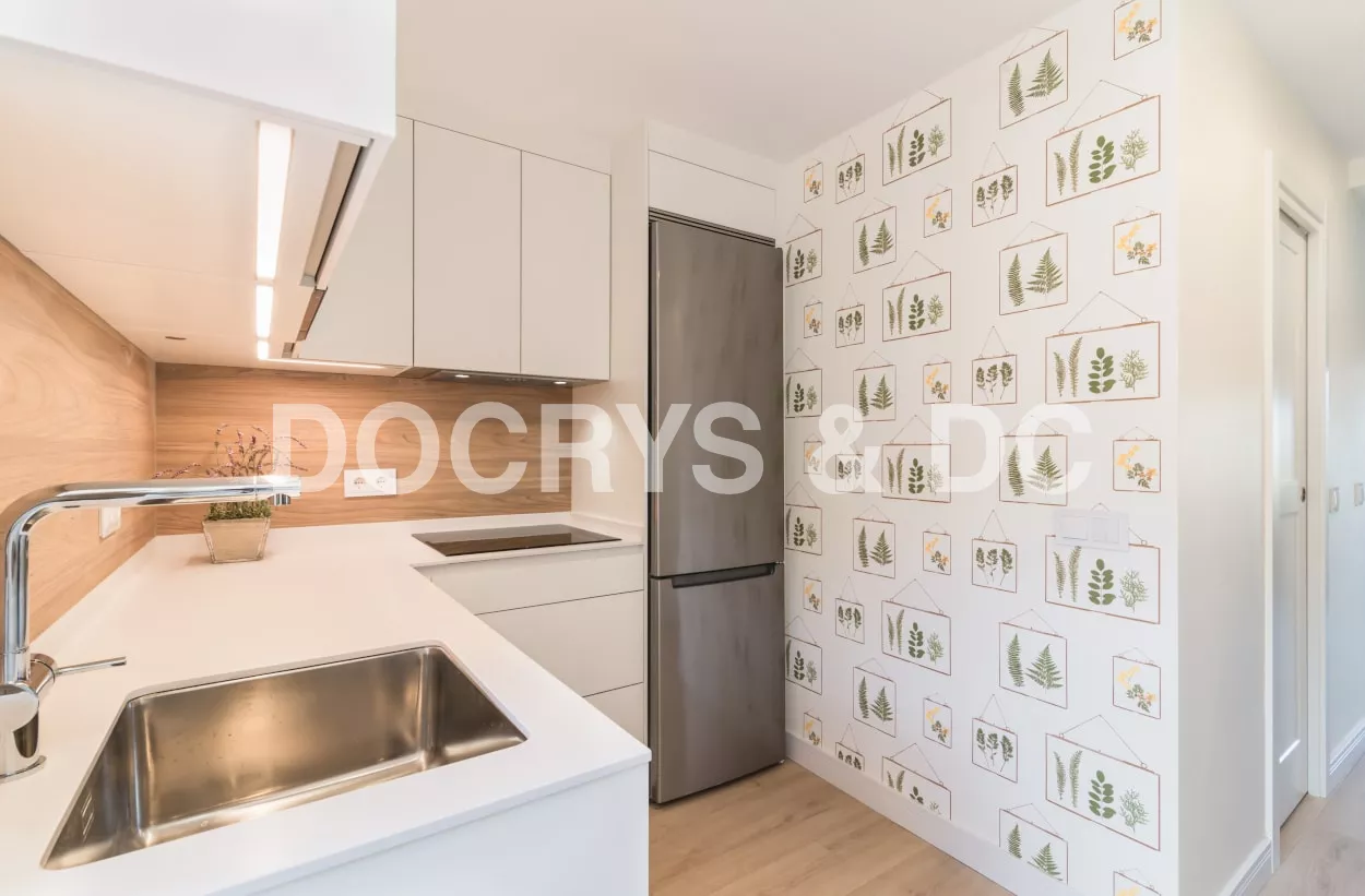 El diseño de esta cocina moderna en color blanco seff y olmo claro, se fusiona con el resto de la vivienda, creando un ambiente abierto y luminoso..