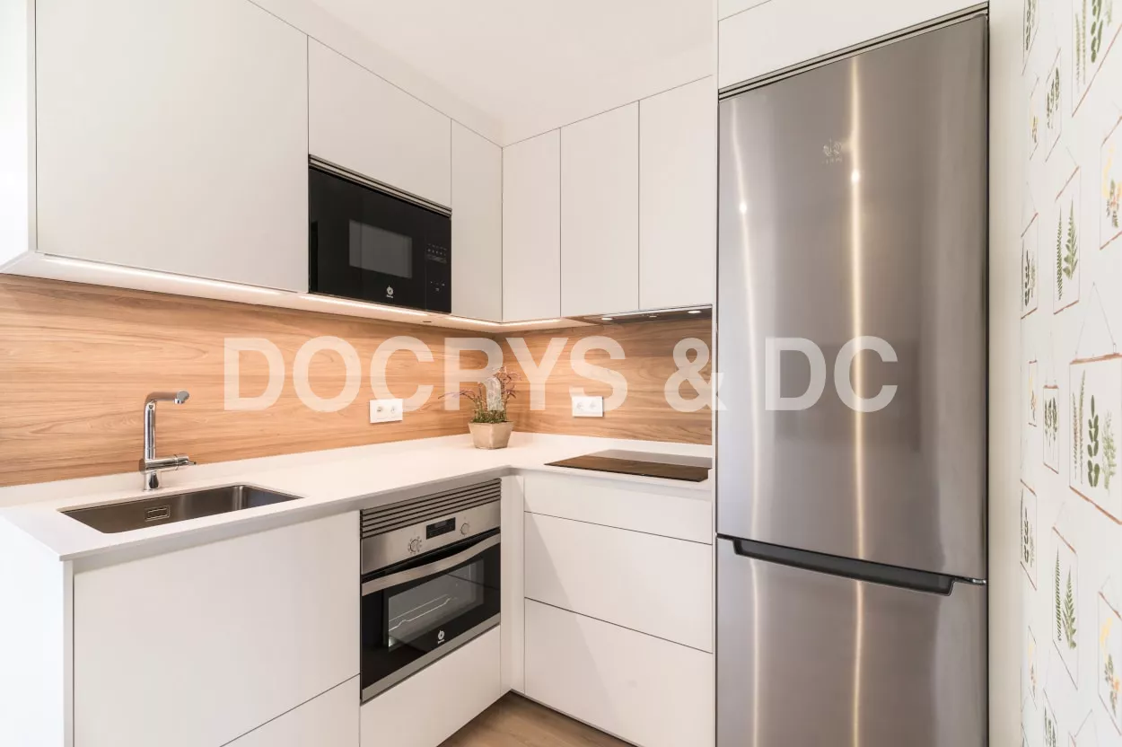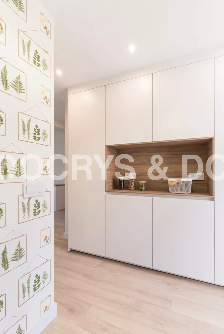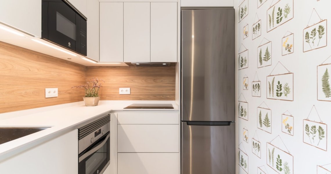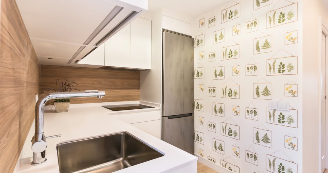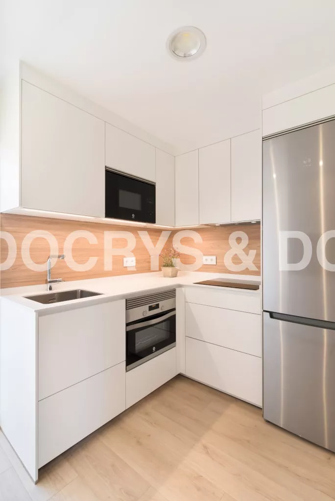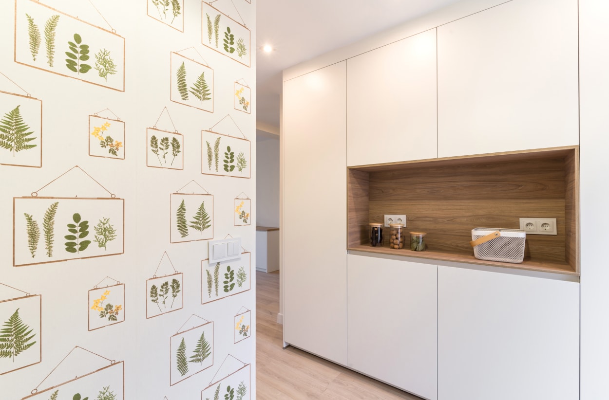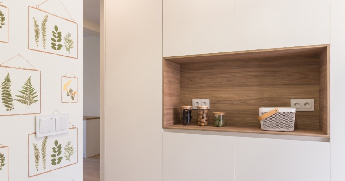 El diseño de esta cocina moderna en color blanco seff y olmo claro, se fusiona con el resto de la vivienda, creando un ambiente abierto y luminoso..