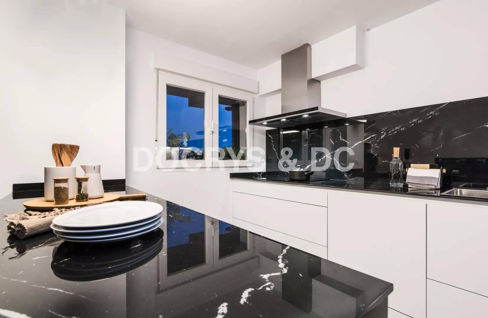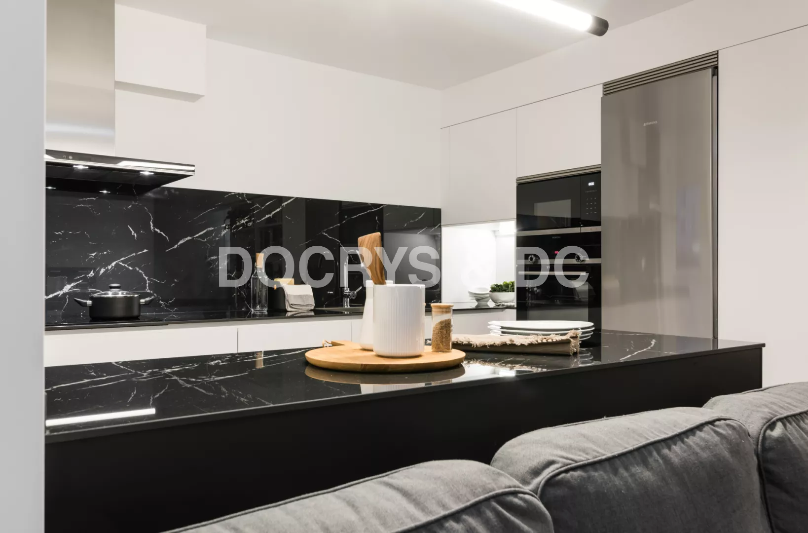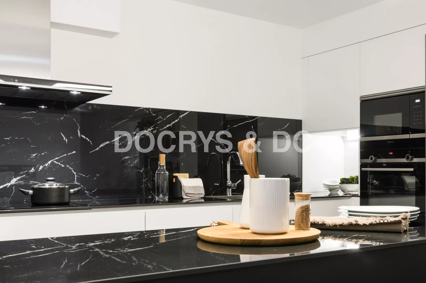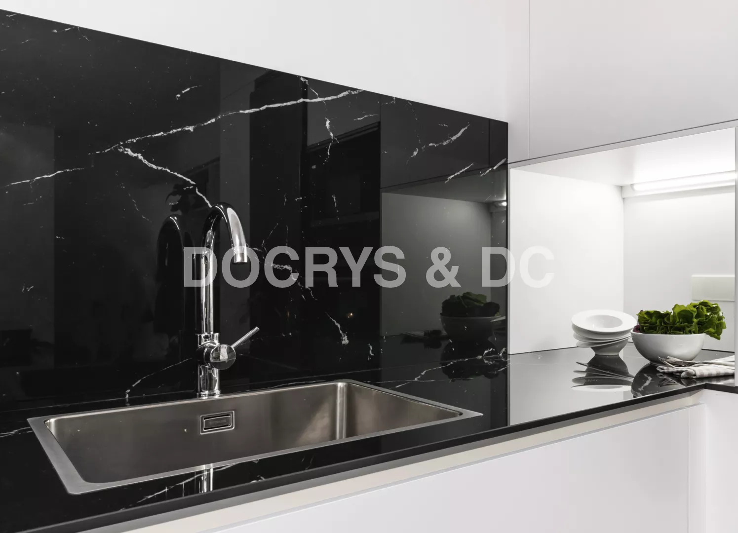La encimera elegida en este proyecto, en color Nero marquina, crea la combinación perfecta a esta cocina, atrayendo todas las miradas.