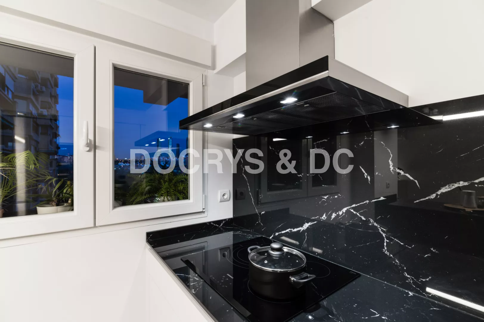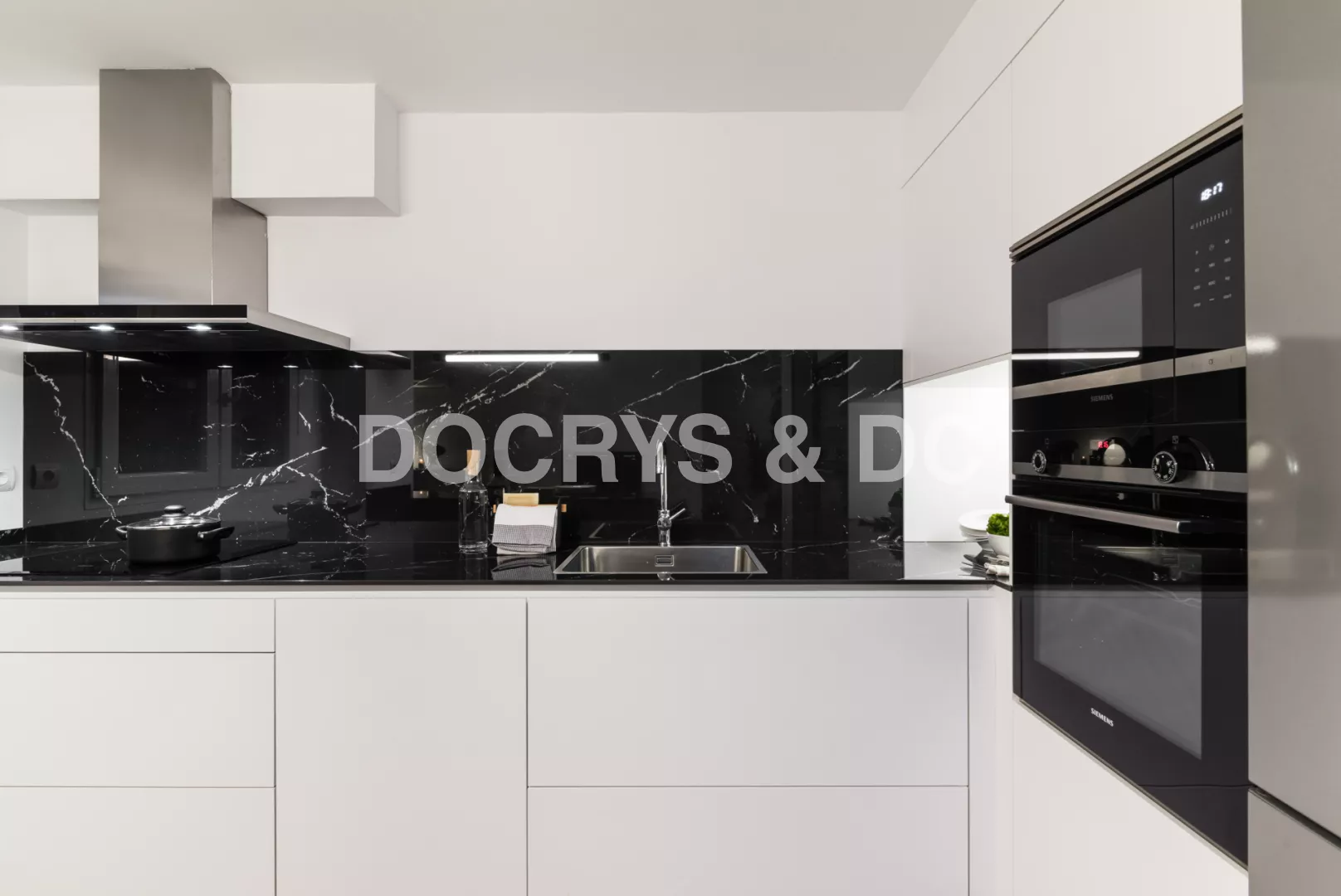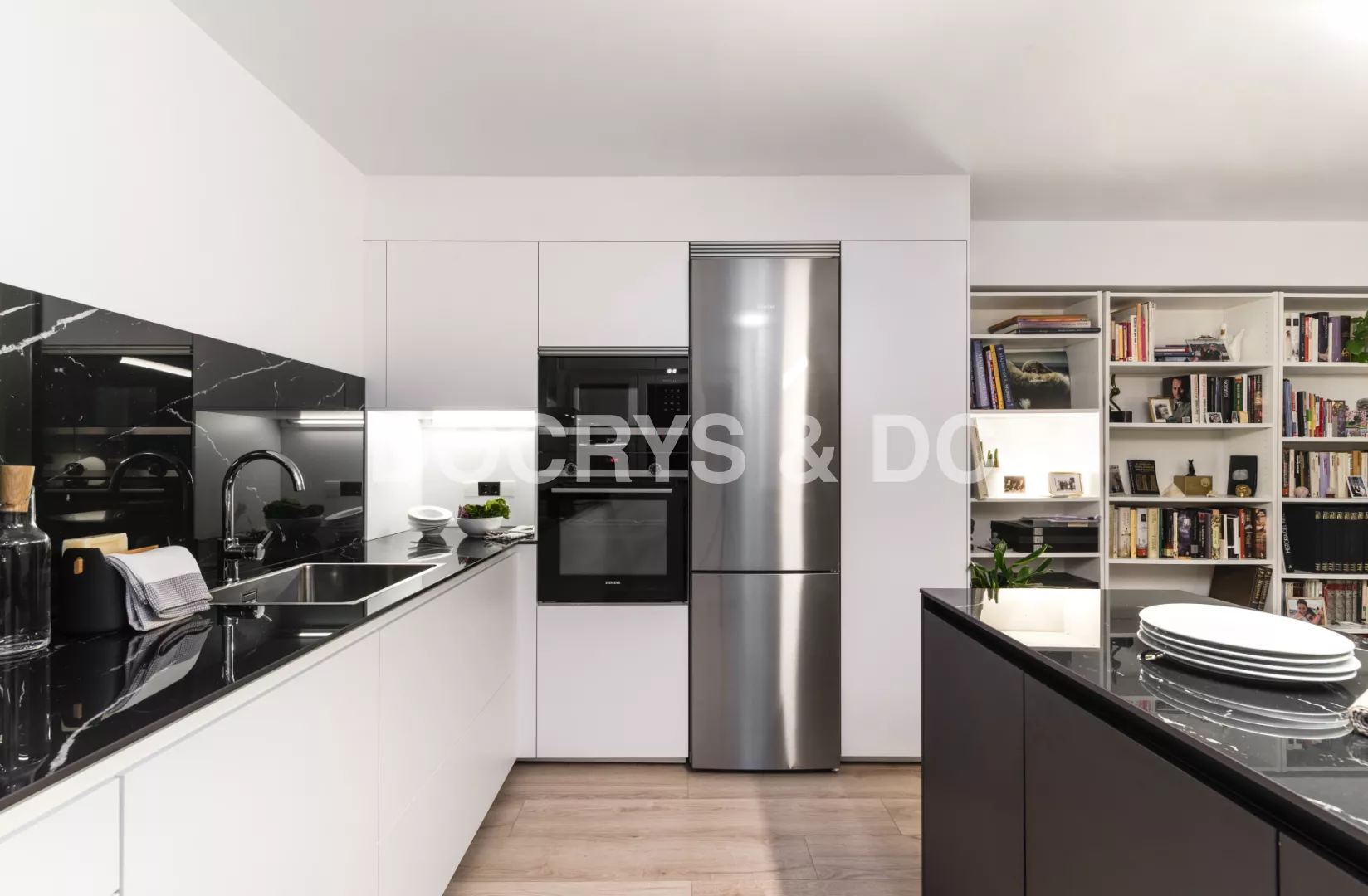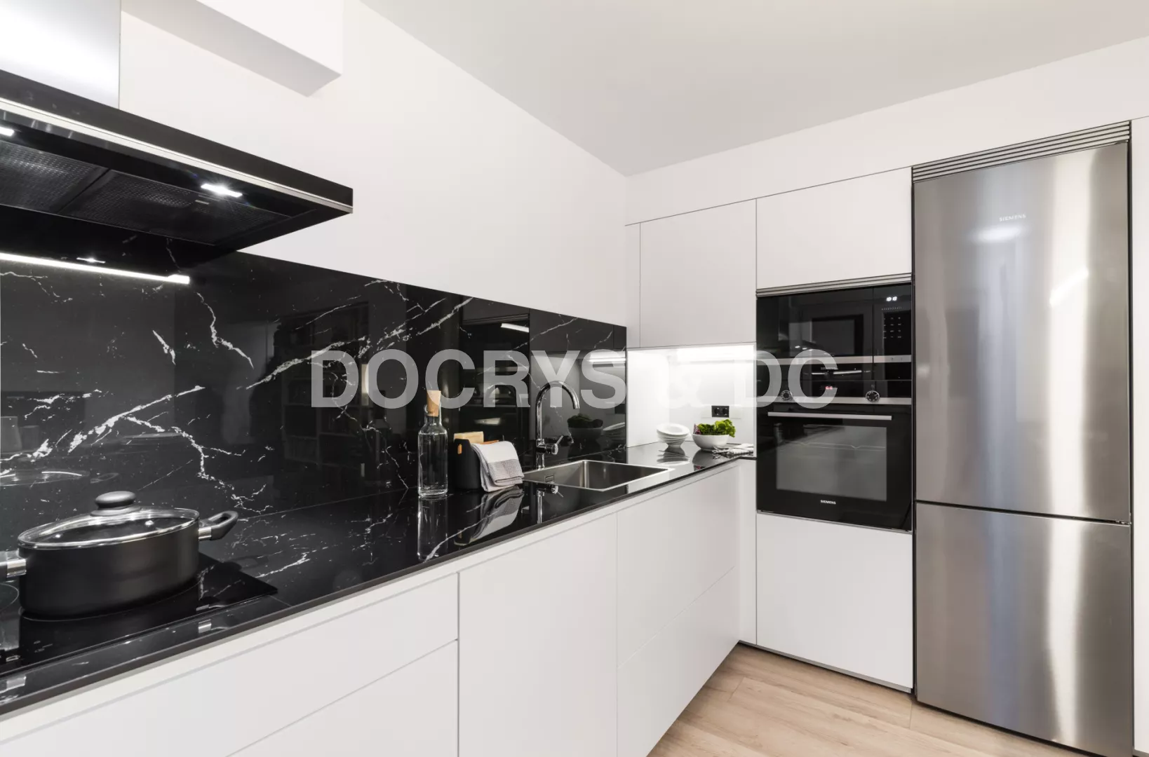 Cocina Santos en material estratificado con encimera de Neolith en color Nero marquina en acabado pulido.