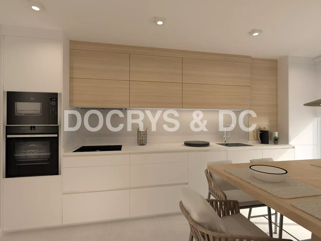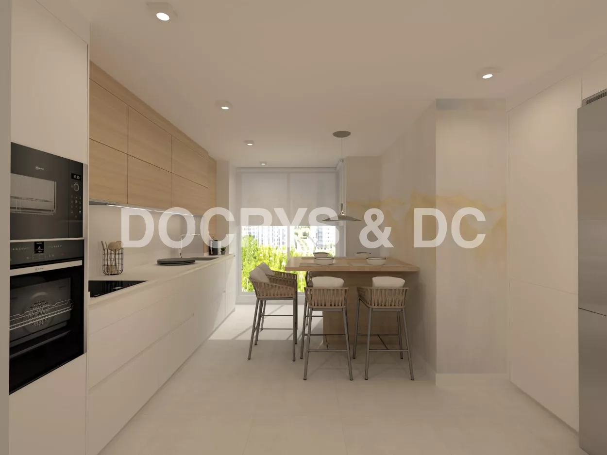 Cocina Santos en color olmo claro y blanco innsbruck con encimera de Silestone, color Blanco Zeus, acabado pulido.