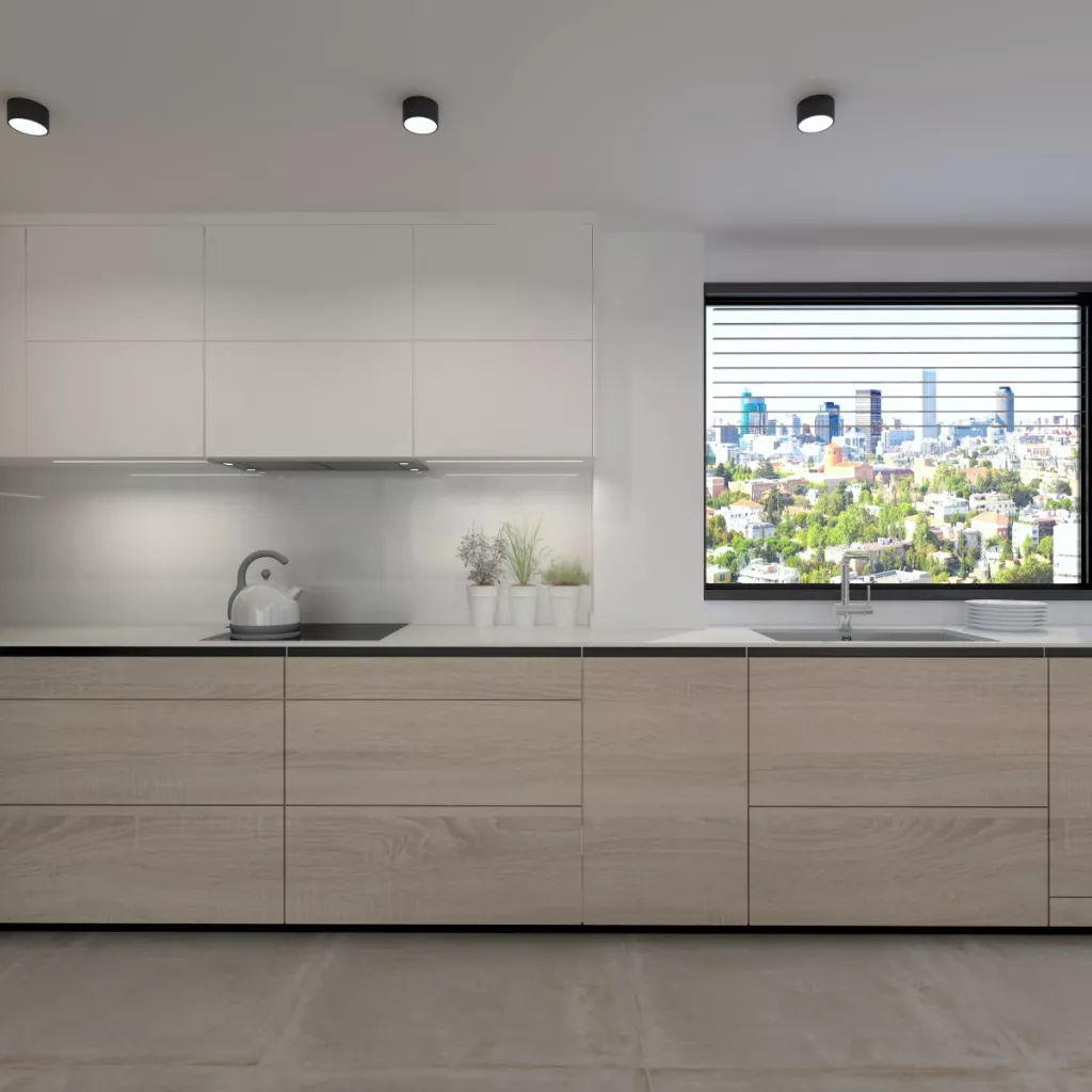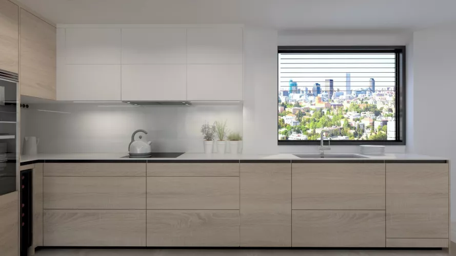 El diseño de esta cocina moderna tiene una distribución en L, cuenta con un largo frente con muebles altos y bajos, donde se encuentra la zona de cocción y el fregadero.