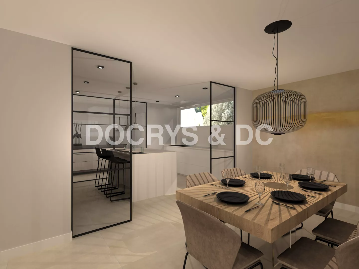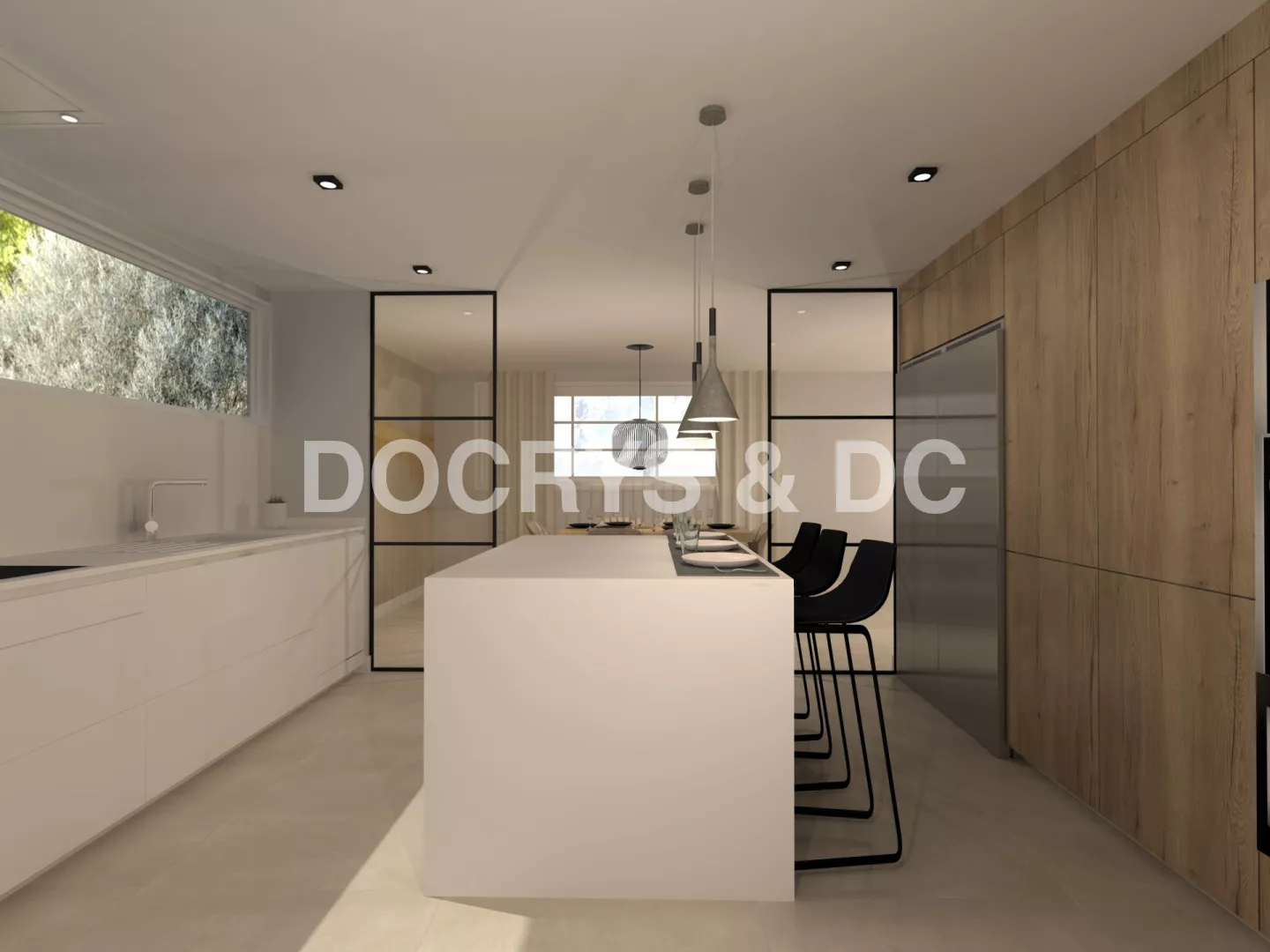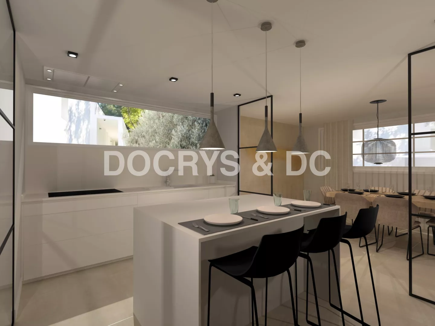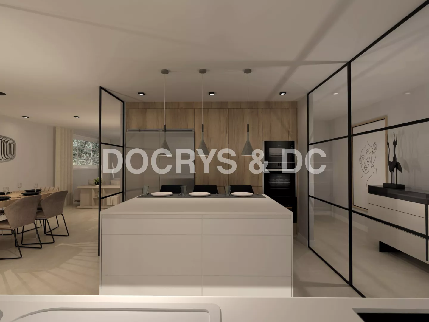Esta cocina es semi abierta al salón, como separación pusimos unas puertas correderas de cristal y aluminio negro.