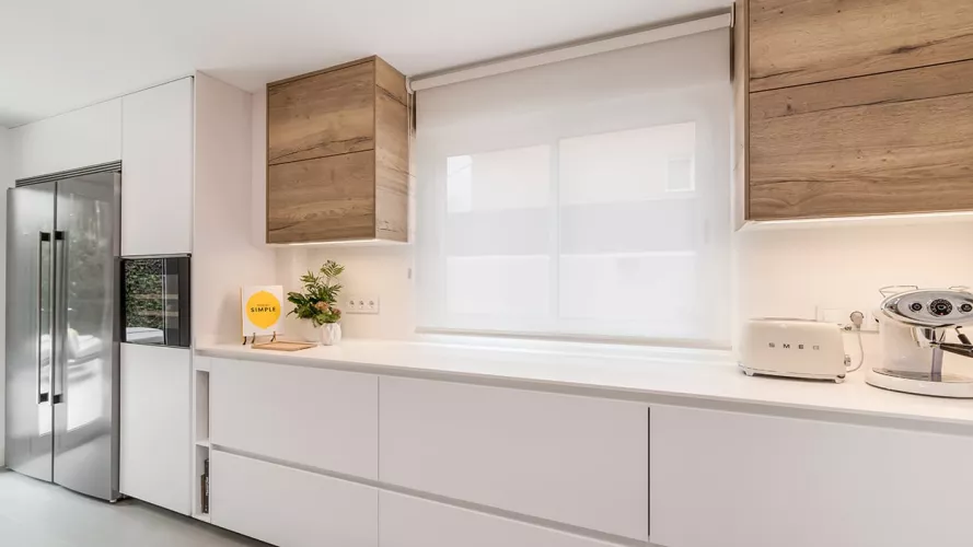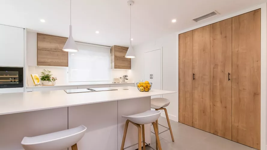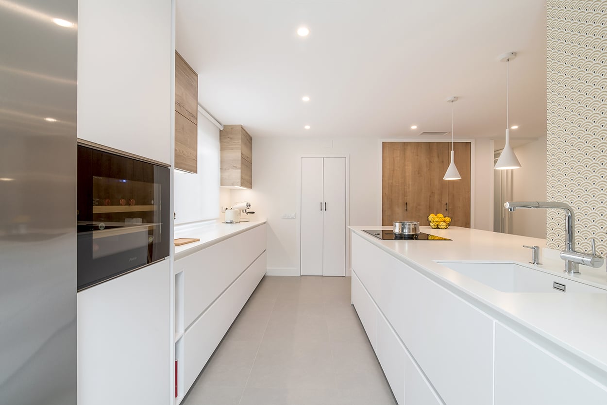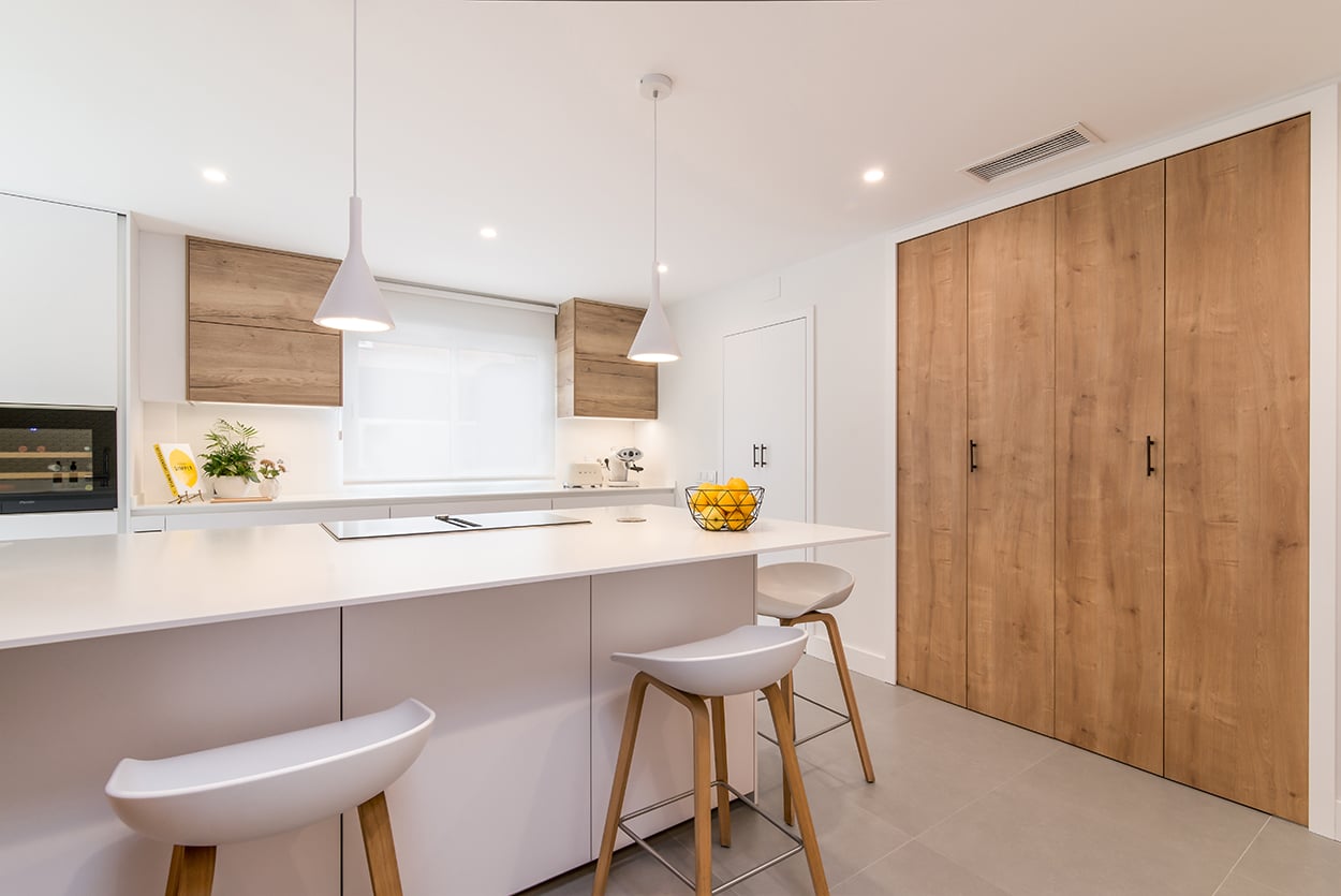 Cocina Santos en Blanco Innsbruck y Roble rústico con material estratificado y encimera de Lapitec, color Bianco assoluto, acabado pulido.