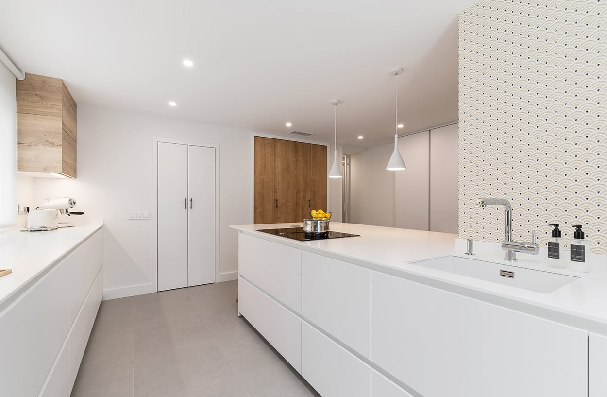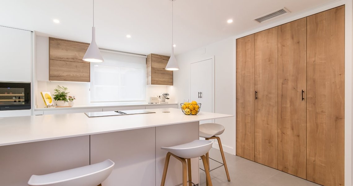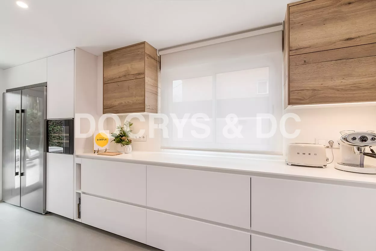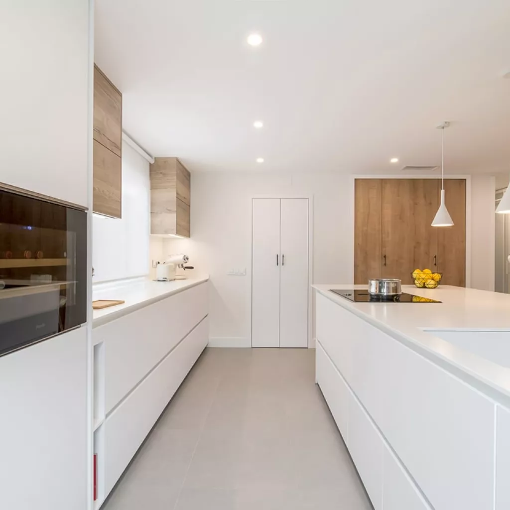 Cocina Santos en Blanco Innsbruck y Roble rústico con material estratificado y encimera de Lapitec, color Bianco assoluto, acabado pulido.