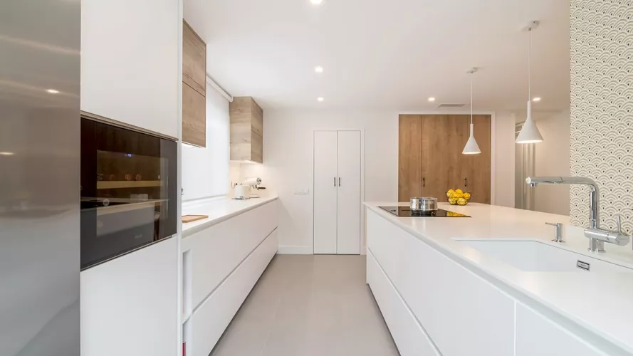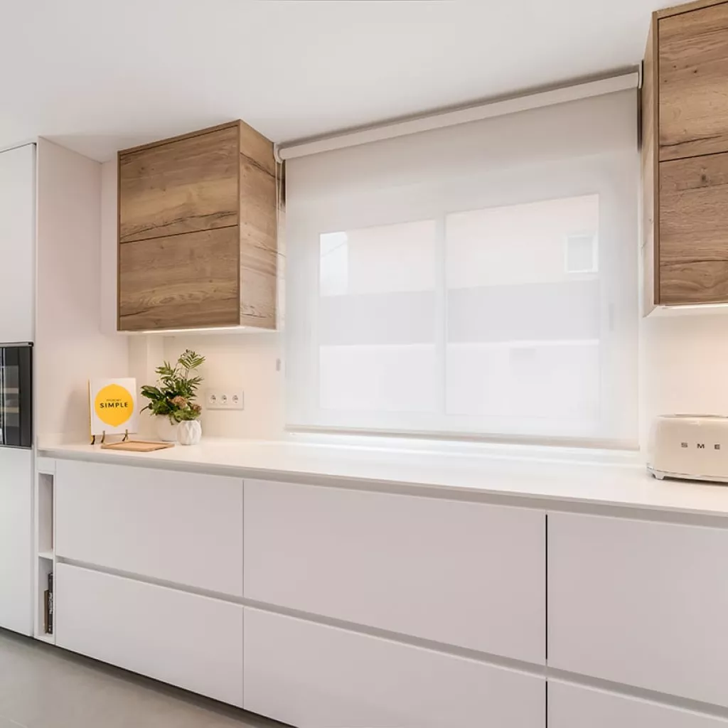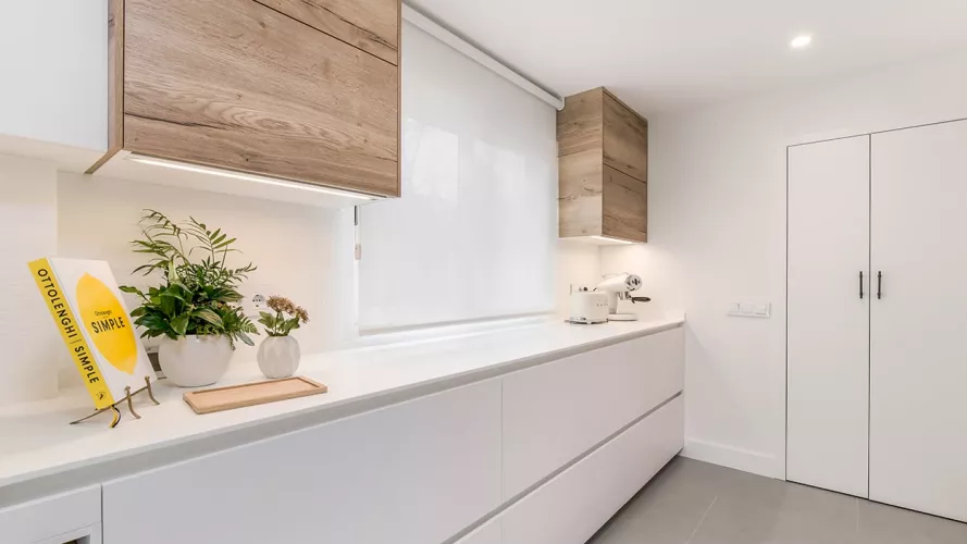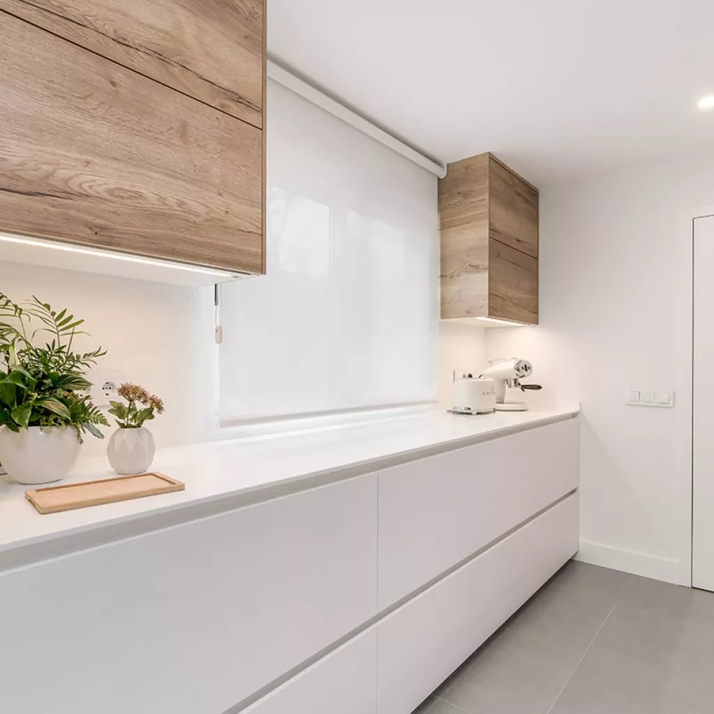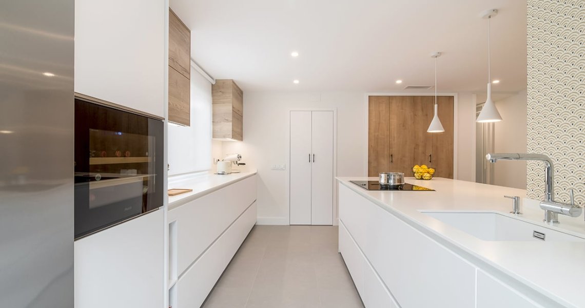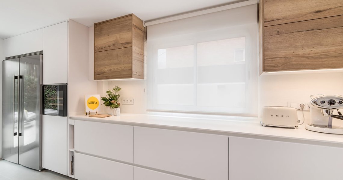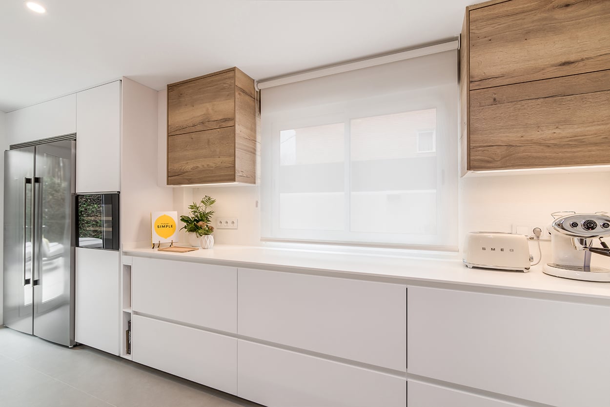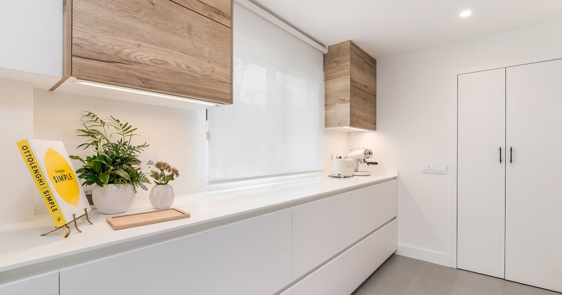 La distribución de esta cocina moderna cuenta con 2 frentes en paralelo, en uno de ellos, hemos optado por colocar muebles altos y bajos, obteniendo soluciones de organización y almacenaje.