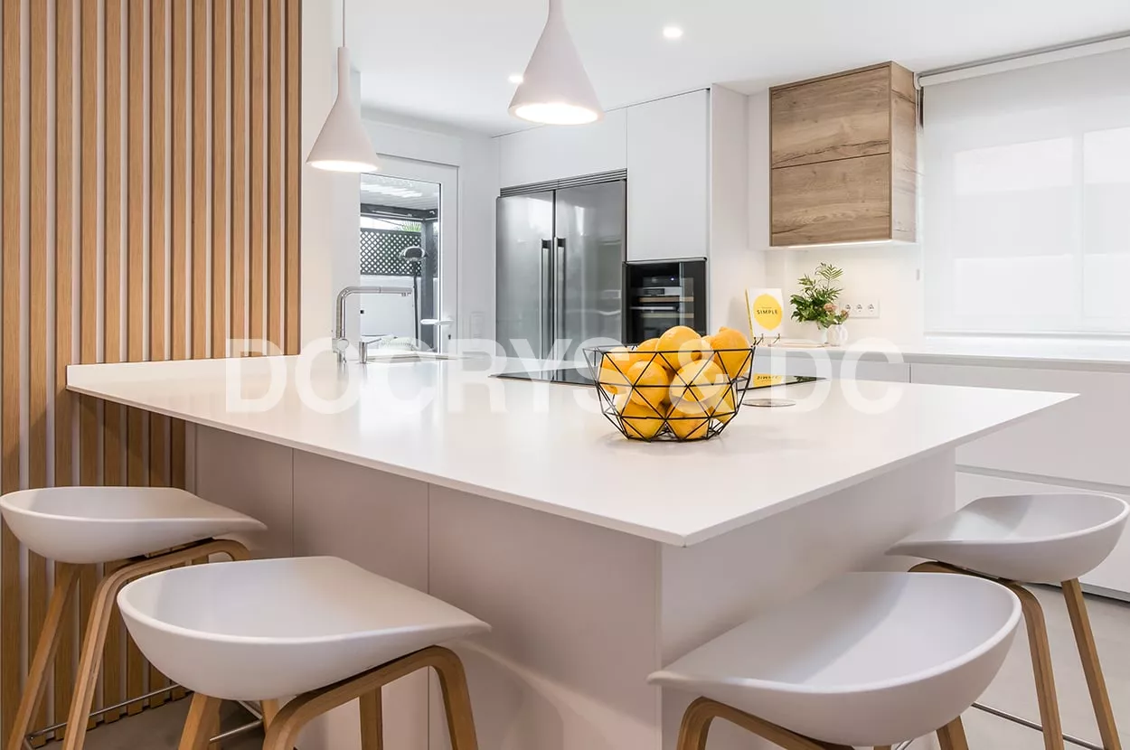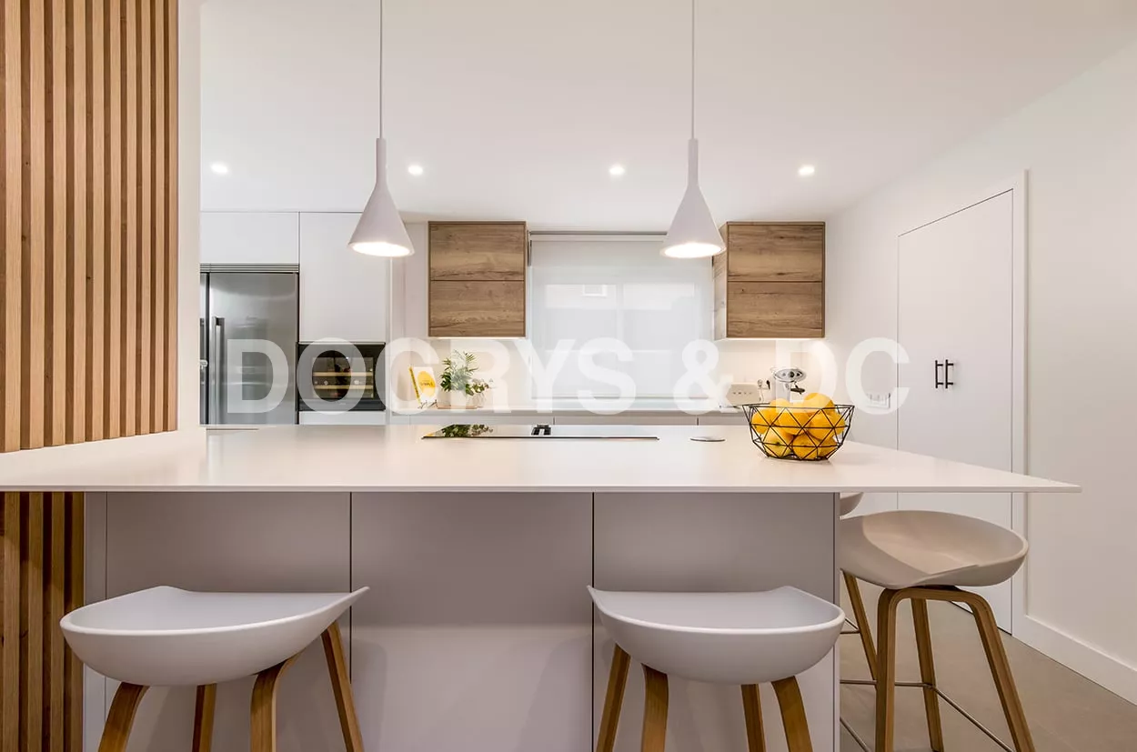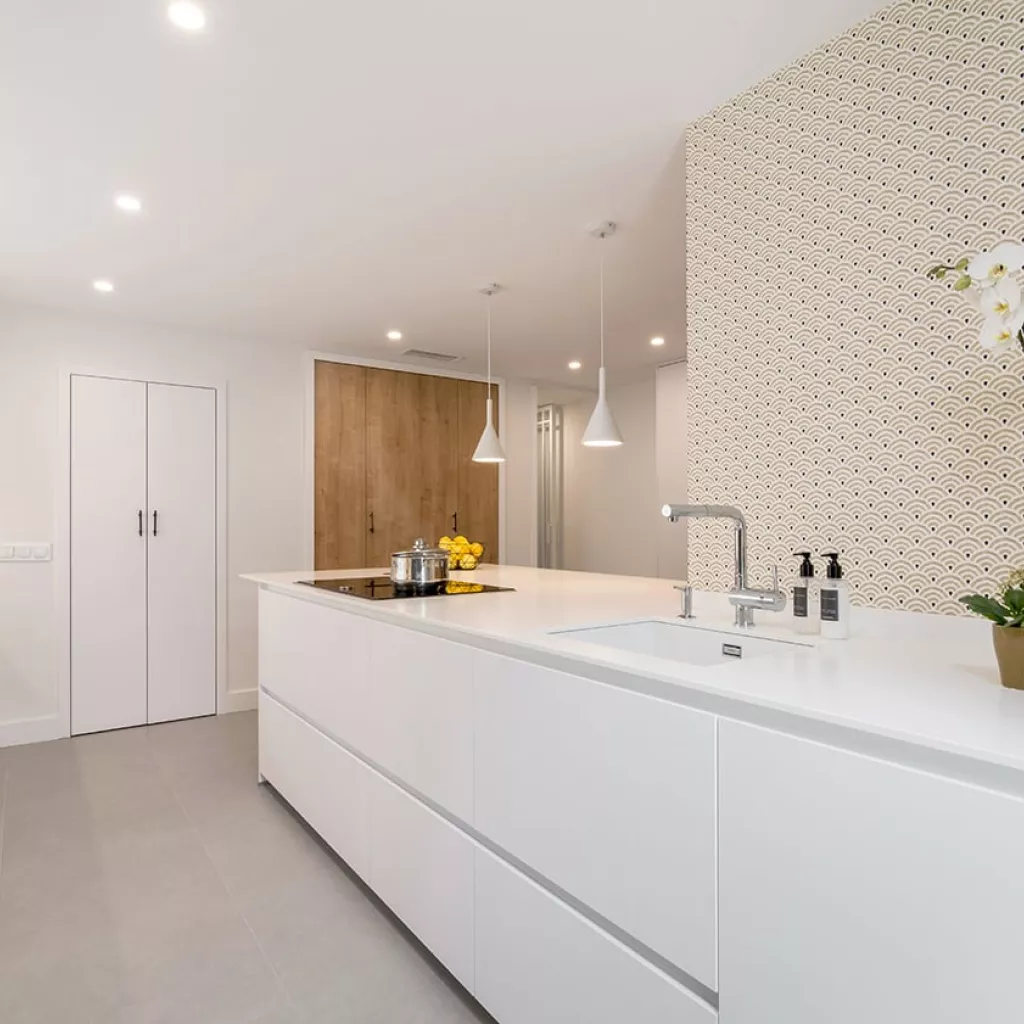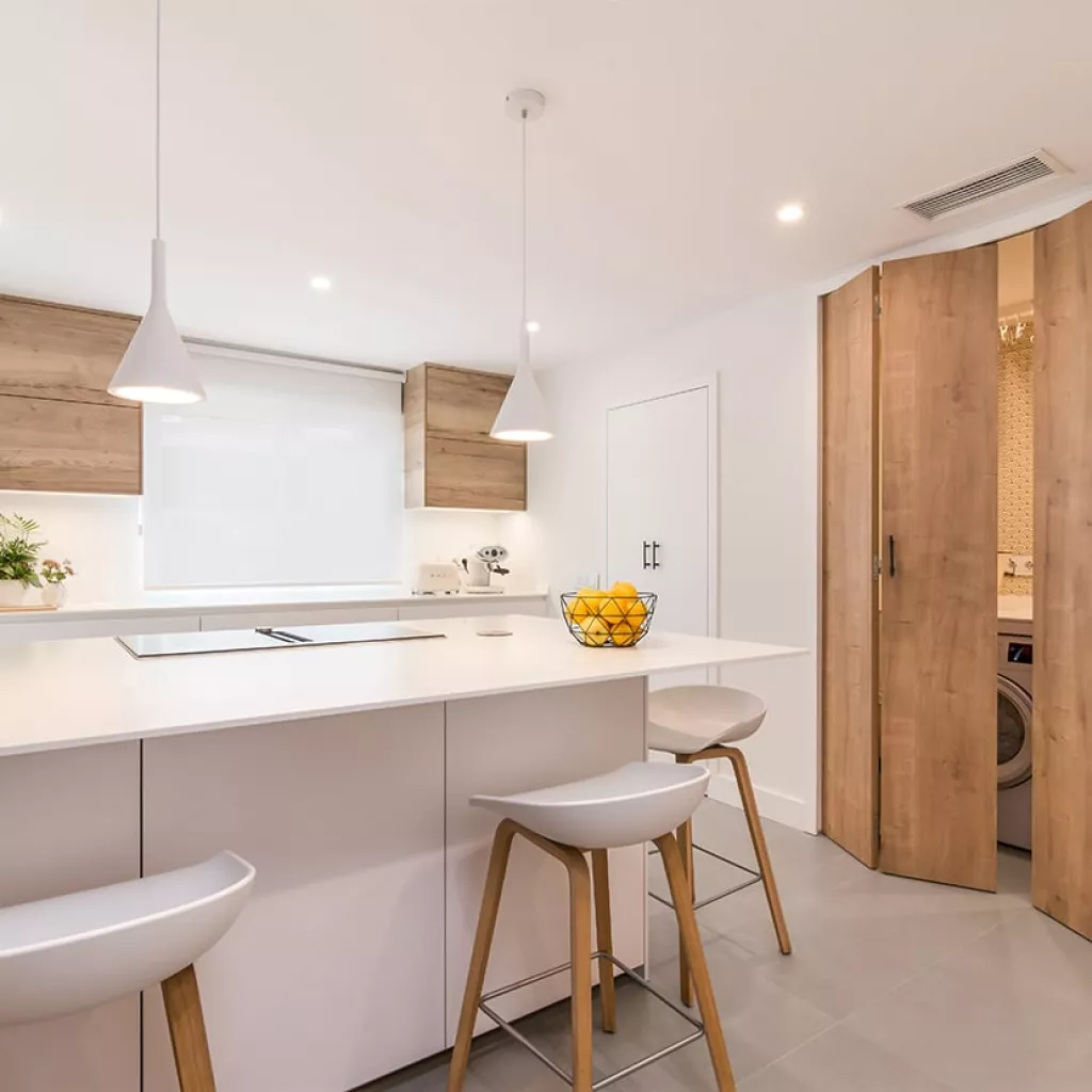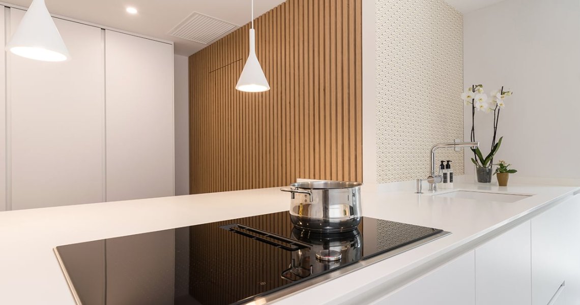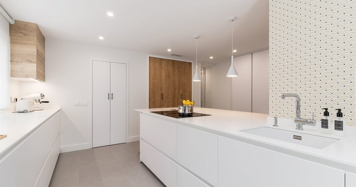 En el otro frente, hemos ubicado la zona de aguas y los grandes electrodomésticos, de este frente sale una gran península, donde se encuentra la zona de cocción, además de una gran zona de trabajo y una barra para cuatro comensales.