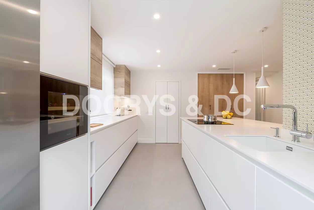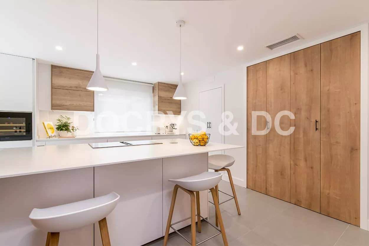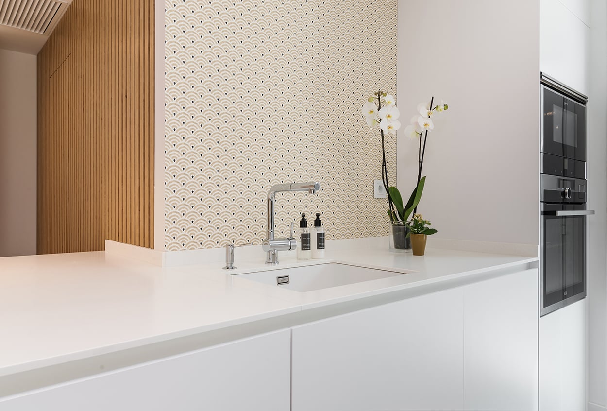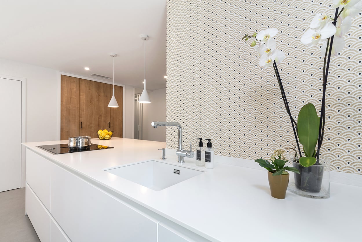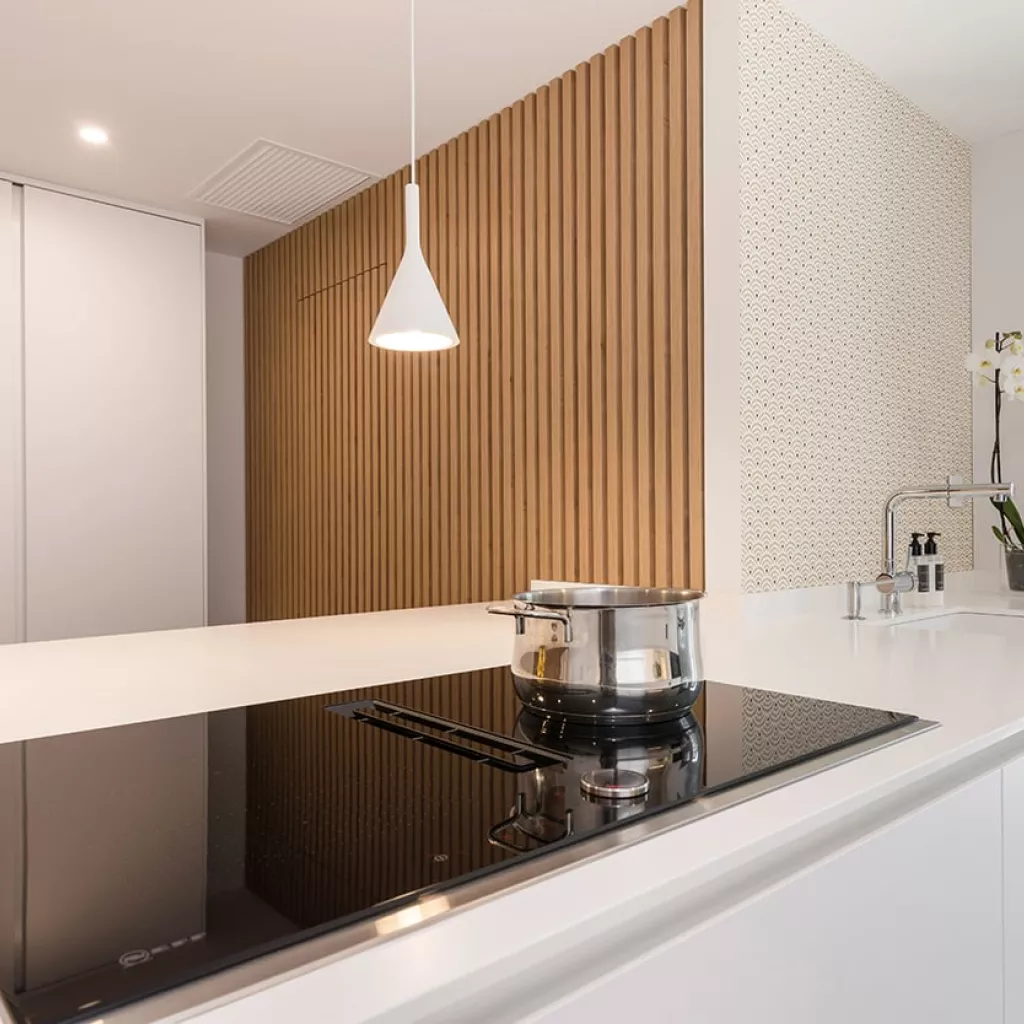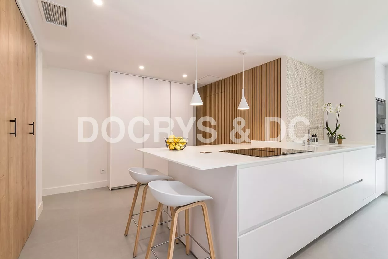 En el otro frente, hemos ubicado la zona de aguas y los grandes electrodomésticos, de este frente sale una gran península, donde se encuentra la zona de cocción, además de una gran zona de trabajo y una barra para cuatro comensales.