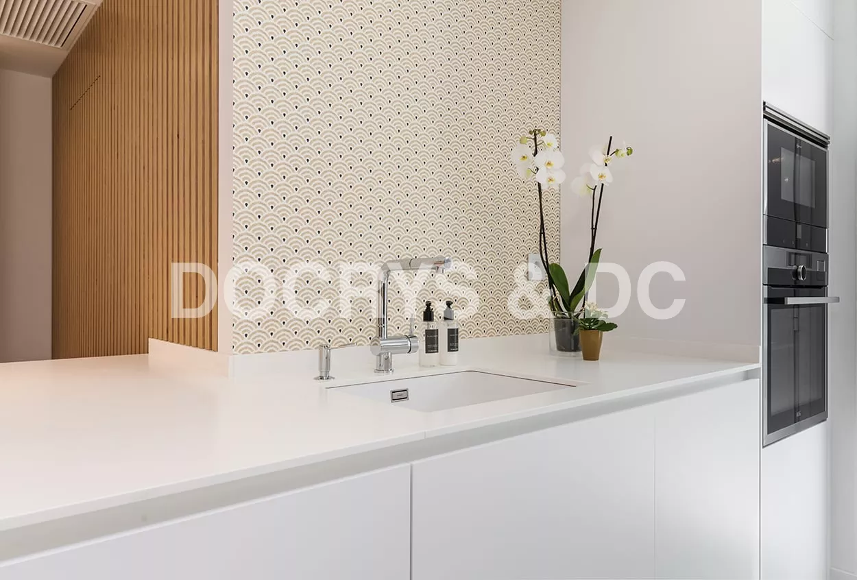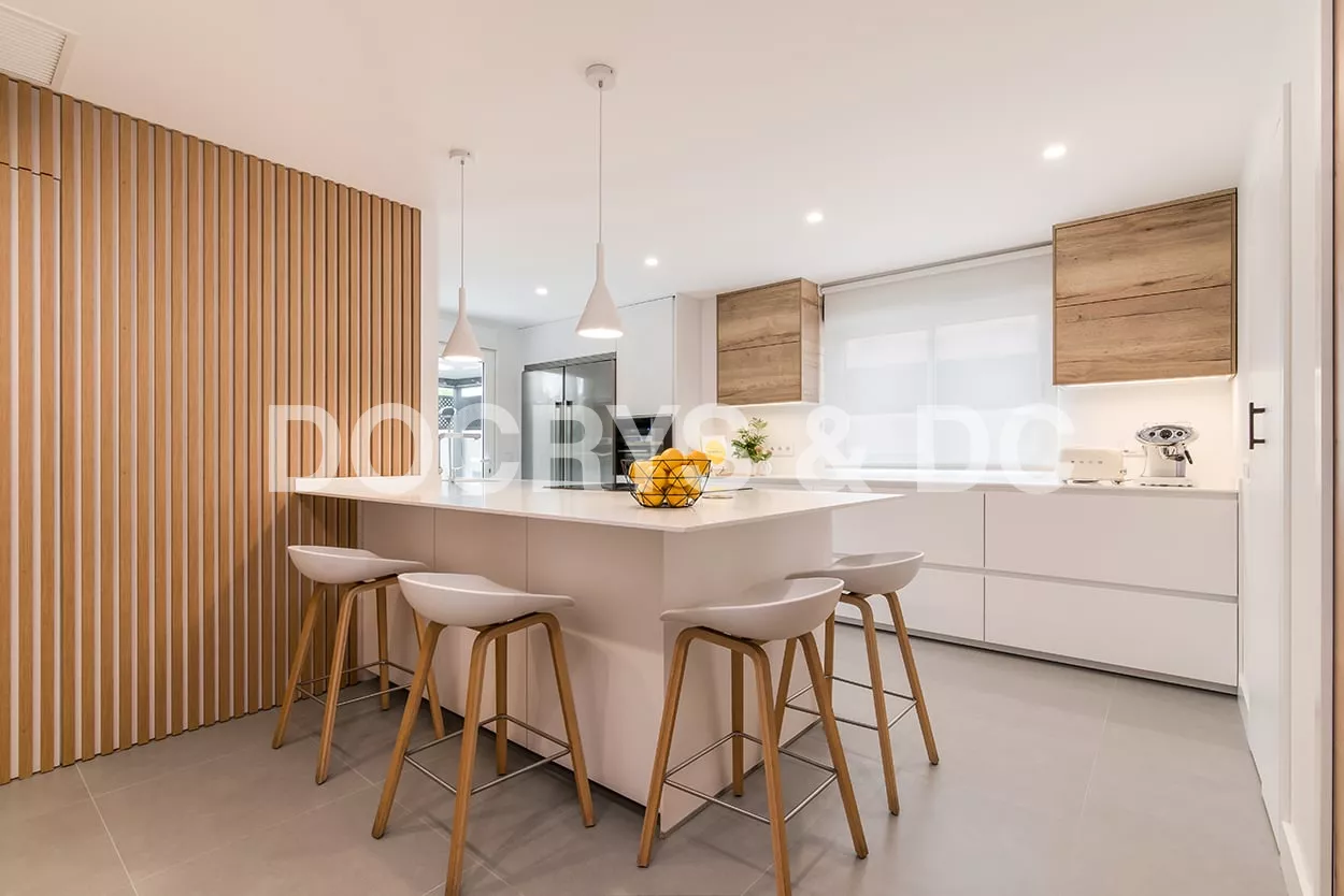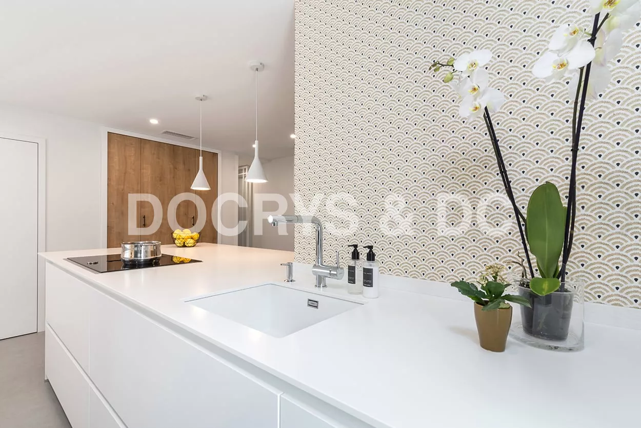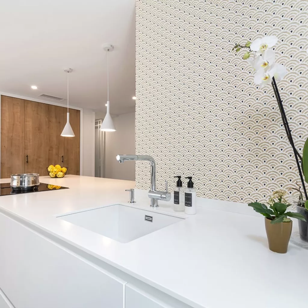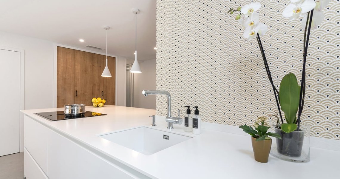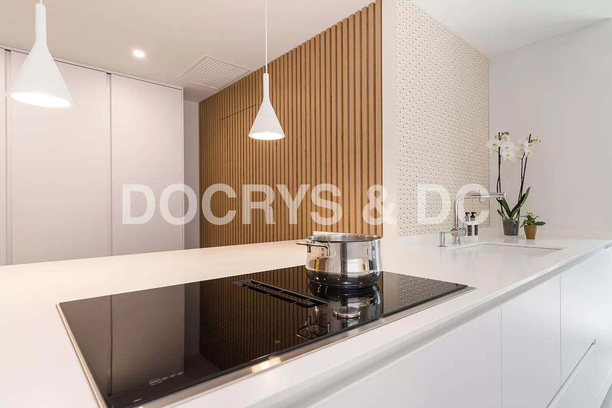 En el otro frente, hemos ubicado la zona de aguas y los grandes electrodomésticos, de este frente sale una gran península, donde se encuentra la zona de cocción, además de una gran zona de trabajo y una barra para cuatro comensales.