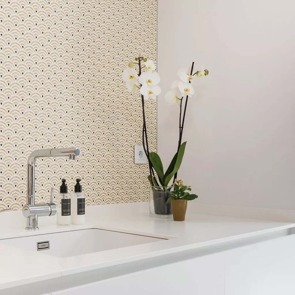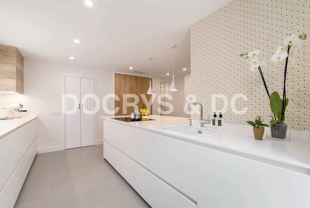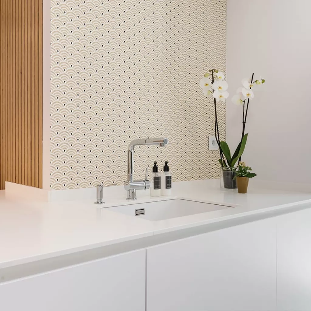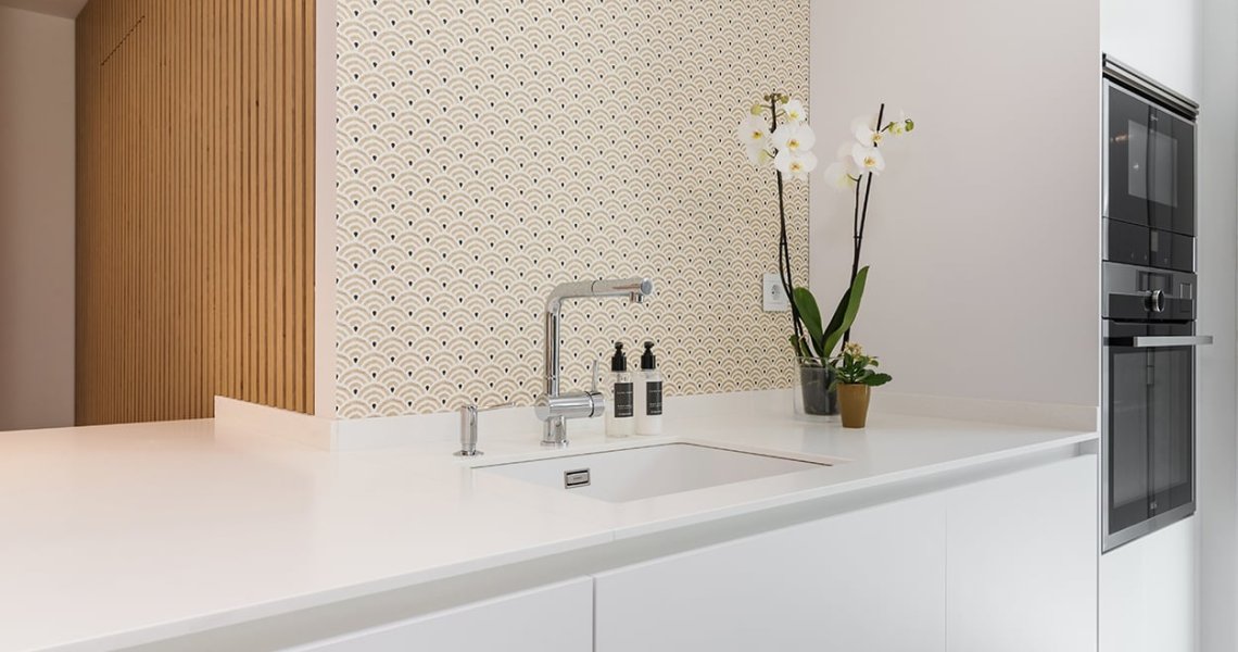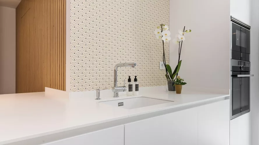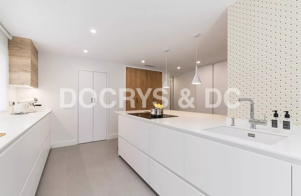 En el otro frente, hemos ubicado la zona de aguas y los grandes electrodomésticos, de este frente sale una gran península, donde se encuentra la zona de cocción, además de una gran zona de trabajo y una barra para cuatro comensales.