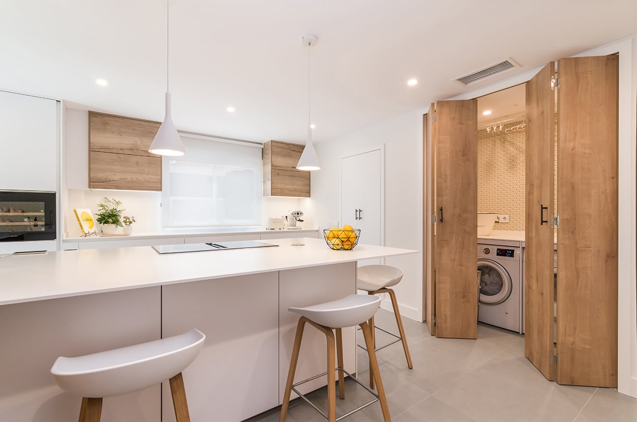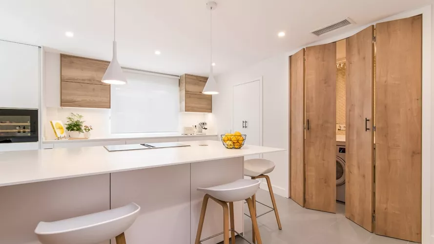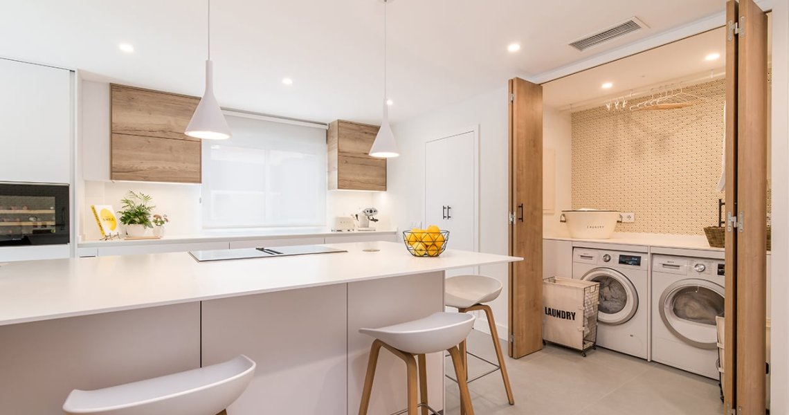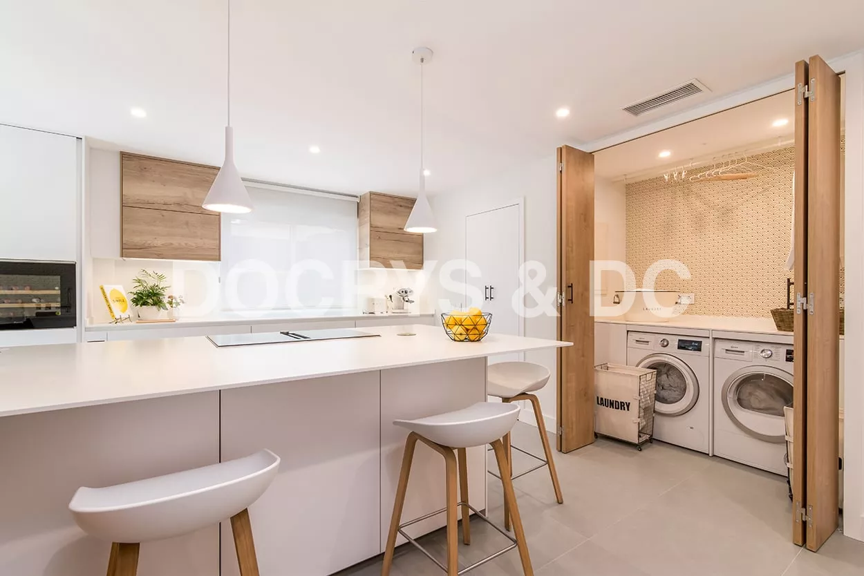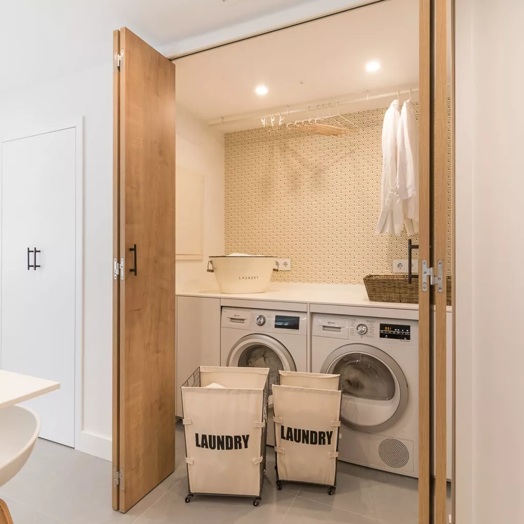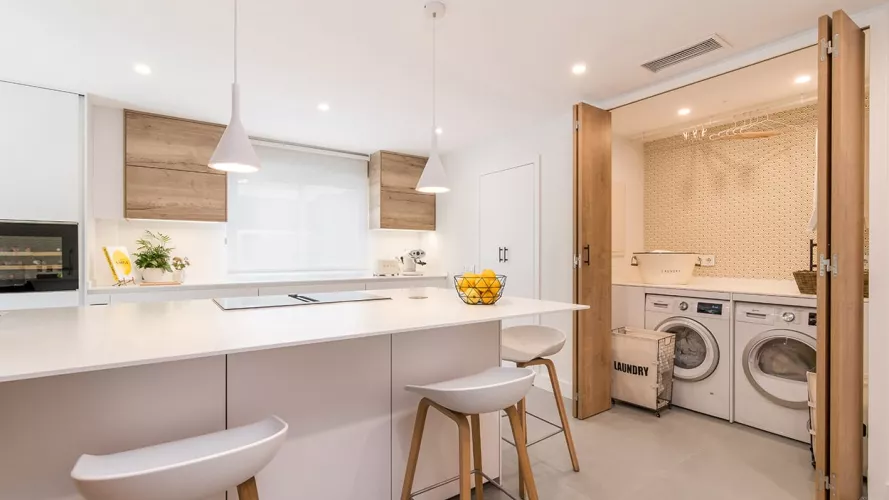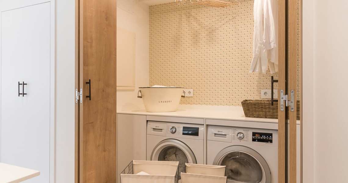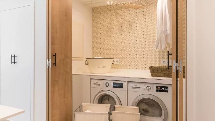Además, cuenta con una pequeña lavandería escondida tras unas puertas escamoteables, permitiendo esconder lo que hay en su interior.
