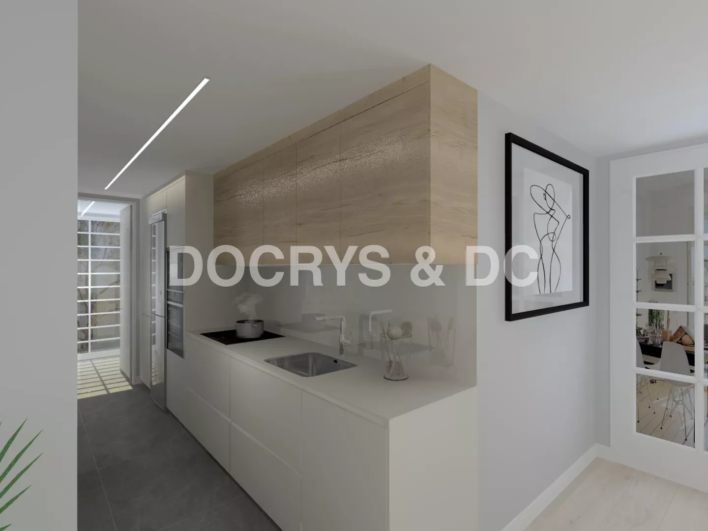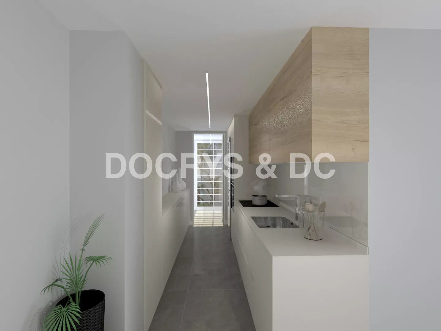 El diseño de esta cocina en blanco y roble, crea un contraste perfecto que rompe con el total white de la estancia.