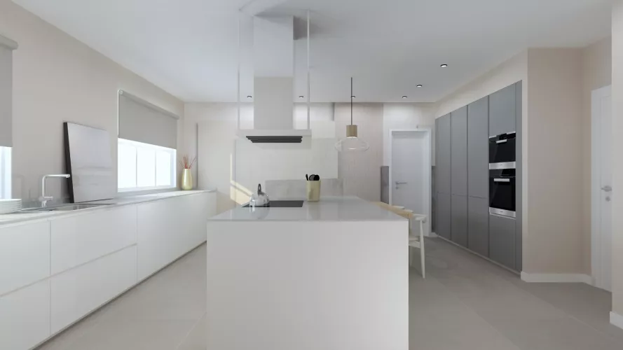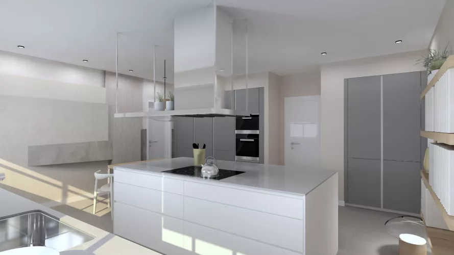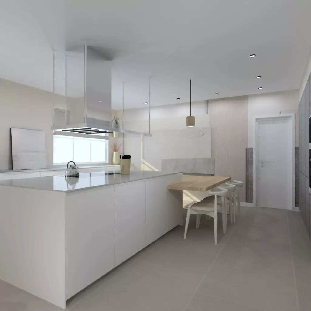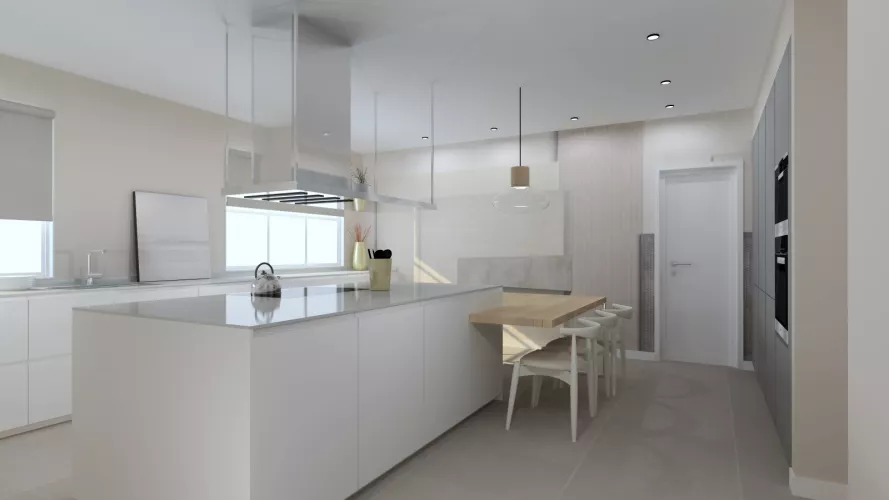 Los ambientes neutros de esta cocina Santos, vestida con tonos neutros, en su mayoría blanco, bris y madera, nos enamora por su amplitud y perspectiva. Su espacio, junto con la isla central, permite a sus inquilinos realizar sus tareas diarias con una gran comodida y la ambientación consigue crear un ambiente relajado en el que disfrutar de cada momento. La isla central aporta una gran capacidad de almacenaje y al tener la zona de cocción incorporada, facilita cualquier acividad que se realice. La barra adosada de madera, pequeña pero funcional, es perfecta para desayunos o comidas rápidas, que permitan ordenar y limpiar todo sin complicaciones cuando los inquilinos no tienen todo el tiempo que quisieran. Reconócelo, ¡a todos nos pasa! Además, dentro de los tonos neutros a través de los que creamos esta moderna cocina, la madera aporta una gran calidez que suaviza el conjunto.