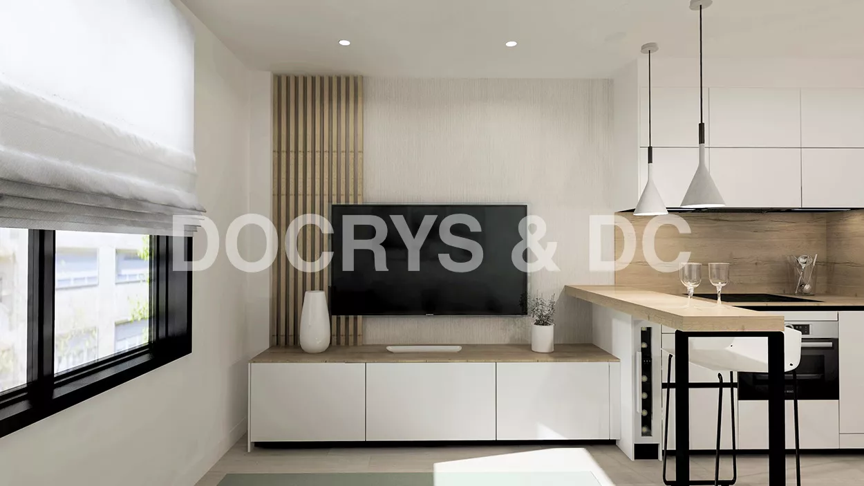 Por otro lado, el mueble del salón también a juego con el mobiliario de la cocina, en el mismo color Blanco Innbsruck, es de la gama de Mobiliario Living de Santos, con el mismo tipo de tirador push.