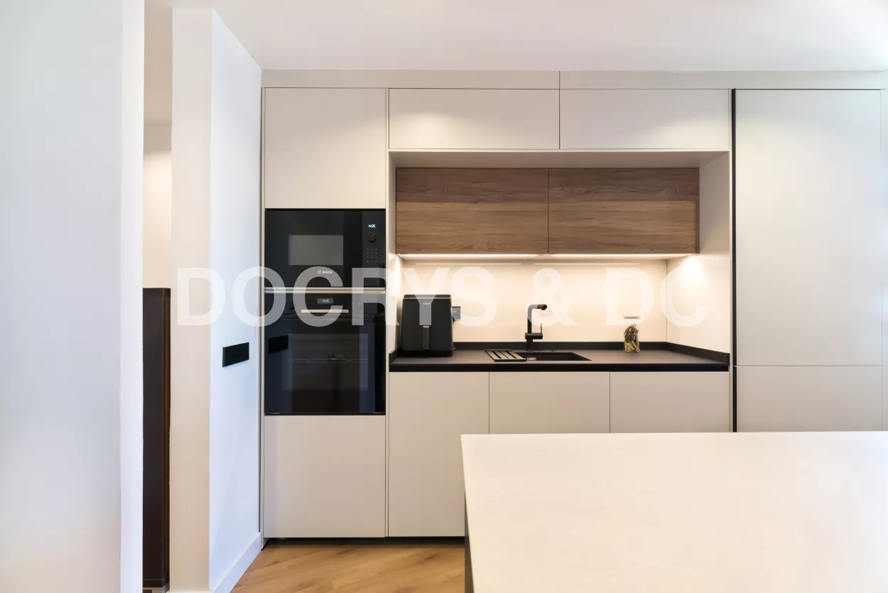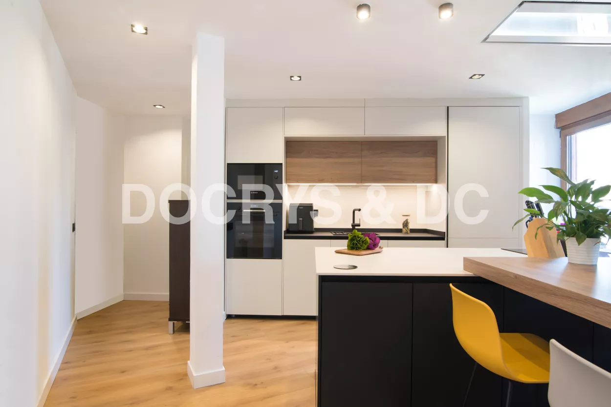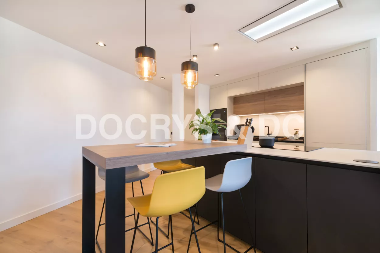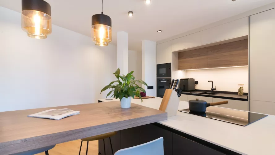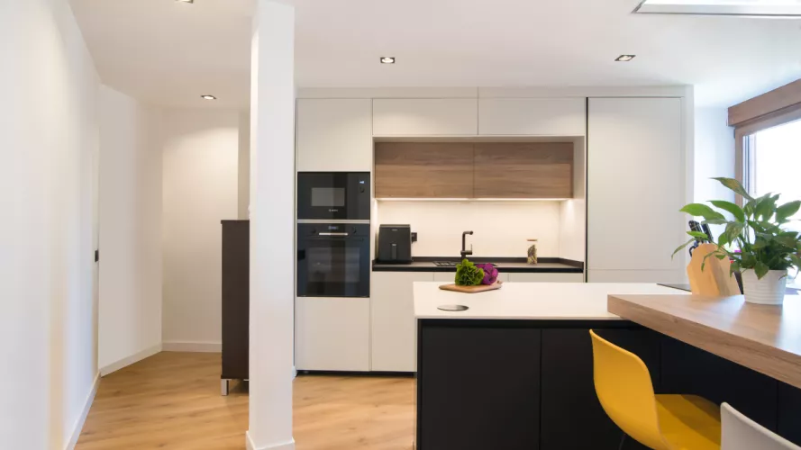El mobiliario combina frentes en acabado blanco perla con armarios superiores en madera natural, logrando un contraste armónico y acogedor. La encimera de Lapitec se extiende hasta la isla, proporcionando una superficie amplia para la preparación de alimentos y el uso cotidiano. Sobre esta isla negro seda, una mesa de madera que genera un espacio perfecto para desayunos o comidas informales, acompañada de taburetes de diseño con estructura metálica en negro y asientos en tonos blanco, gris y mostaza.
