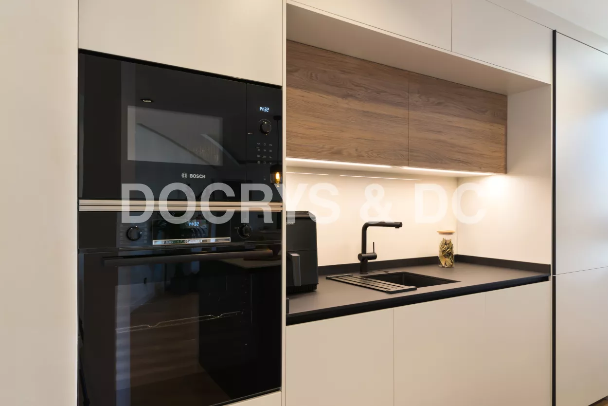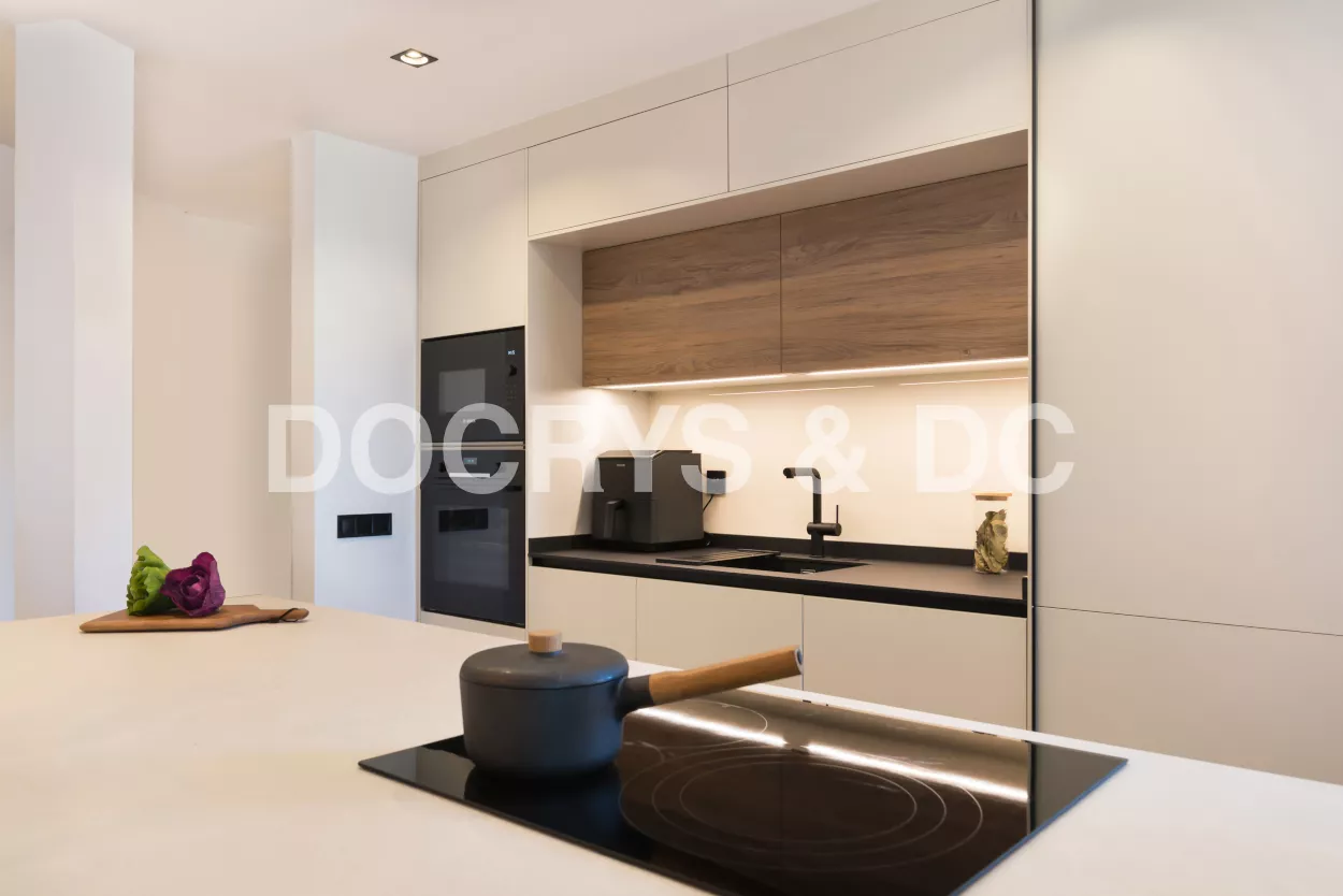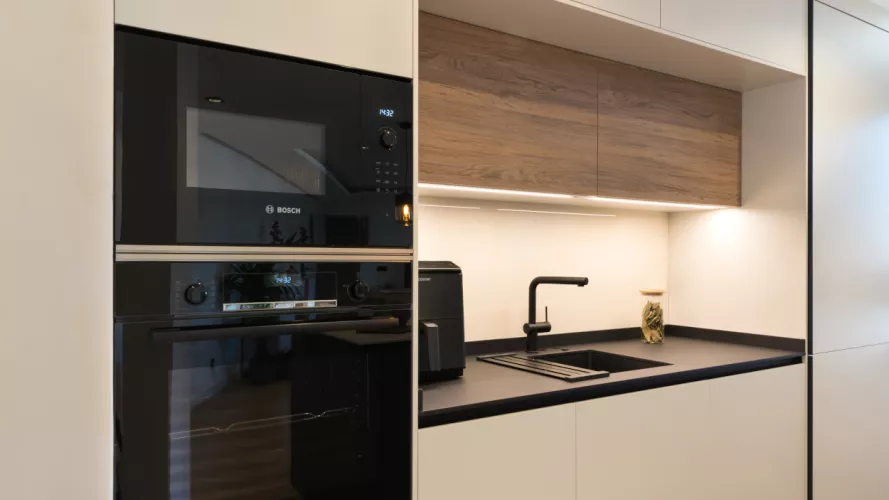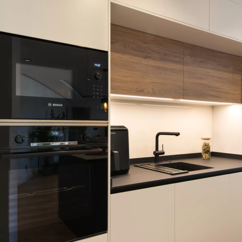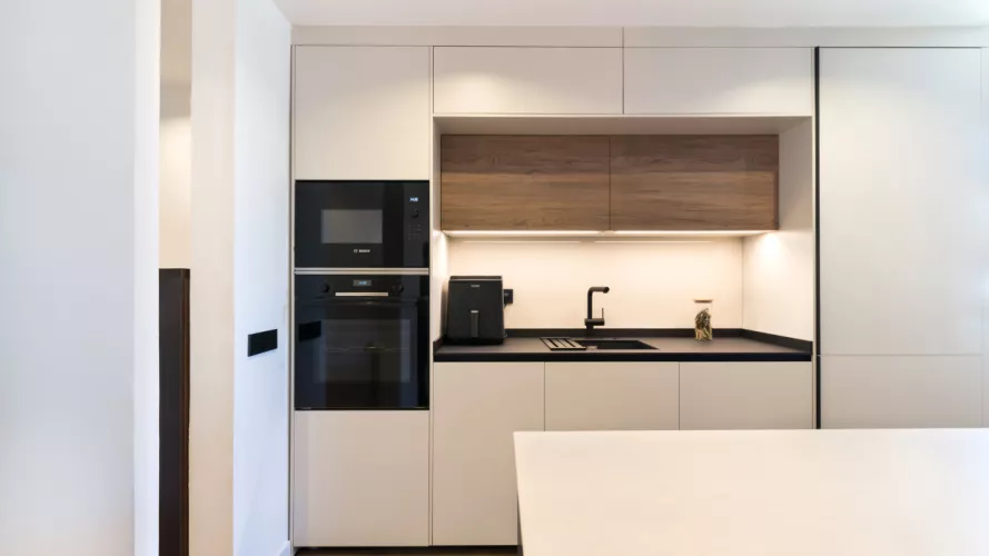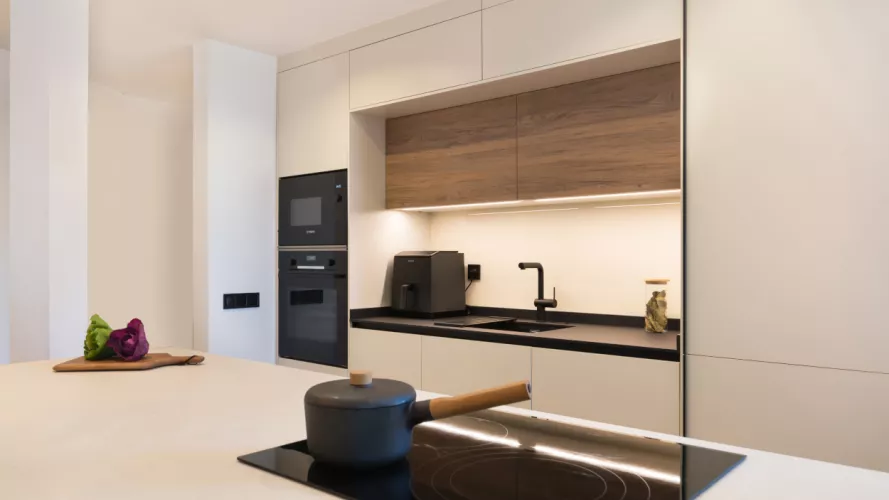 La zona de cocción se ha integrado a la isla con una placa de inducción negra que refuerza la estética moderna del conjunto. En el lateral, la zona de trabajo y almacenamiento incorpora electrodomésticos empotrados en negro, incluyendo horno y microondas, asegurando una integración visual elegante y eliminando el ruido visual. La encimera negra en esta área resalta con el fregadero de líneas minimalistas y la grifería en negro mate, un detalle que añade un toque de sofisticación.
