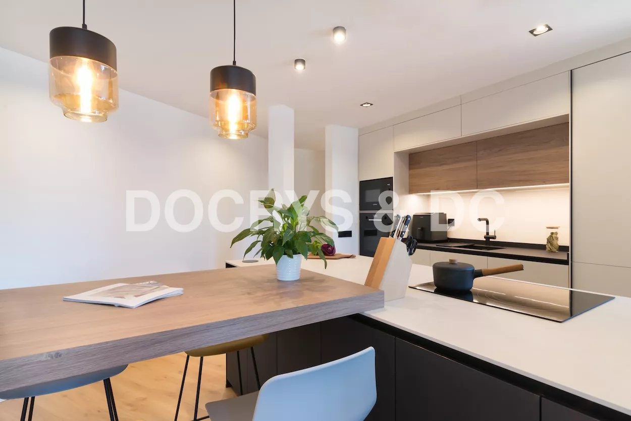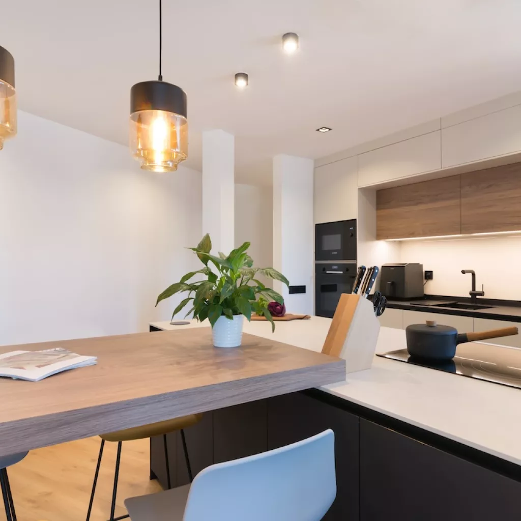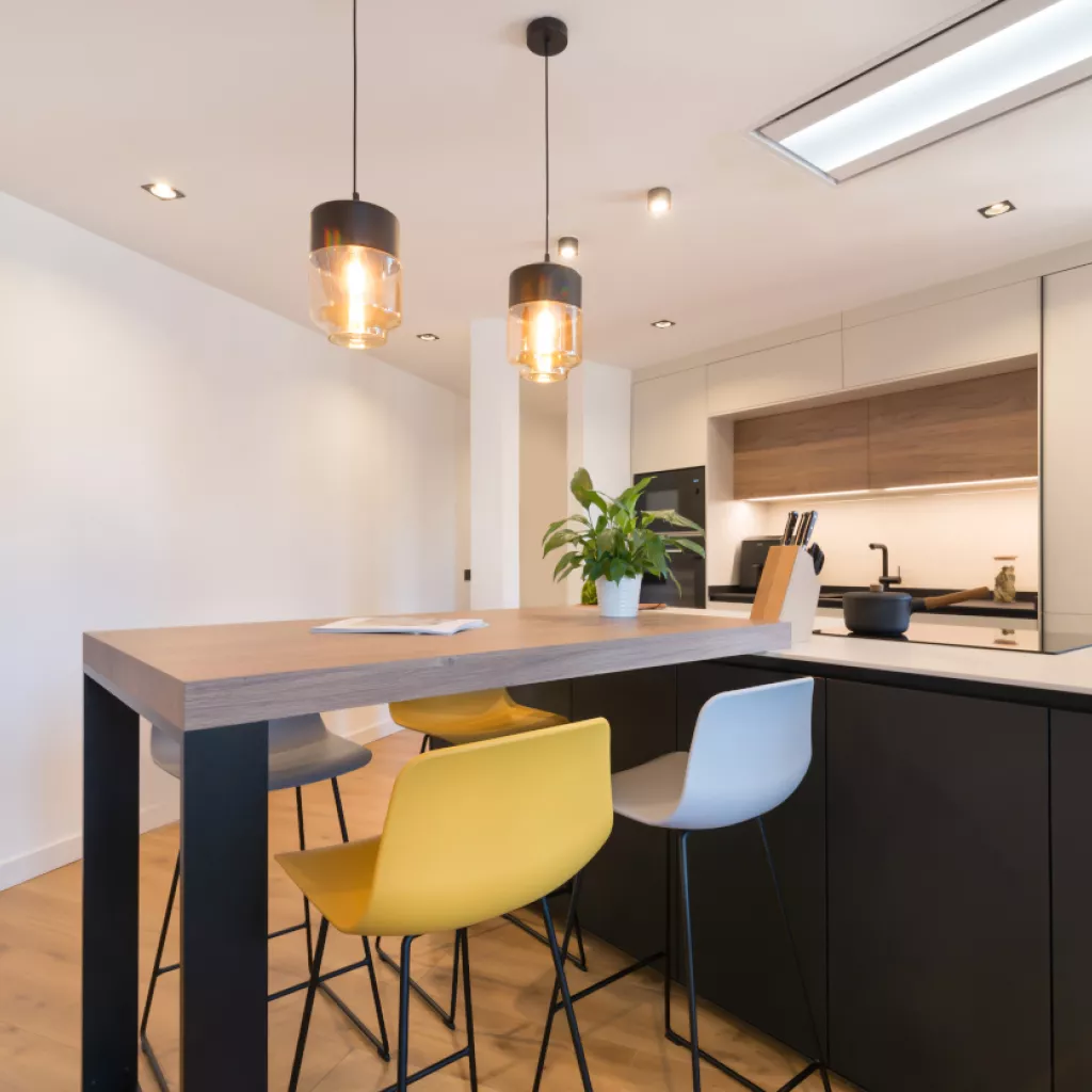 La iluminación ha sido cuidadosamente seleccionada para realzar la estética del espacio. Dos lámparas colgantes con pantalla de cristal ámbar y detalles en negro que aportan calidez y personalidad sobre la mesa de la isla, mientras que los focos empotrados garantizan una iluminación uniforme y funcional en toda la cocina.