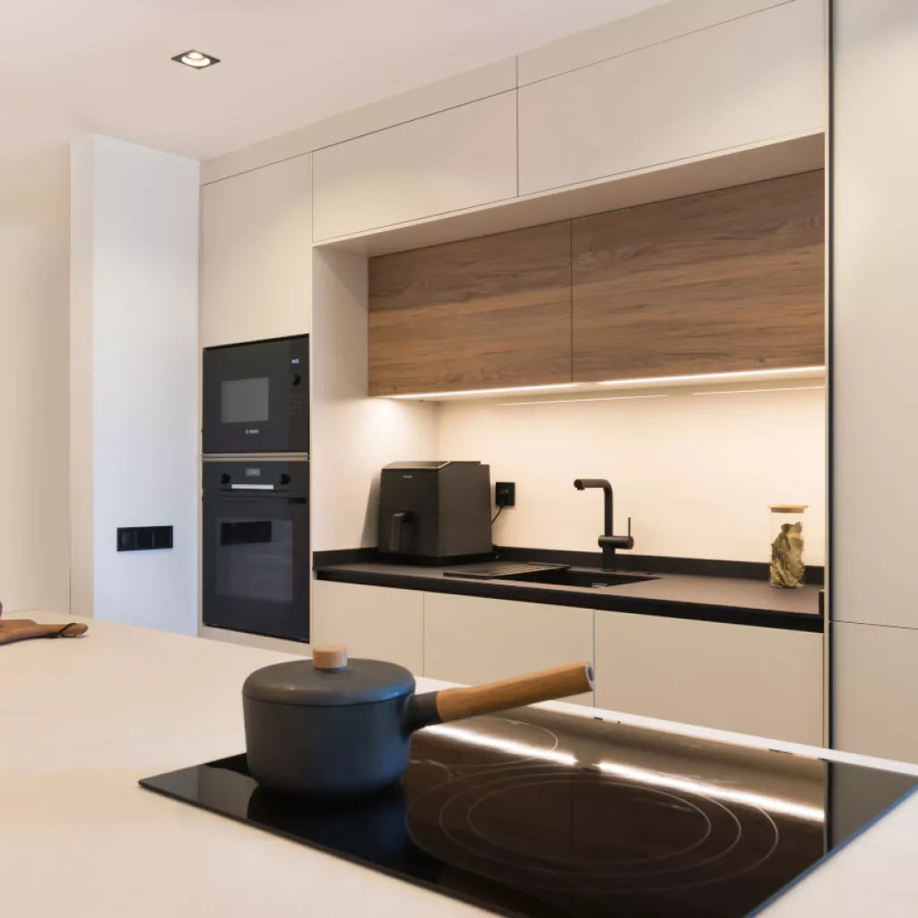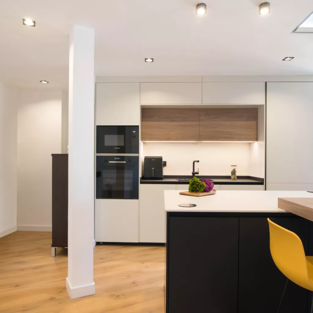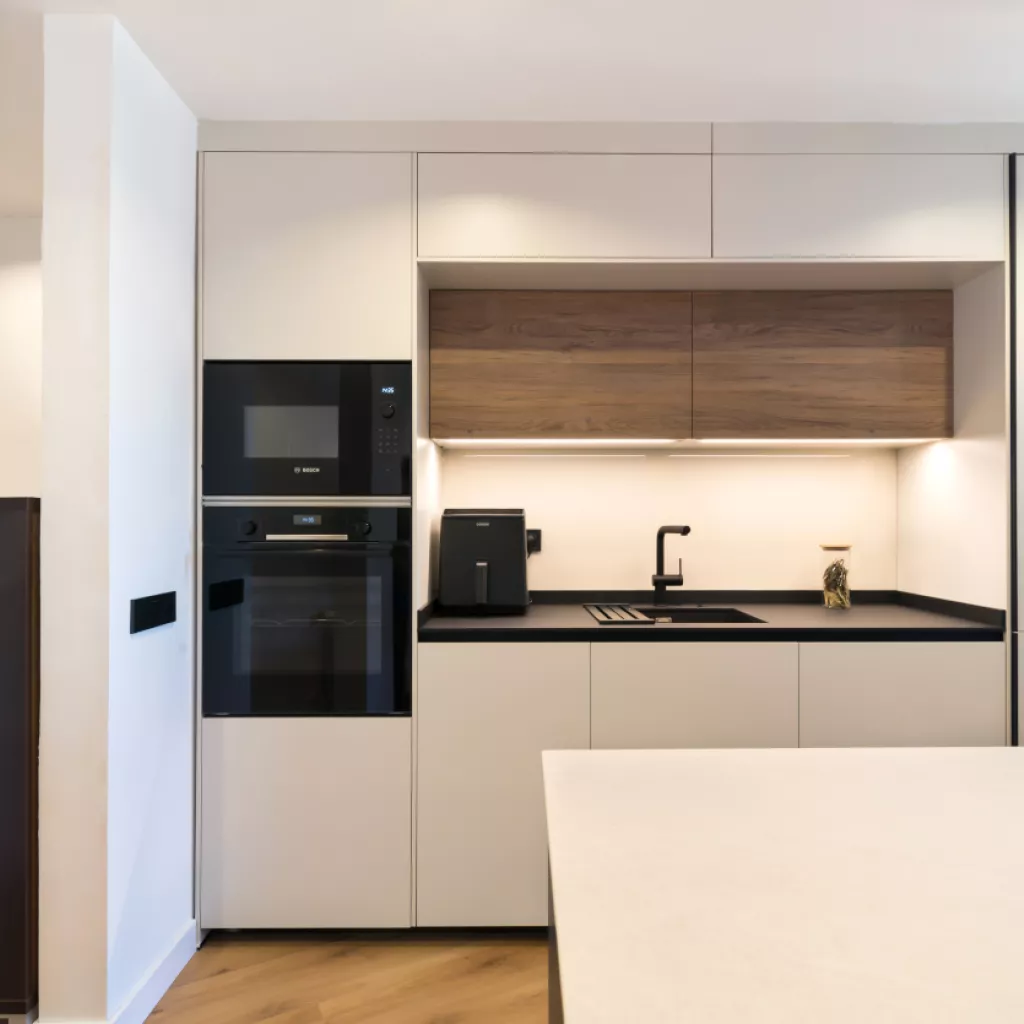 Este proyecto de cocina se distingue por su diseño contemporáneo y equilibrado, donde la combinación de tonos neutros, madera y detalles en negro aporta sofisticación y calidez al espacio. La distribución en isla central favorece la funcionalidad y la interacción, convirtiendo esta cocina en un punto de encuentro ideal dentro del hogar.