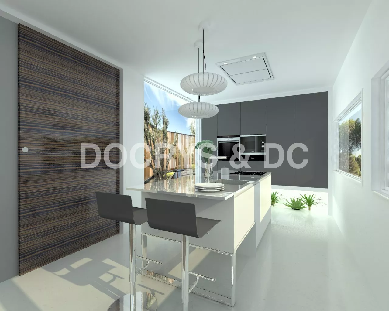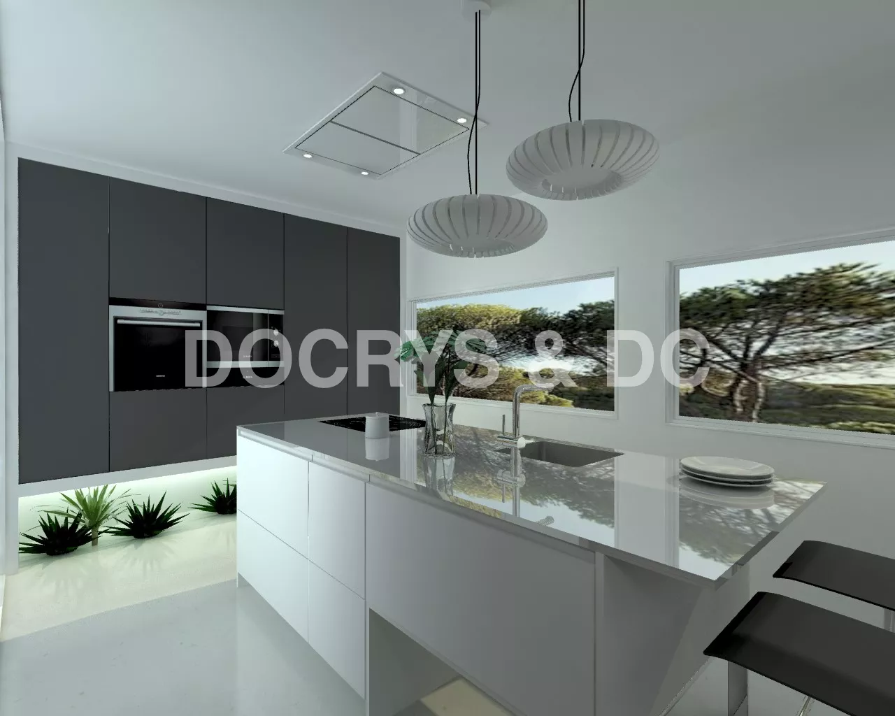 Cocina Santos: Plataforma D en bajos, Columnas aperura Push. Laminado Blanco Polar. Gris Antracita columnas.