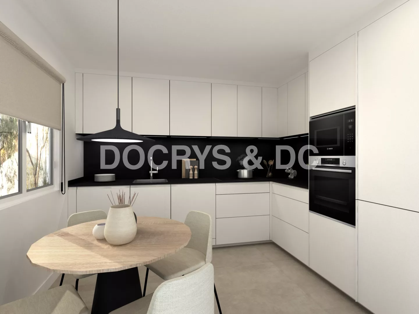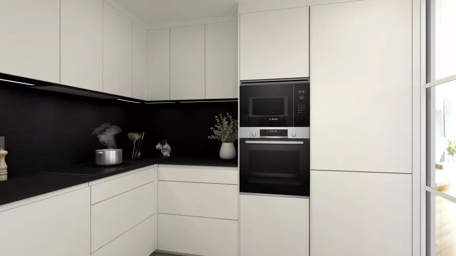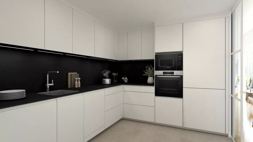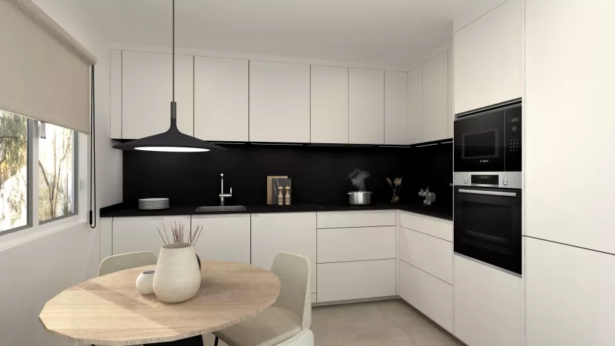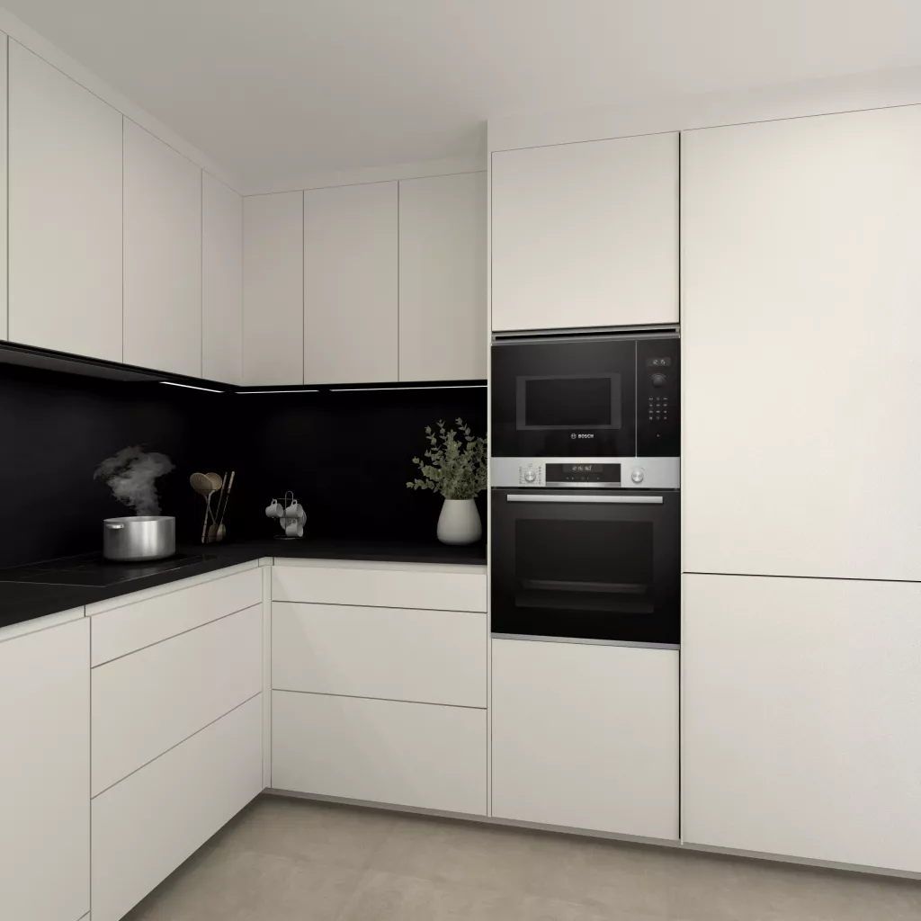 Nos encontramos ante una Cocina Santos en blanco y negro, esta mezcla de colores no solo aporta gran elegancia y estilo al espacio, sino que aporta mucha luminosidad al tener la mayoría de los elementos en blanco y tonos claros, los cuales aportan una gran amplitud en la cocina. Por otro lado tenemos la trasera y encimera Dekton en color DOMOOS, lo que aporta a la cocina esa sensación acogedora.