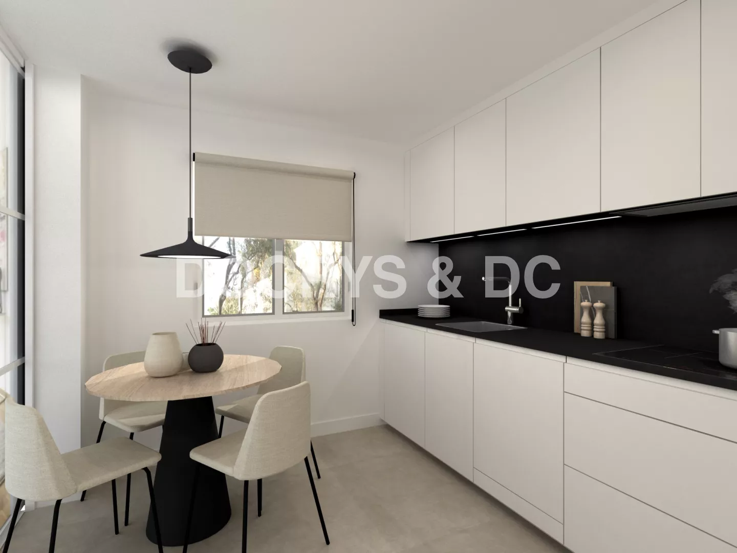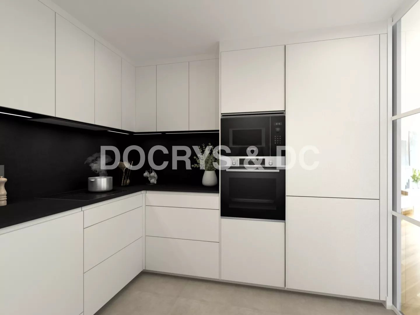 En toda la cocina se ha optado por tiradores push, los cuales dan una gran limpieza que combina con el efecto diáfano que crea el color blanco.