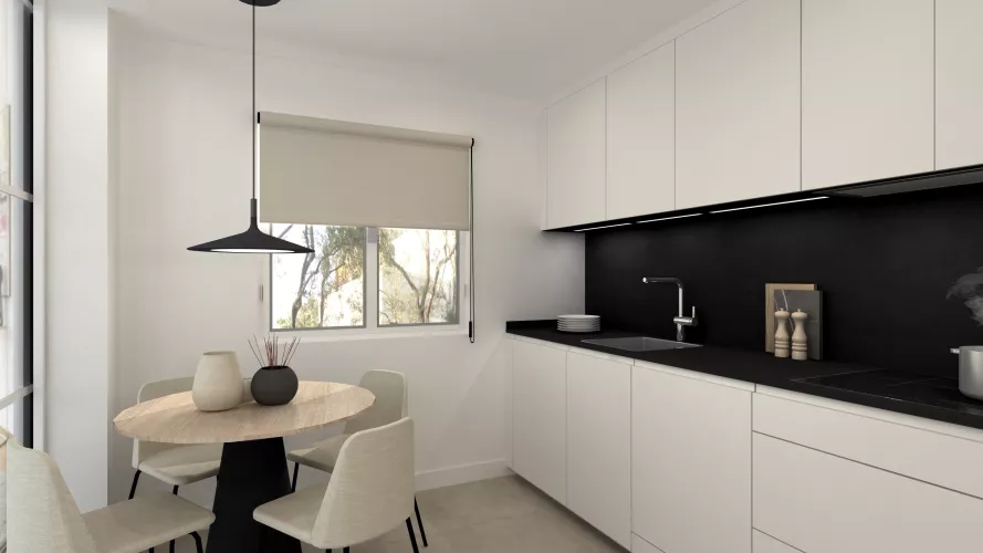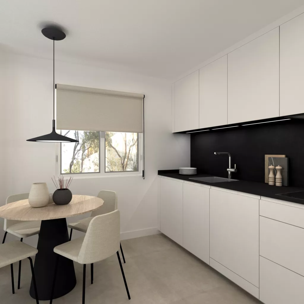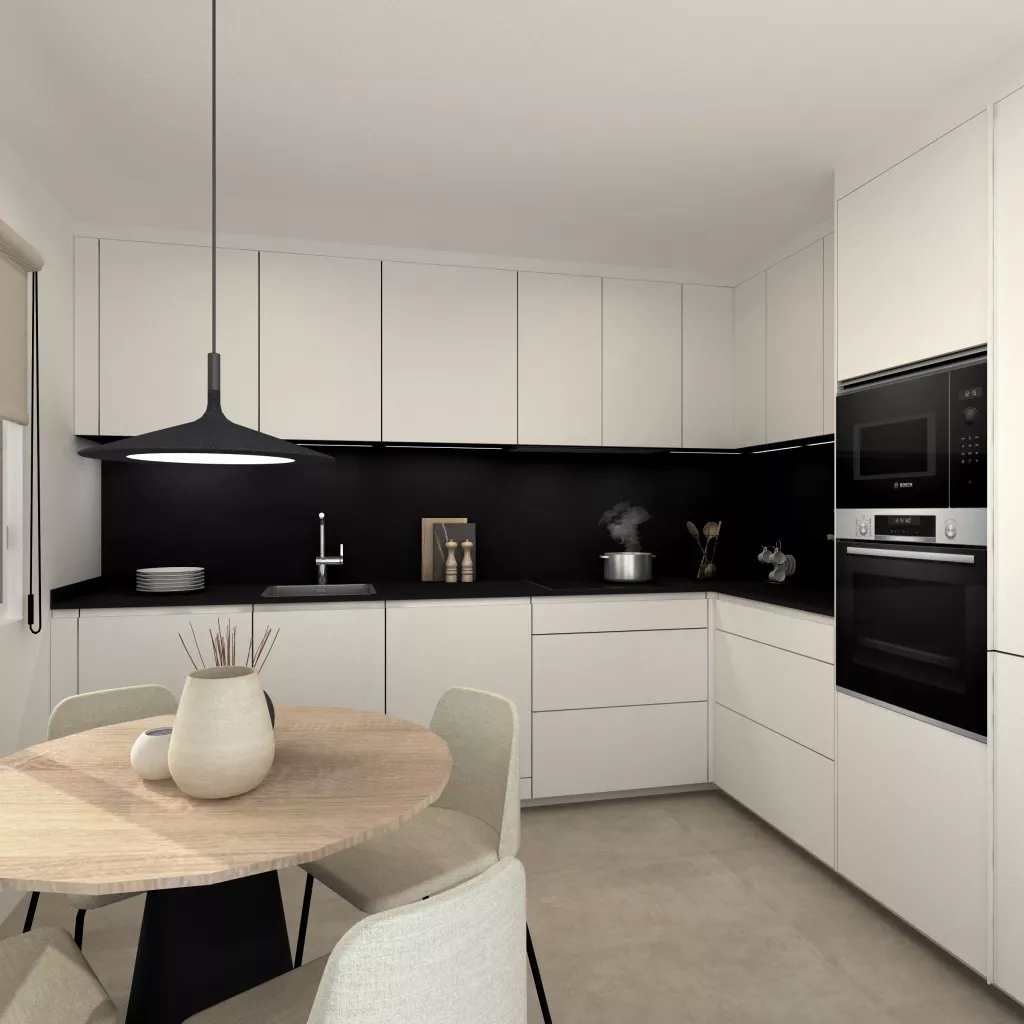 En cuanto a la iluminación observamos led integrado sobre encimera por todo el mueble para dar una luz focalizada en la zona de trabajo. Esta se armoniza con la iluminación que hay sobre la mesa, la cual es focalizada a la mesa, esta lámpara de colgar es en color negro haciendo juego con la encimera y trasera y creando esa correlación entre espacios.