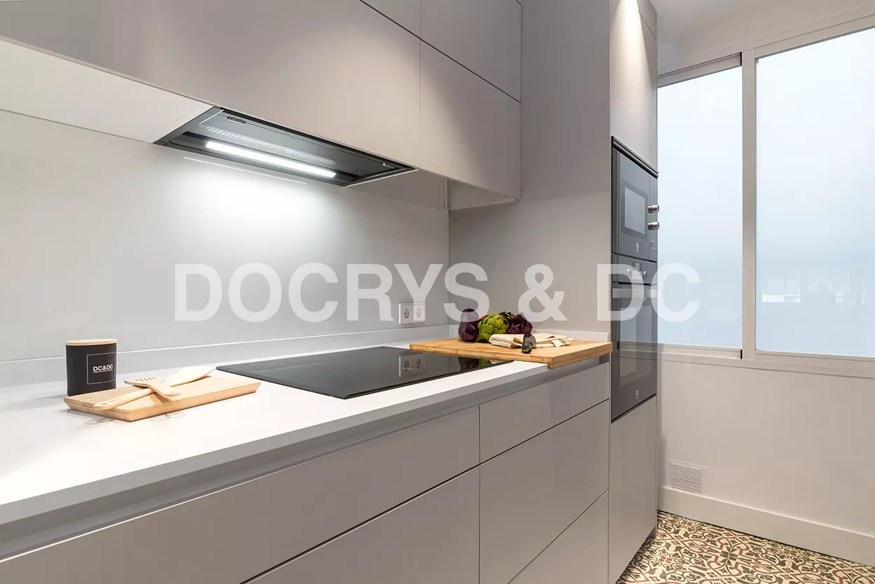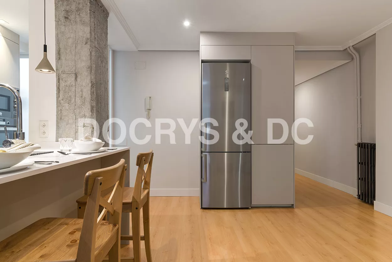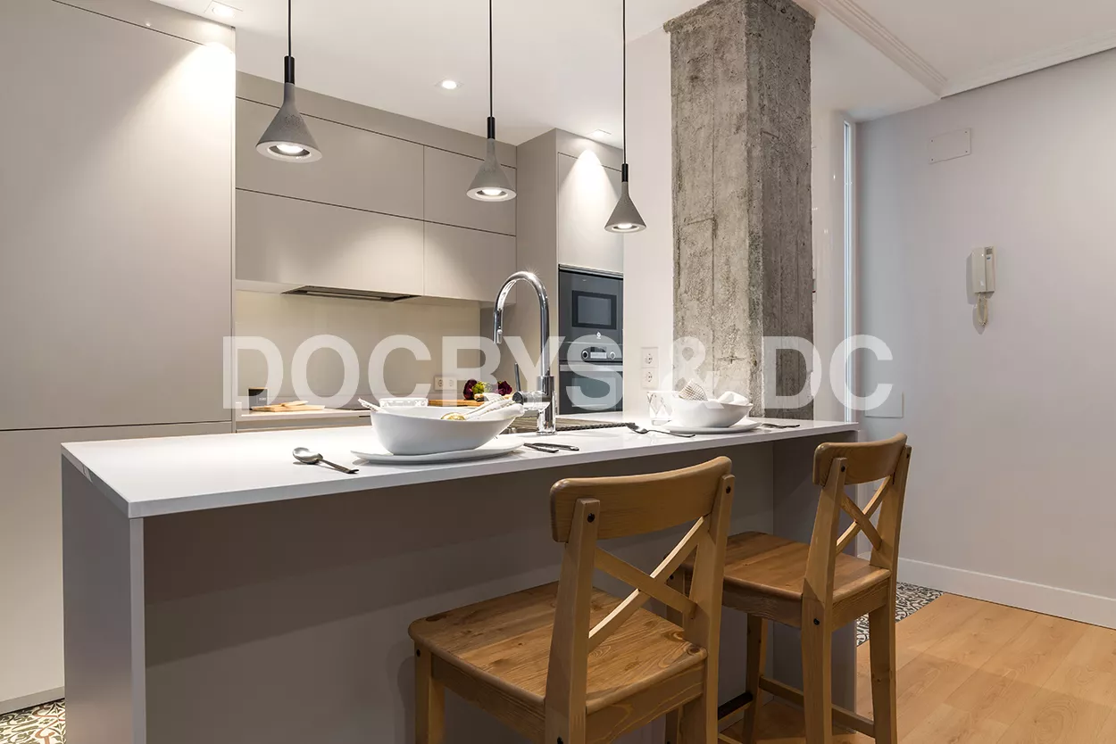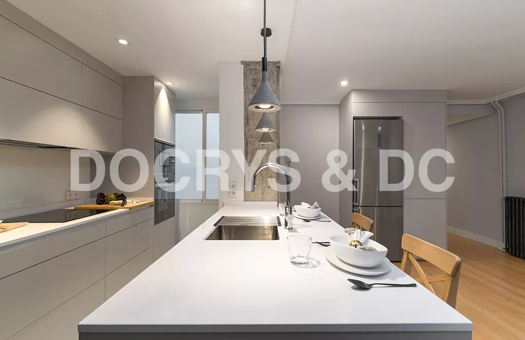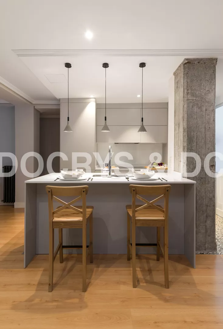En la península hemos dejado una pequeña barra para dos comensales. Los inquilinos compraron este piso en el centro de Madrid y decidieron hacer una reforma para habilitar la vivienda a su gusto y así, cubrir las necesidades en cuanto a su forma de vida. Una de las partes de la reforma, consistió en abrir la cocina al salón y comedor, consiguiendo un espacio mucho más amplio, cómodo y funcional, ya que para ellos, la zona de la cocina, salón y comedor es el corazón de la vivienda en el que pasan la mayor parte de horas del día.