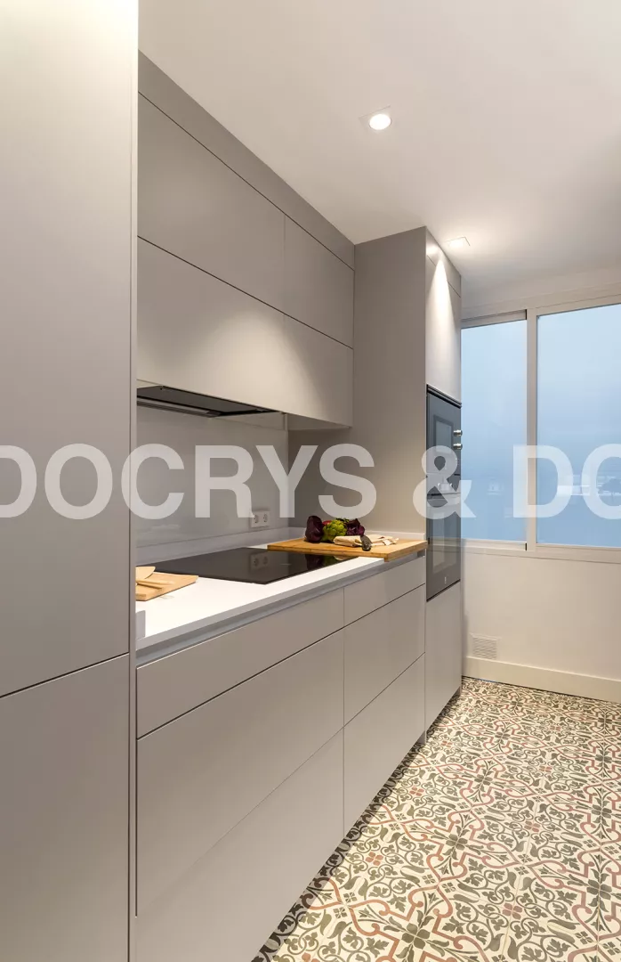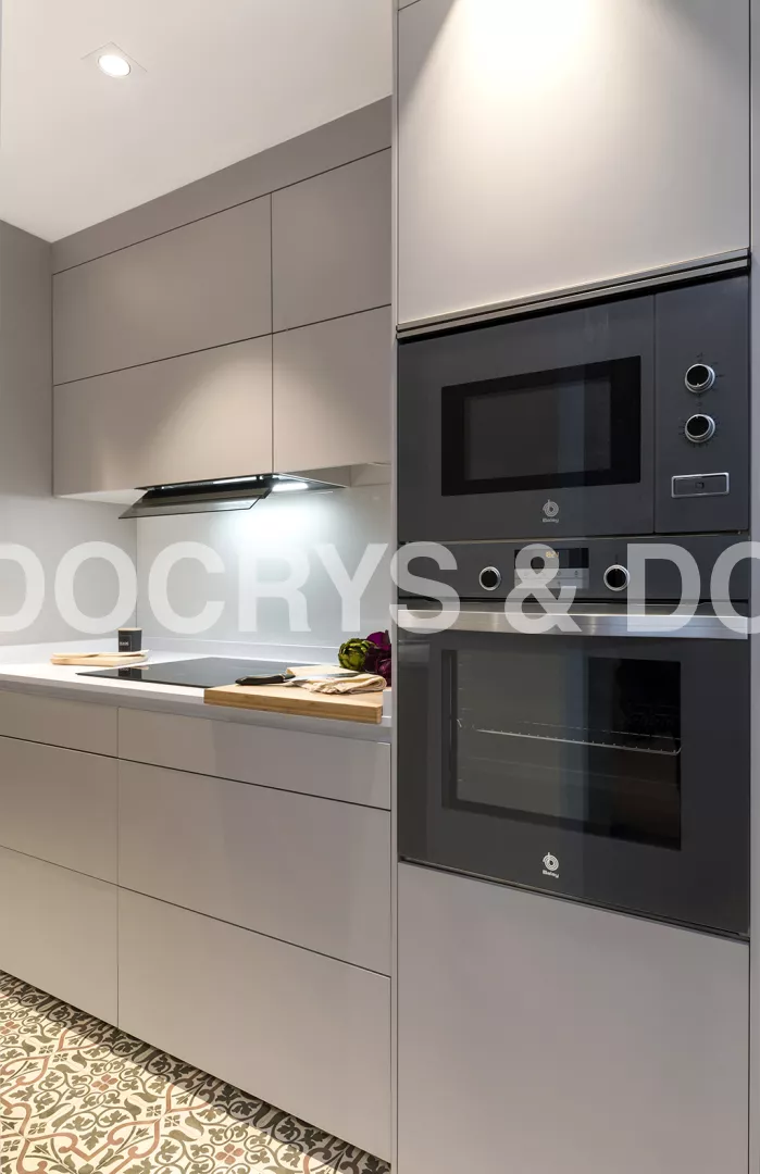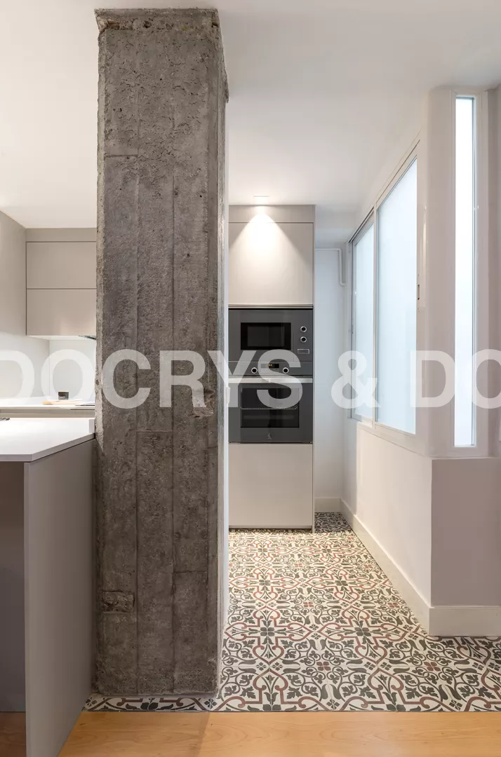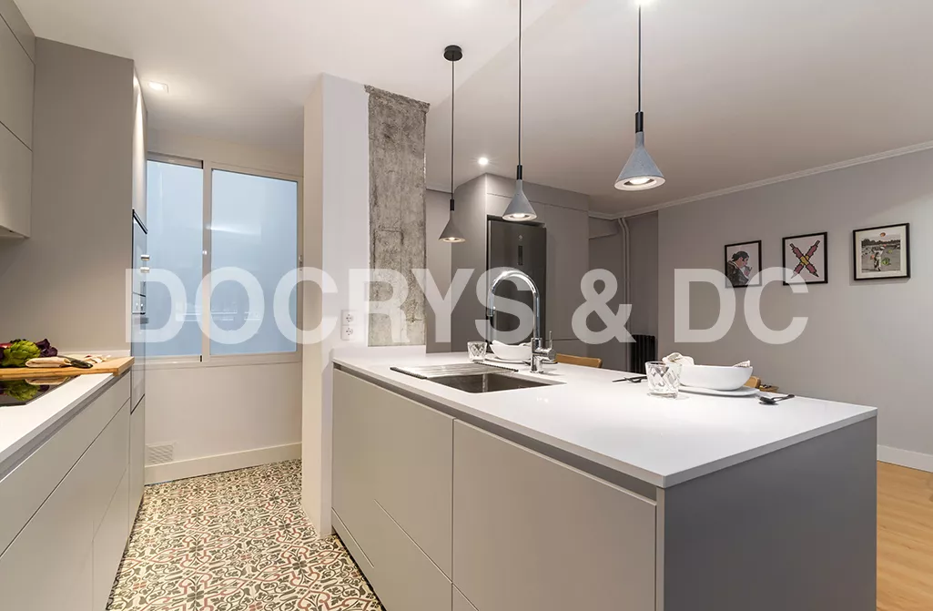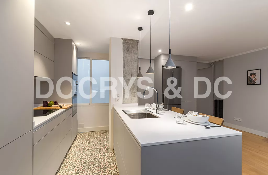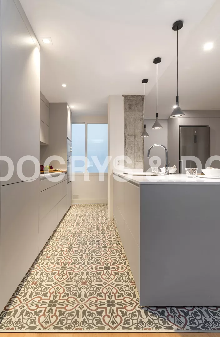 Durante la reforma, donde se quiso abrir la cocina al salón, es entonces, cuando apareció un viga de cemento que decidimos dejar intacta, para así dar un toque industrial al diseño de esta cocina, que complementamos con iluminación de Foscarini, con el modelo Aplomb, también en materiales con acabado cemento. Para contrarrestar los tonos neutros y grises, pusimos un suelo porcelánico, aportando calidez y un toque de color al espacio.