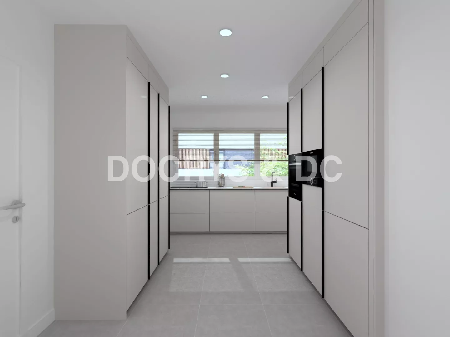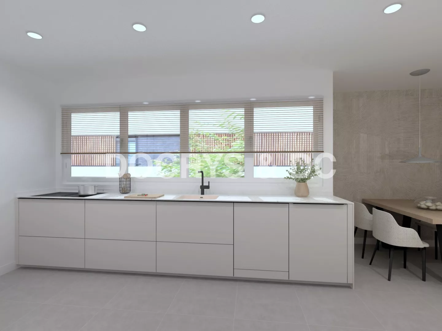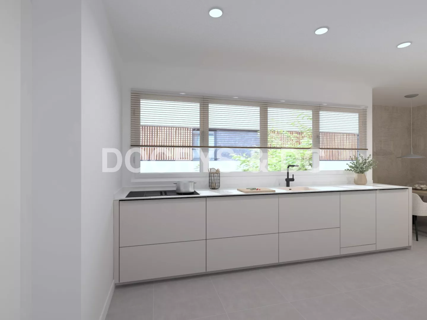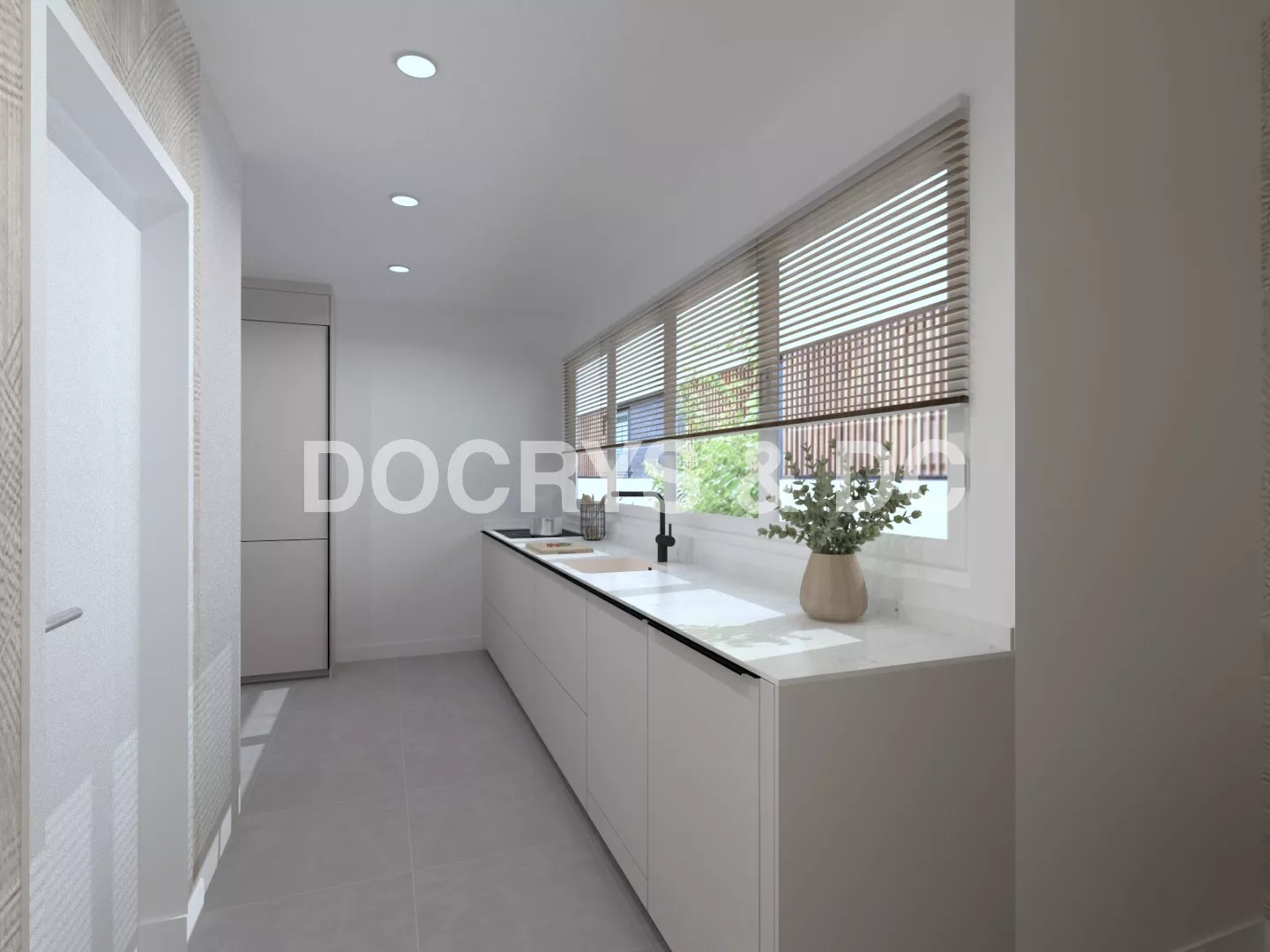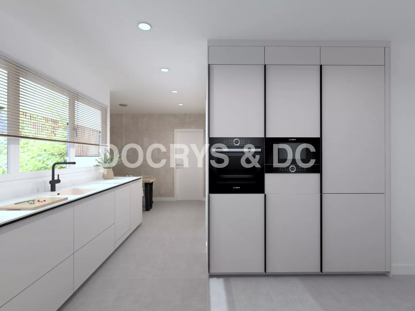 Está dividida por muebles bajos situados frente al ventanal, donde se encuentra el fregadero y la zona de fuego así como el lavavajillas y la lavadora, ambas paneladas y ocultas a la vista; y por otro lado tenemos dos torres de columnas, unas delante de las otras, ocupando toda la zona de almacenamiento, escobero, horno y microondas.