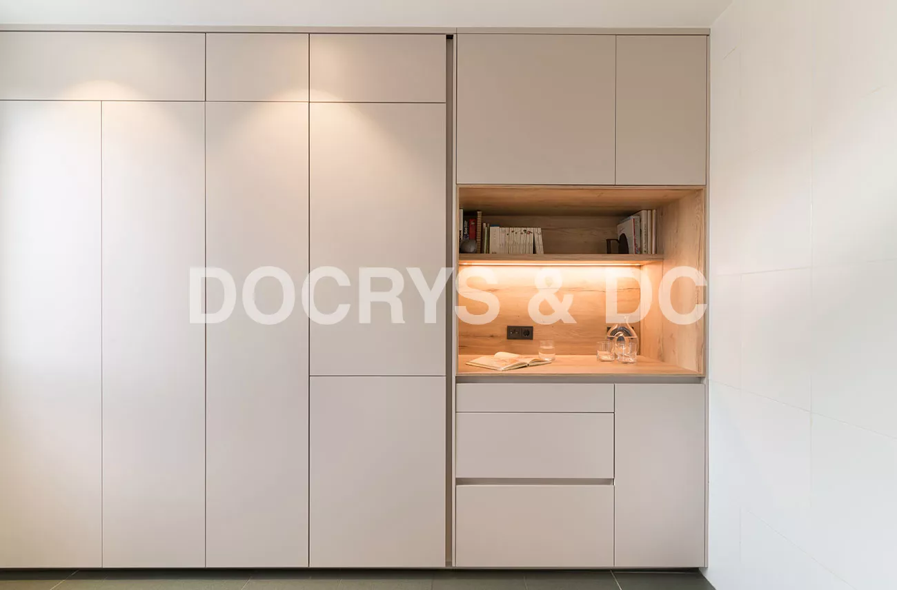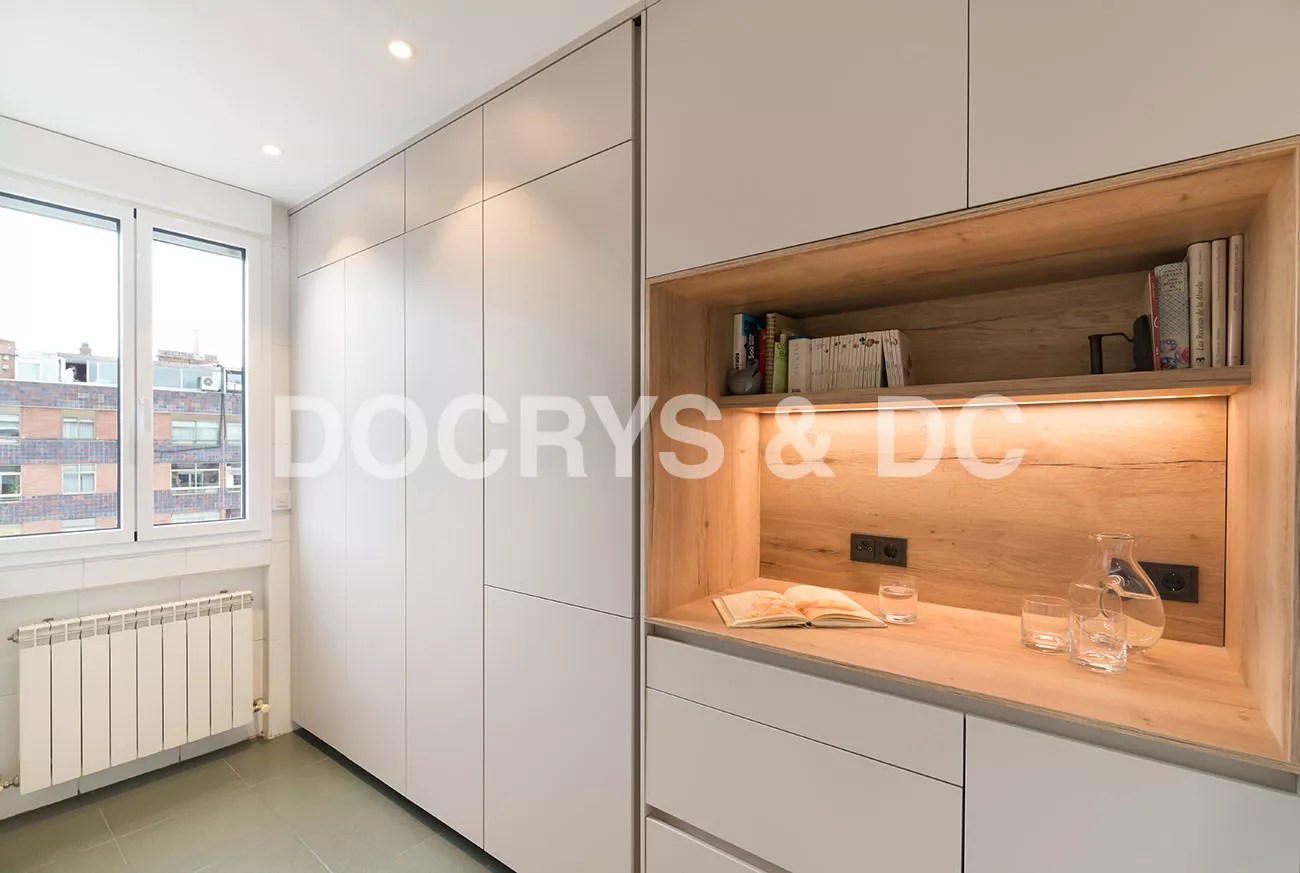 Del lado contrario a la zona de agua y fuego, nos encontramos con 3 columnas de almacenamiento más una cuarta que es el frigorífico combinado + congelador integrable y a su lado la hornacina, que es otro elemento importante en el diseño de una cocina, ya que proporciona espacio de almacenamiento adicional y contribuye al estilo general del ambiente. Optar por una hornacina color roble rústico sincro es una excelente manera de agregar calidez y carácter a la cocina.