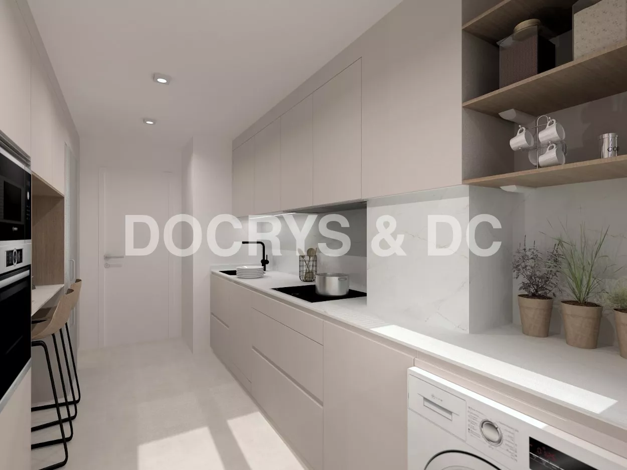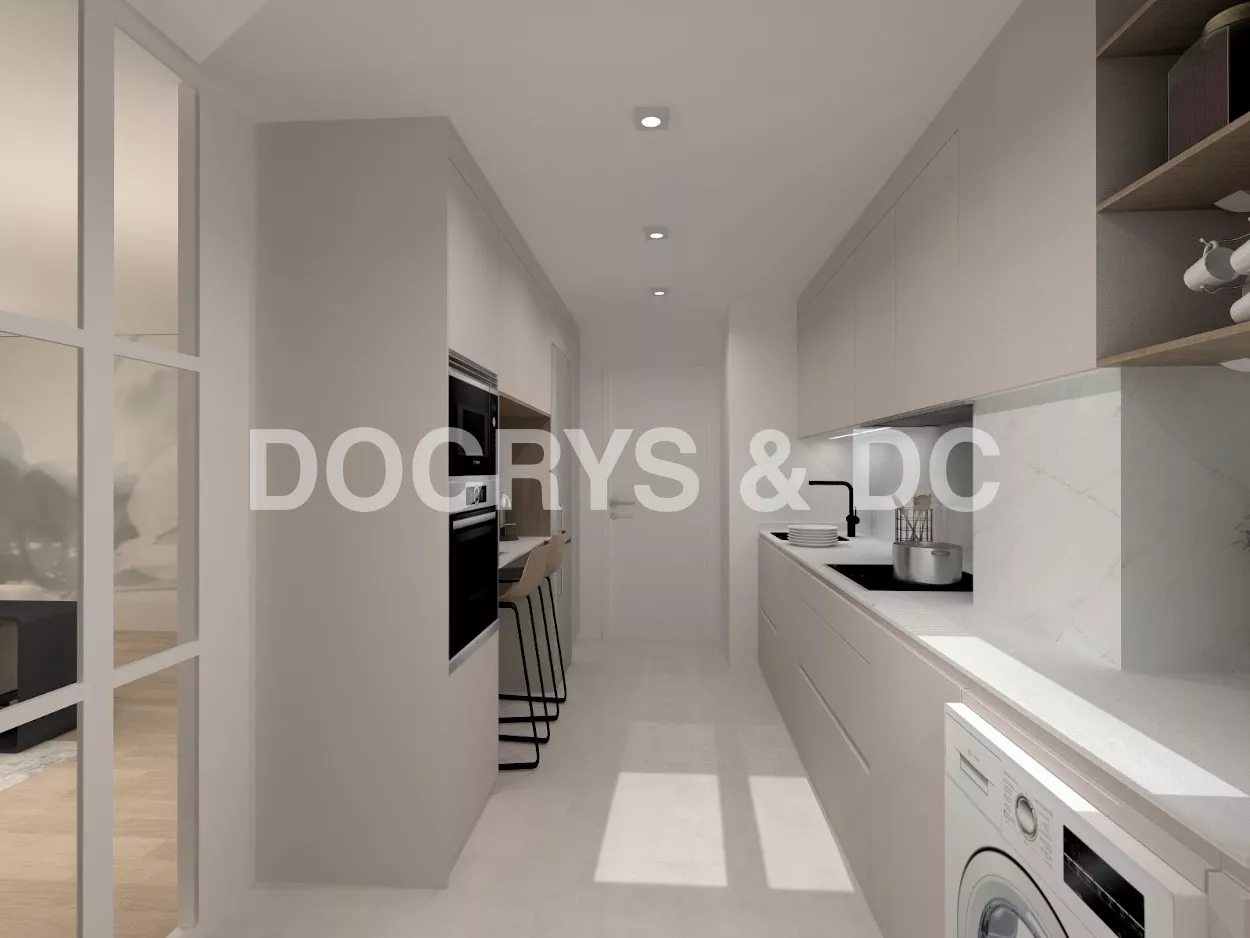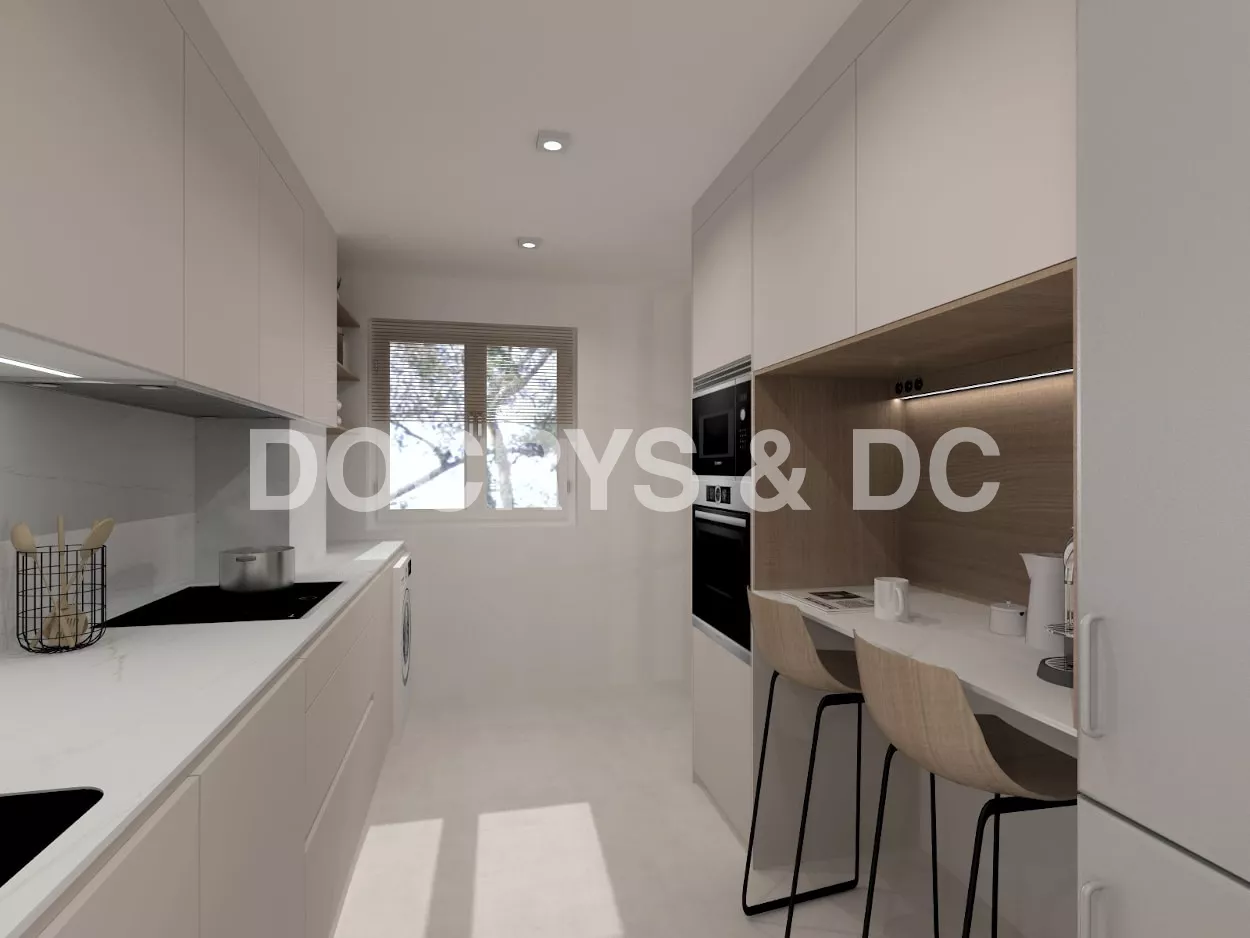 El otro frente en paralelo se compone por columnas donde se integran los grandes electrodomésticos y un mueble desayunador con barra para dos personas.