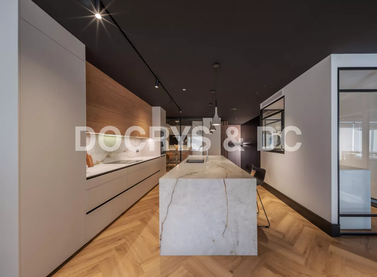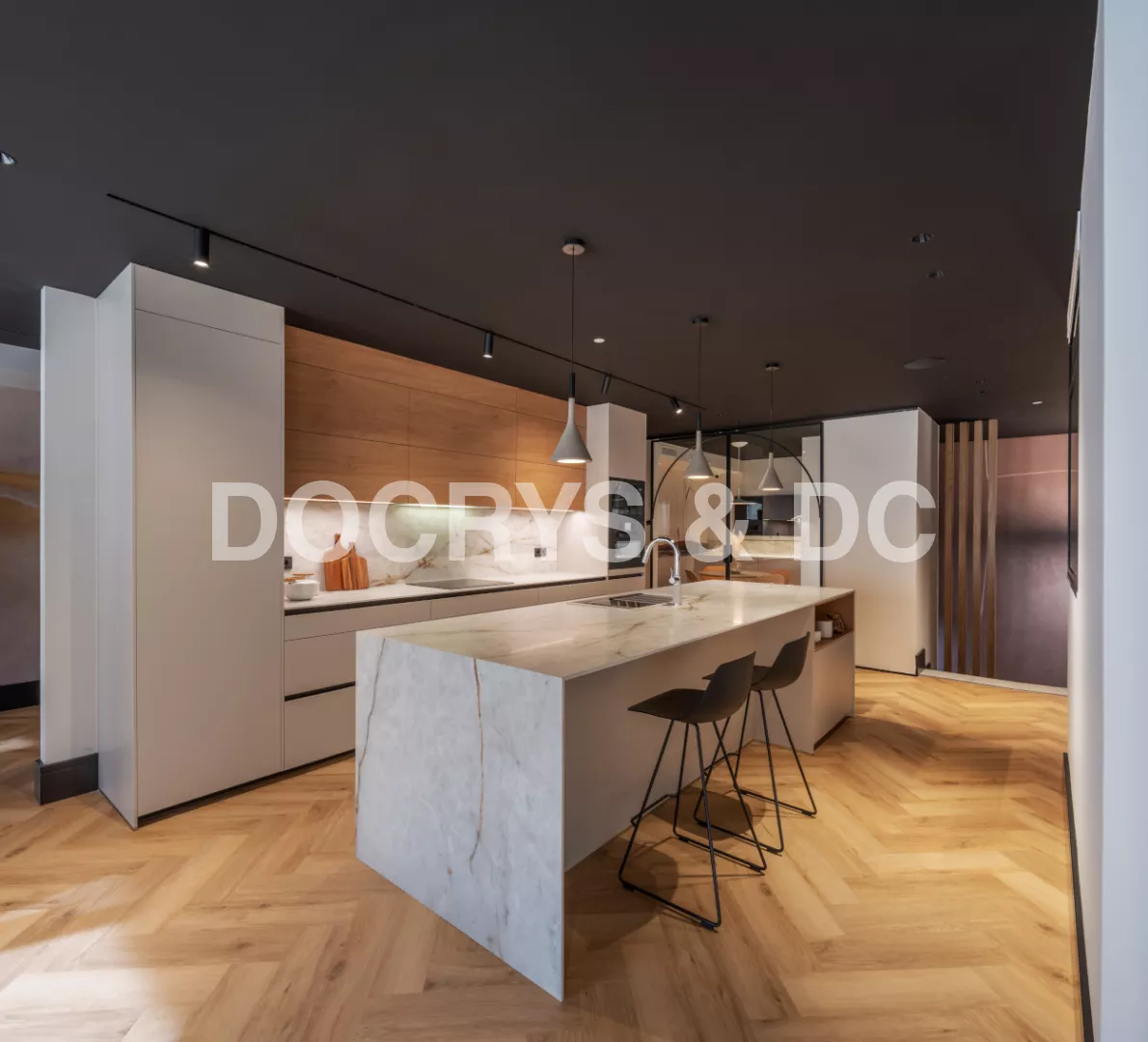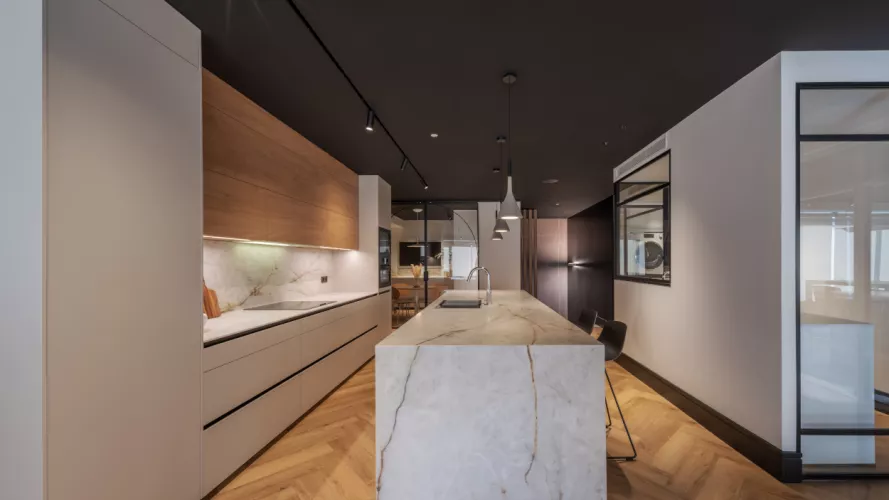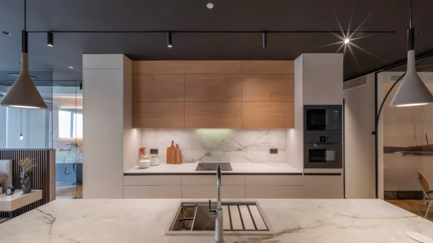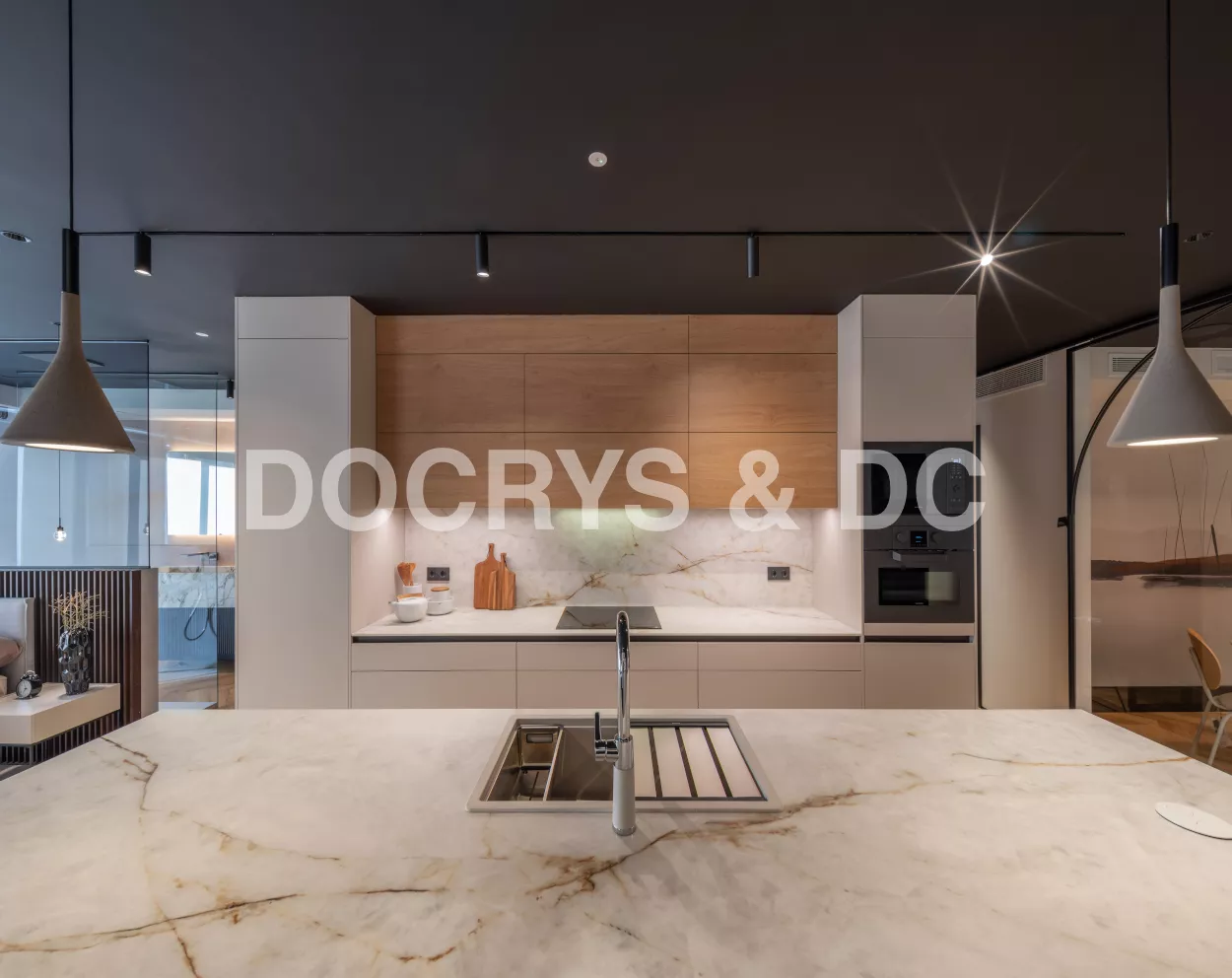 Enfrente encontramos su impresionante isla, la cual es el punto de atracción de todas las miradas, donde está situada la zona de aguas y tenemos una zona de trabajo muy amplia, convirtiéndola en el sitio de reuniones familiar perfecto.