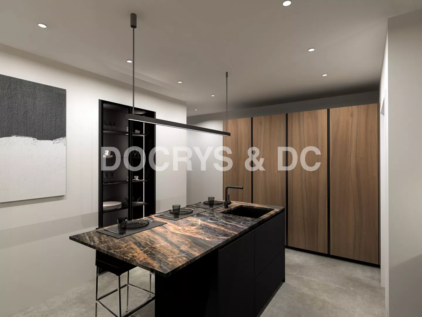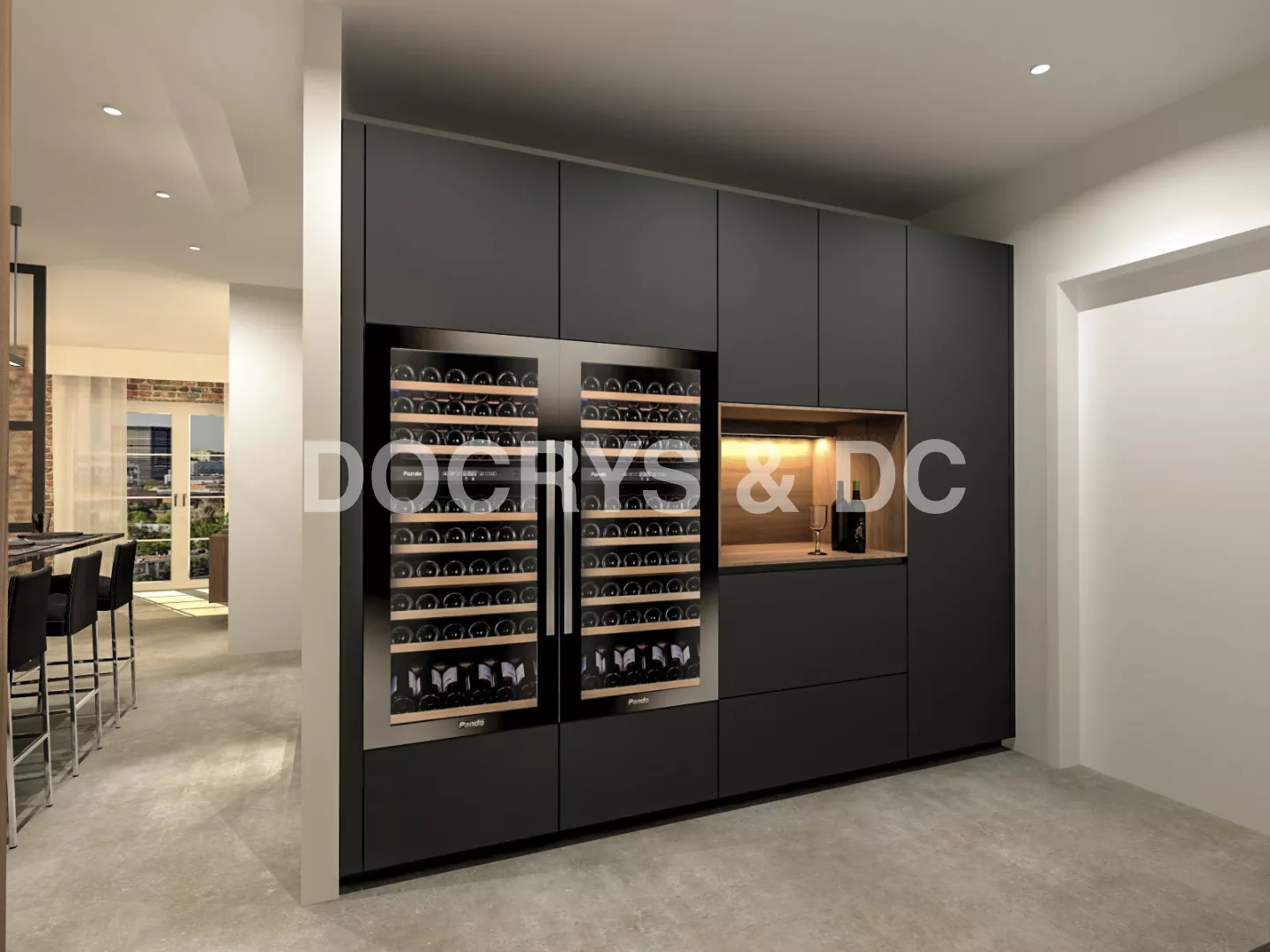Este diseño de Cocina Santos cuenta con una gran isla central, un frente con cuatro columnas, un frente con muebles bajos , un frente con columnas y vinoteca y una vitrina Santos.