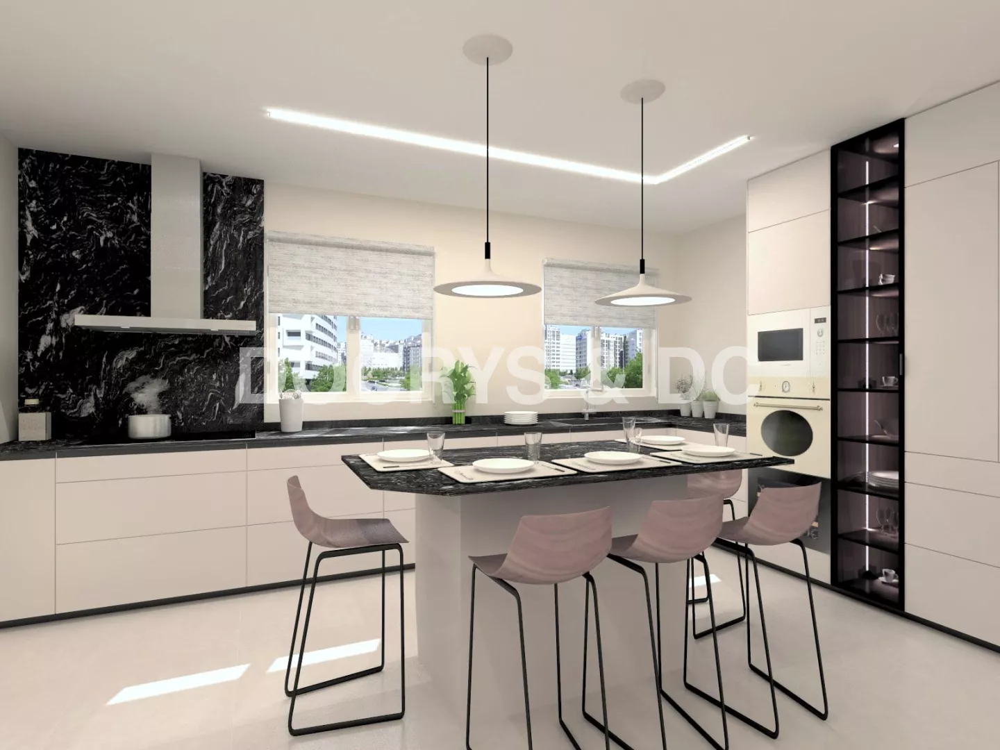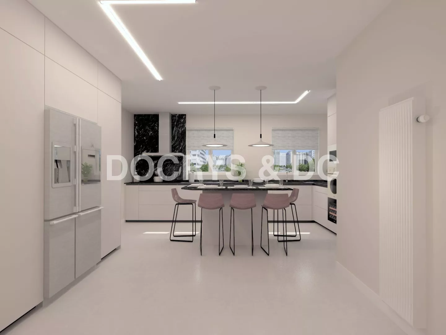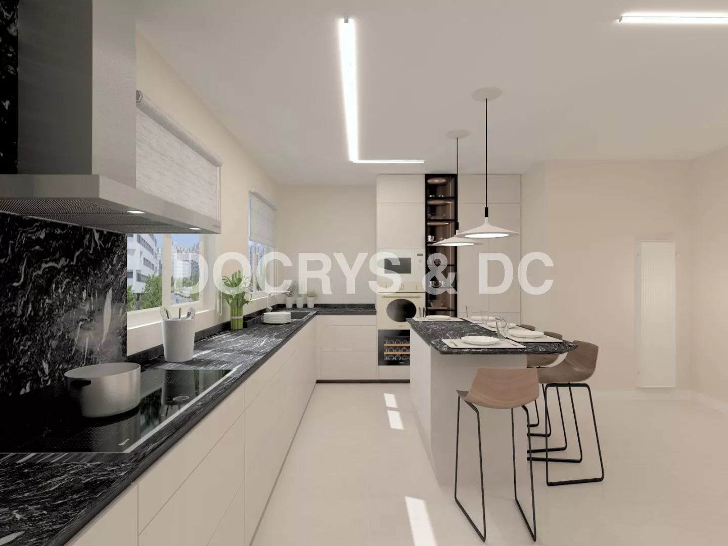 La isla está iluminada con el modelo Aplomb de Foscarini.