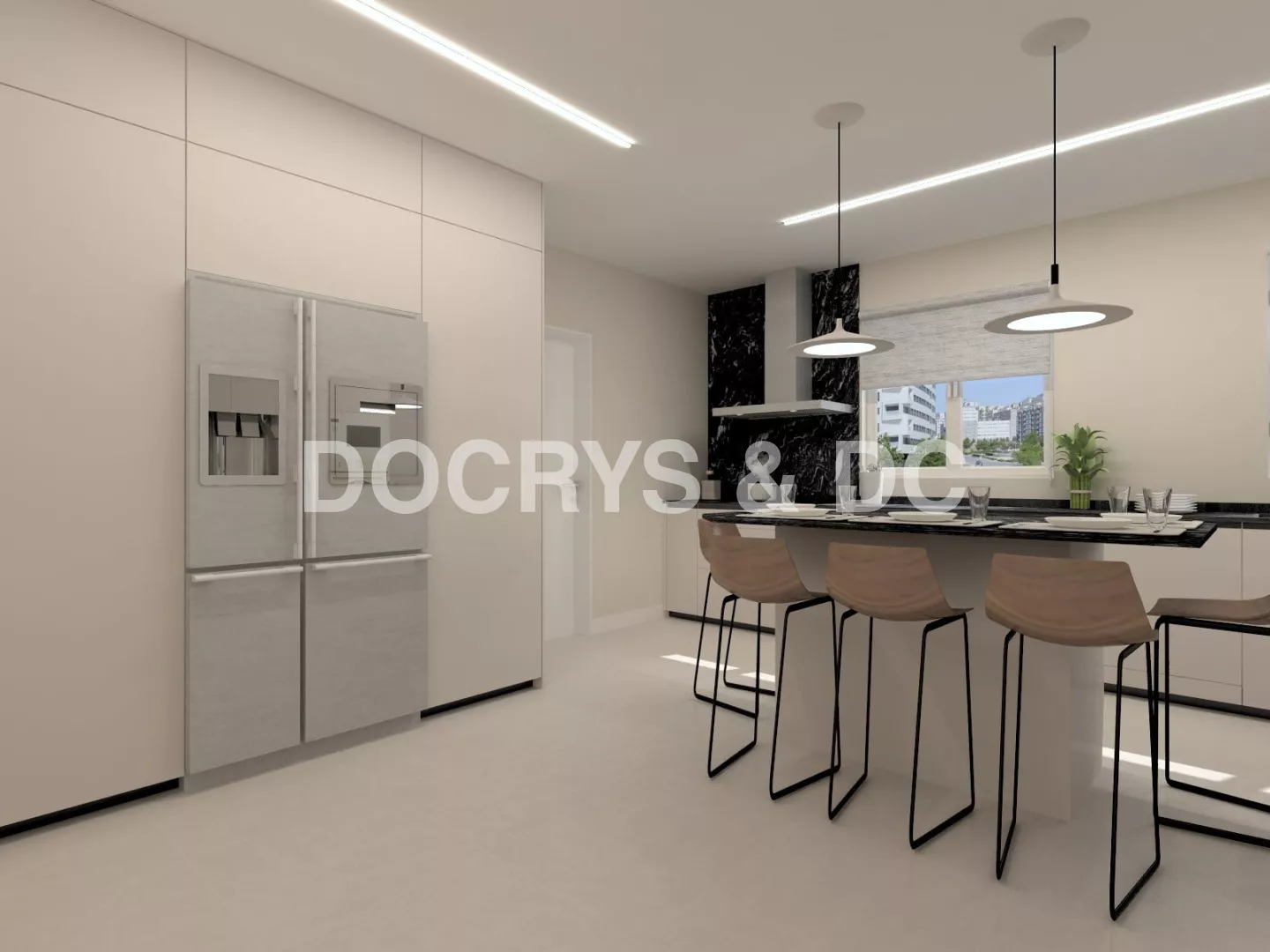 La distribución de esta cocina moderna consiste en tres frentes en forma de U con muebles bajos y columnas, donde se ubica la zona de aguas, la zona de cocción y los grandes electrodomésticos, además de un isla central, protagonista auténtica de la cocina.