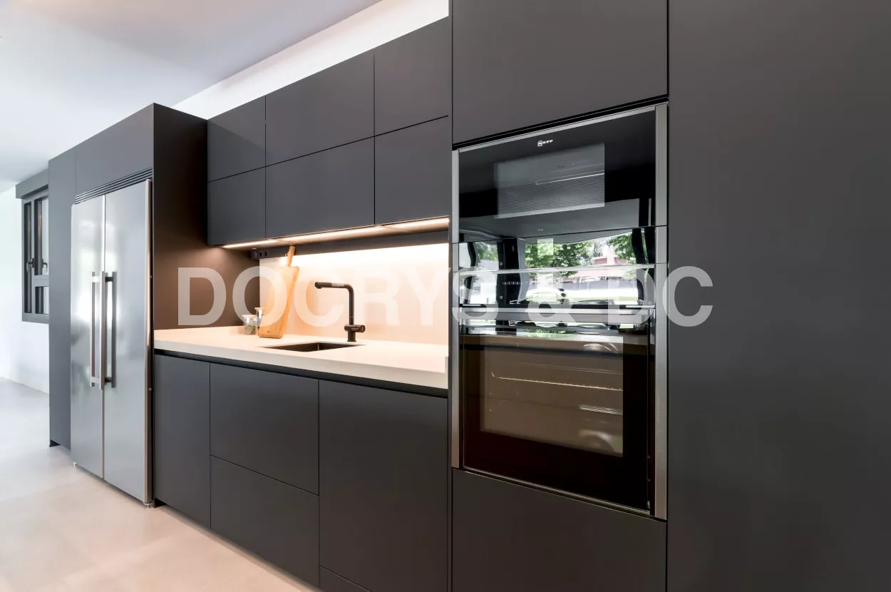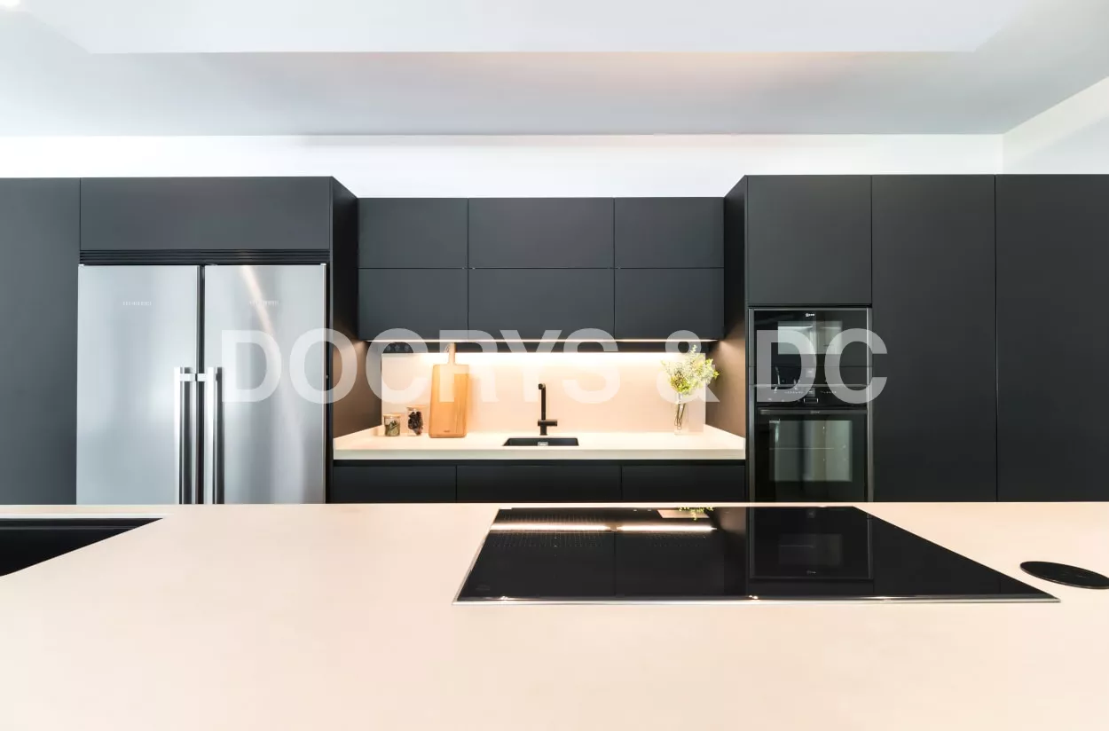 Cocinas Santos en gris arena y negro seda con material estratificado y laminado seda antihuellas, modelo fine, plataforma A y E.