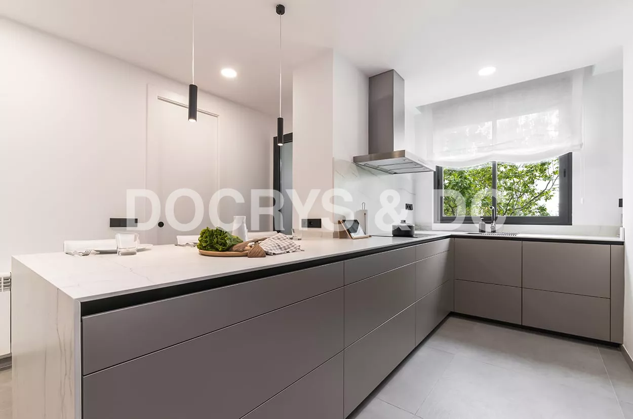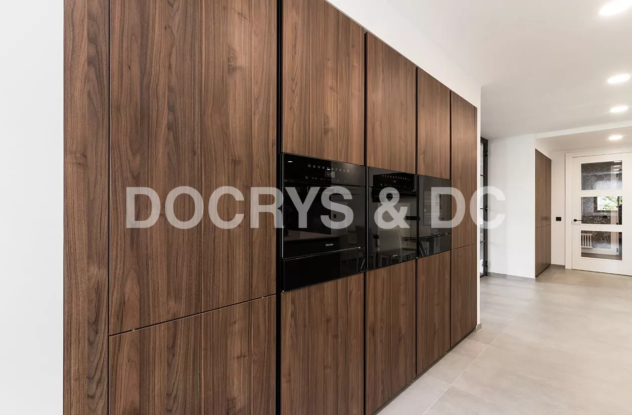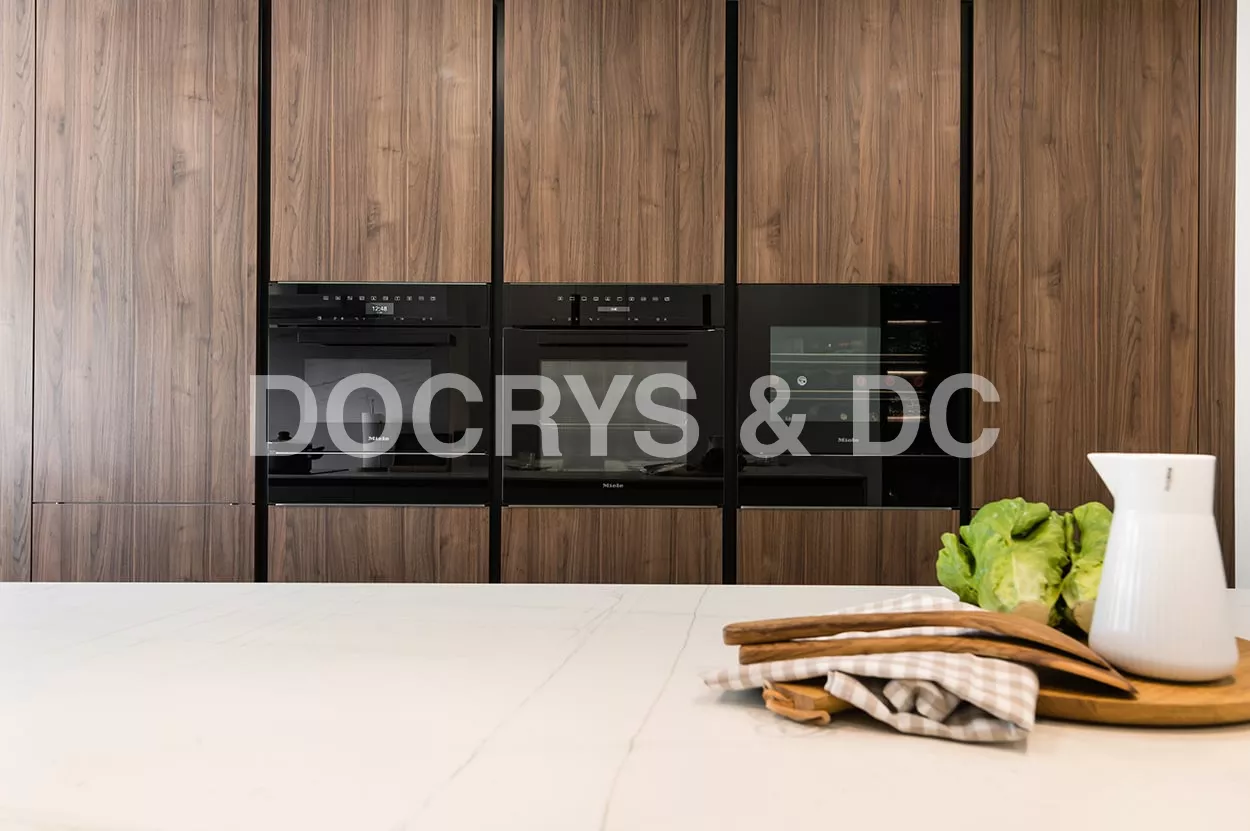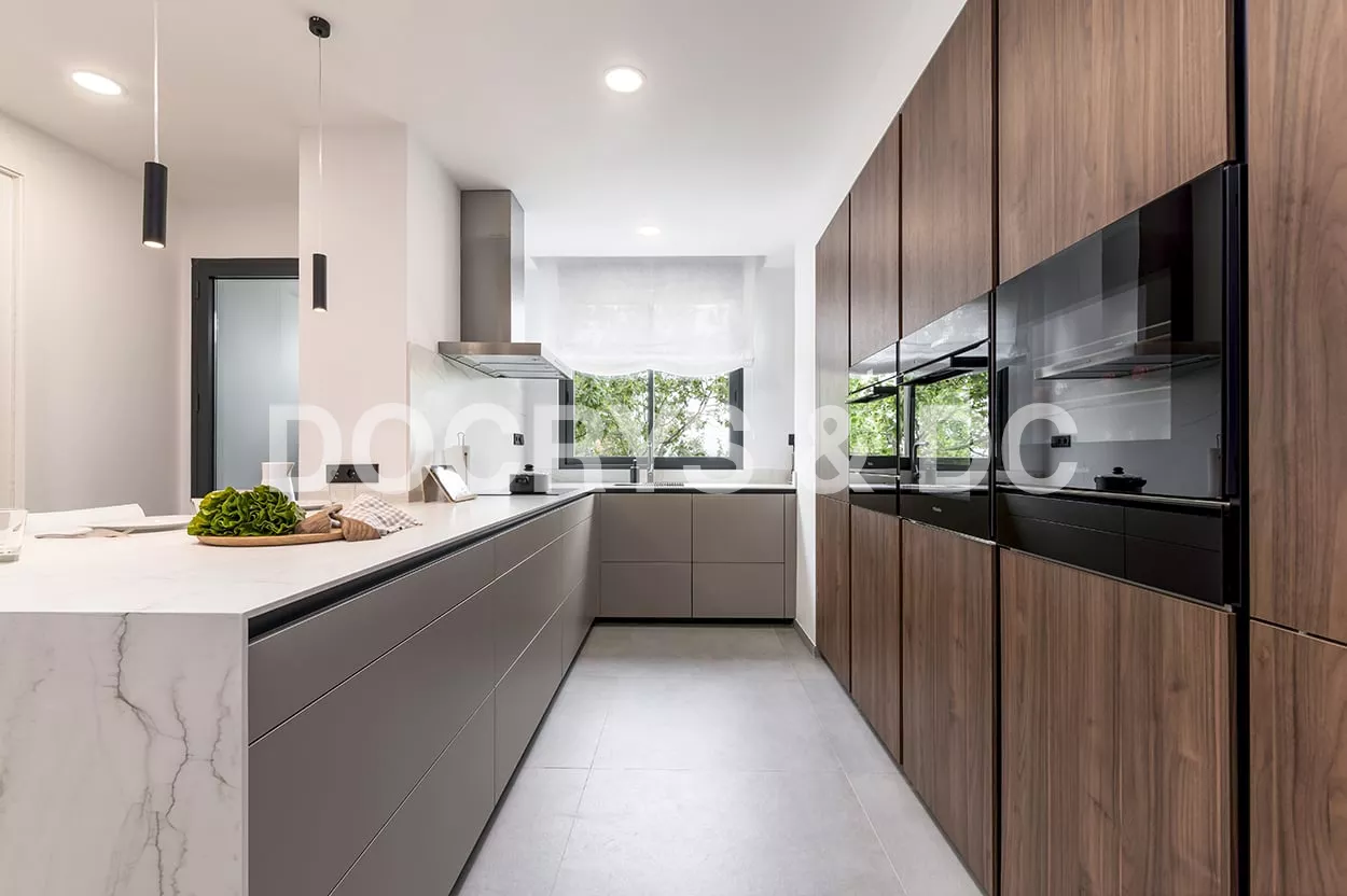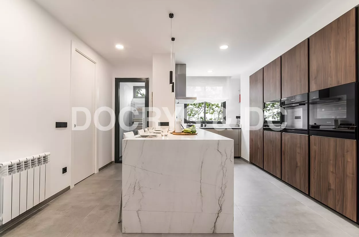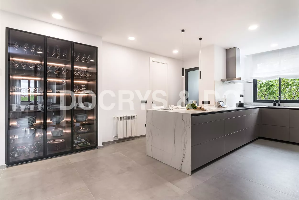 Esta cocina está separada del salón con un cerramiento acristalado, el cual hace que no se pierda la conexión visual con ambos espacios y deja entrar una gran luminosidad.